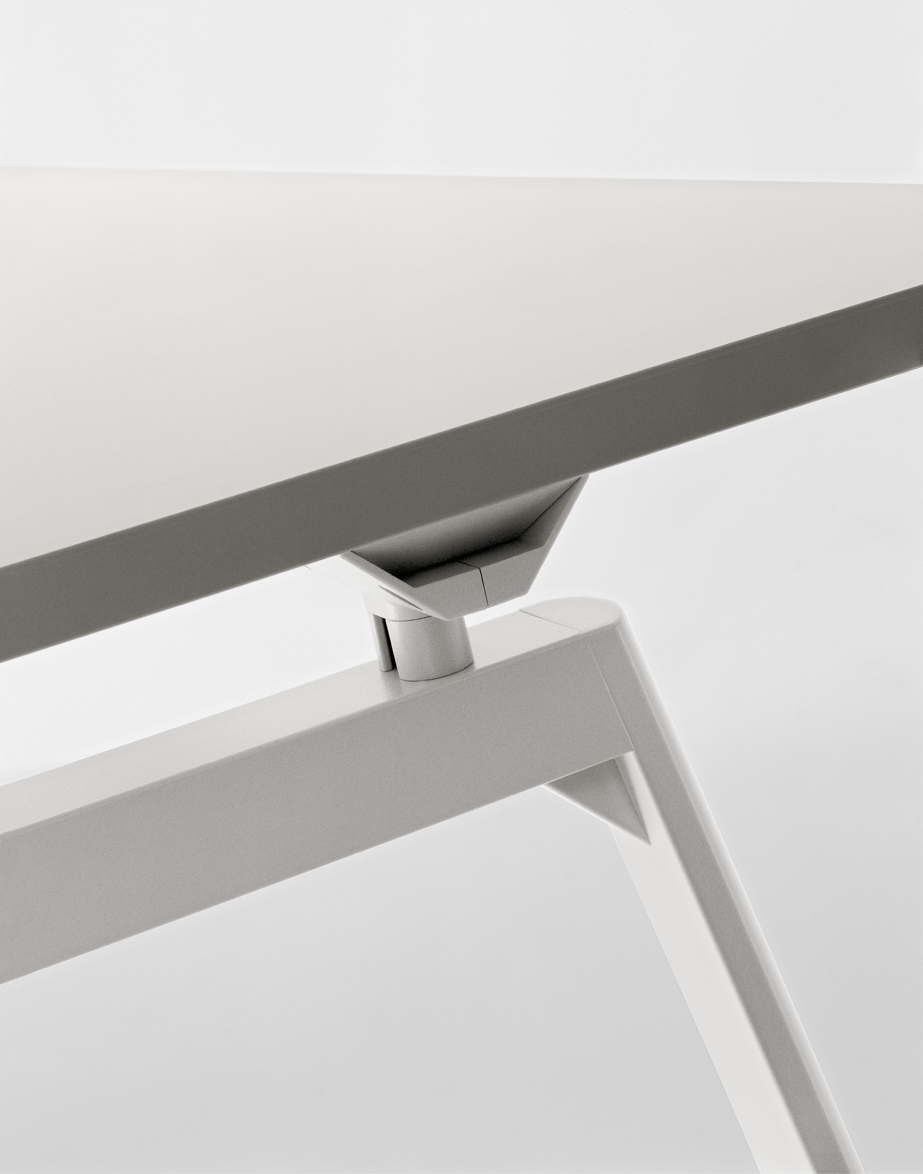 The metal support structure of MDL System consists of tracks below the worktop and contoured legs in extruded aluminium, painted platinum grey or with a polished aluminium finish. A special fastening system allows the various elements to be positioned as required.
