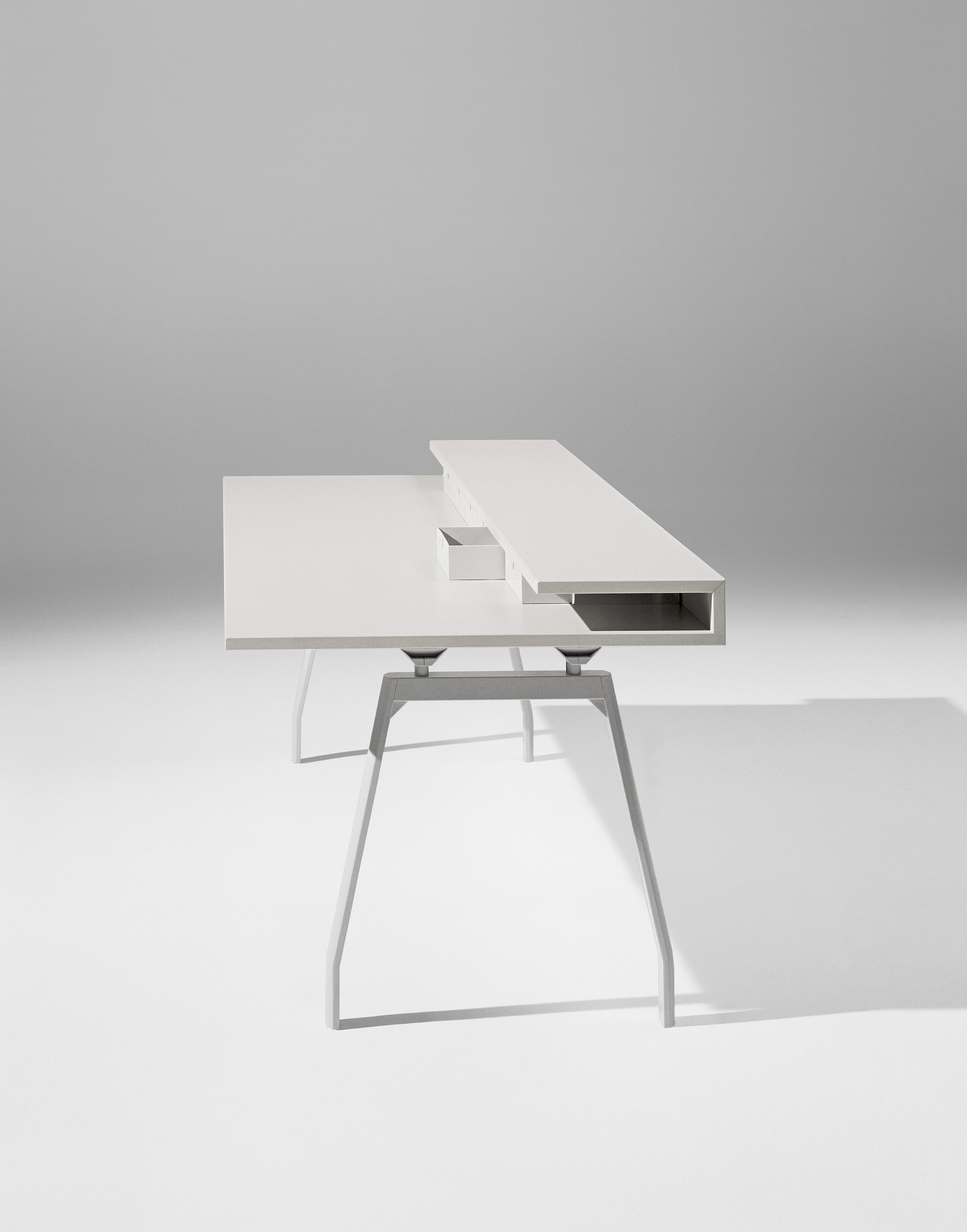 The Full version of the workstations features an unusual C-shaped profile that creates an original and practical shelf as well as space for numerous small drawers and optional power and data connections, while the Basic plus version features an L-shaped shelf and a dividing panel which can be positioned to suit specific requirements.