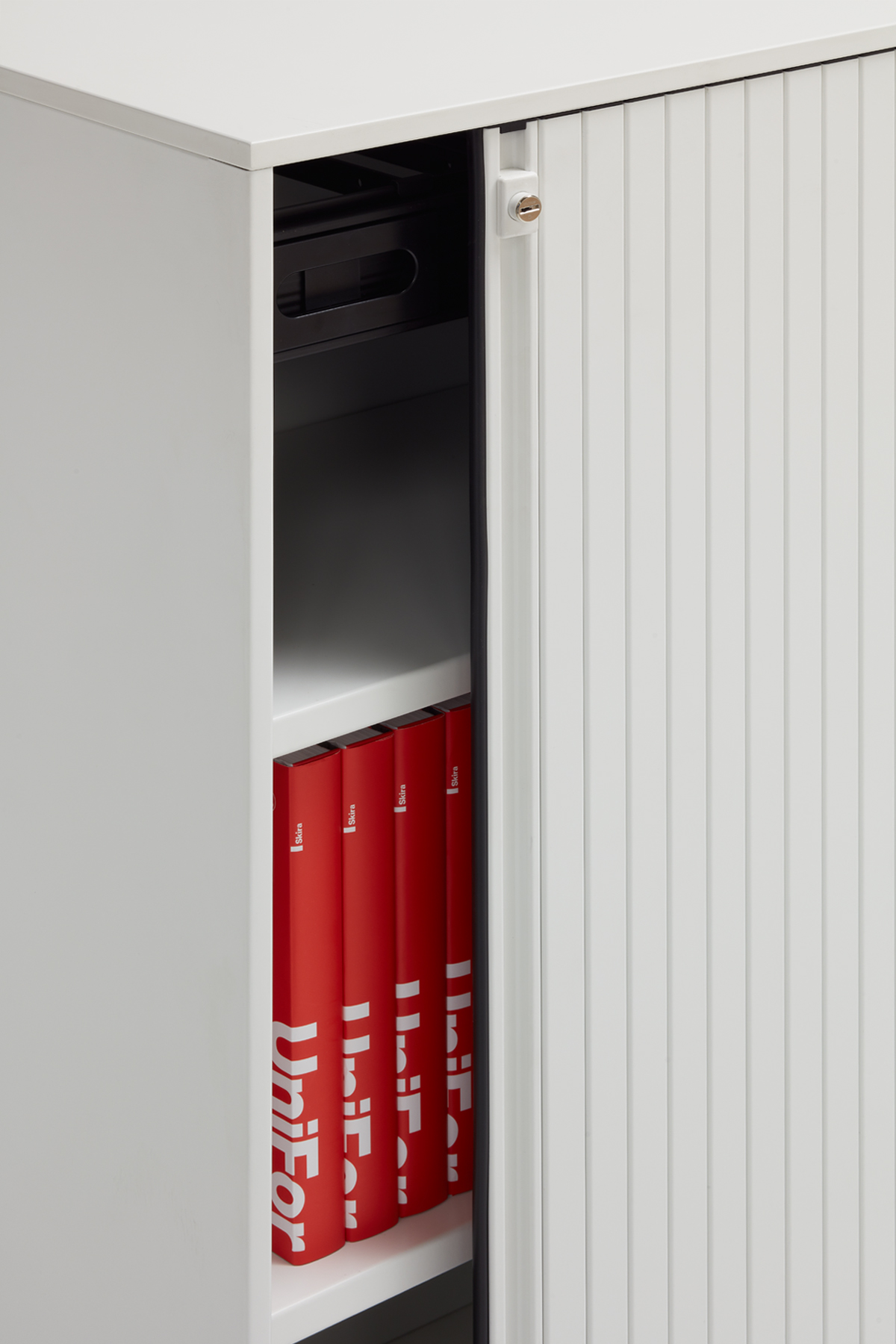 The pieces feature laminated abutments, a base, a cover and a rear panel in metal with painted borders in ABS. The wrap-around roll-top panel, available in the horizontal and vertical settings, is the distinctive feature of this piece, which can be provided in a range of different sizes. The shelves are made from sheet metal and their height can be adjusted. The attention to detail, practicality and rational feel of the MT series mean it can be combined with all UniFor workstations.