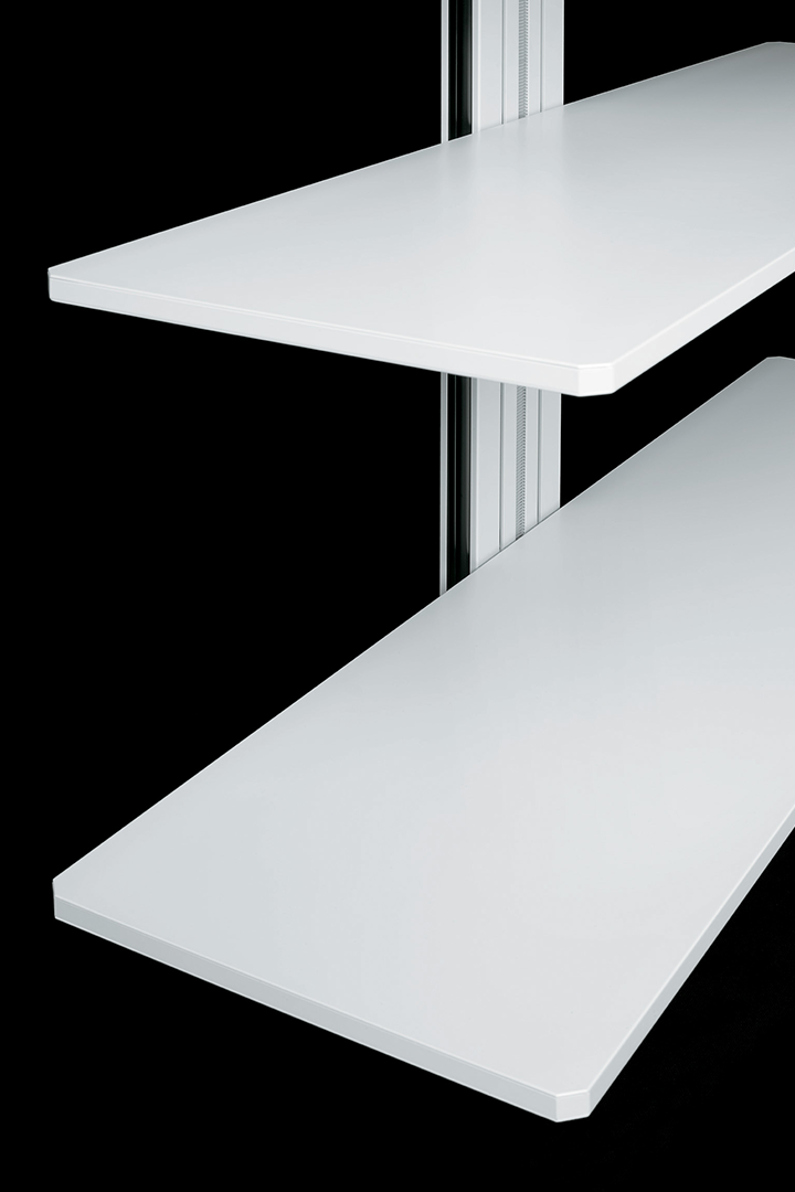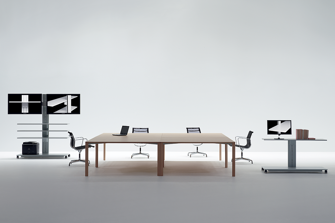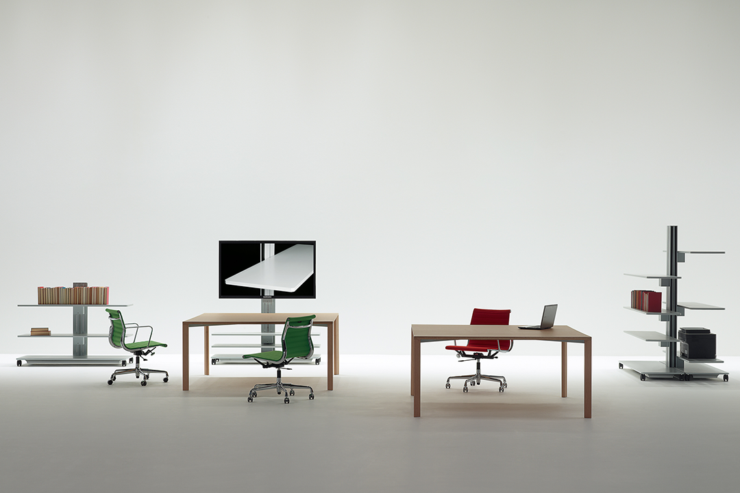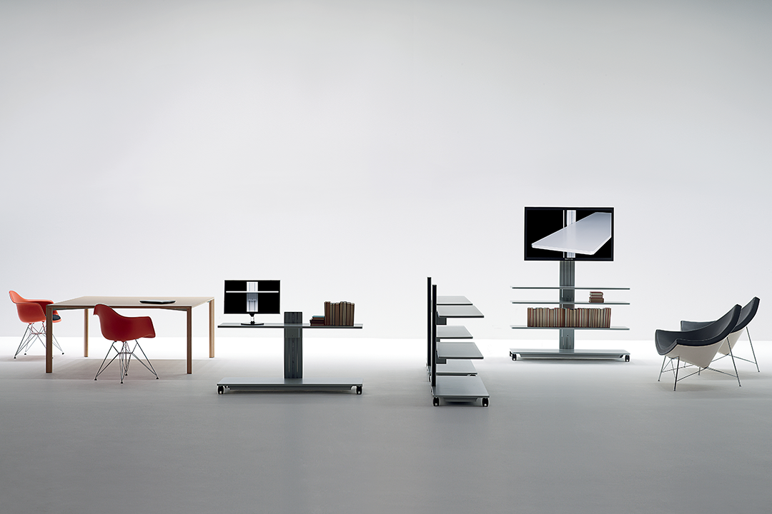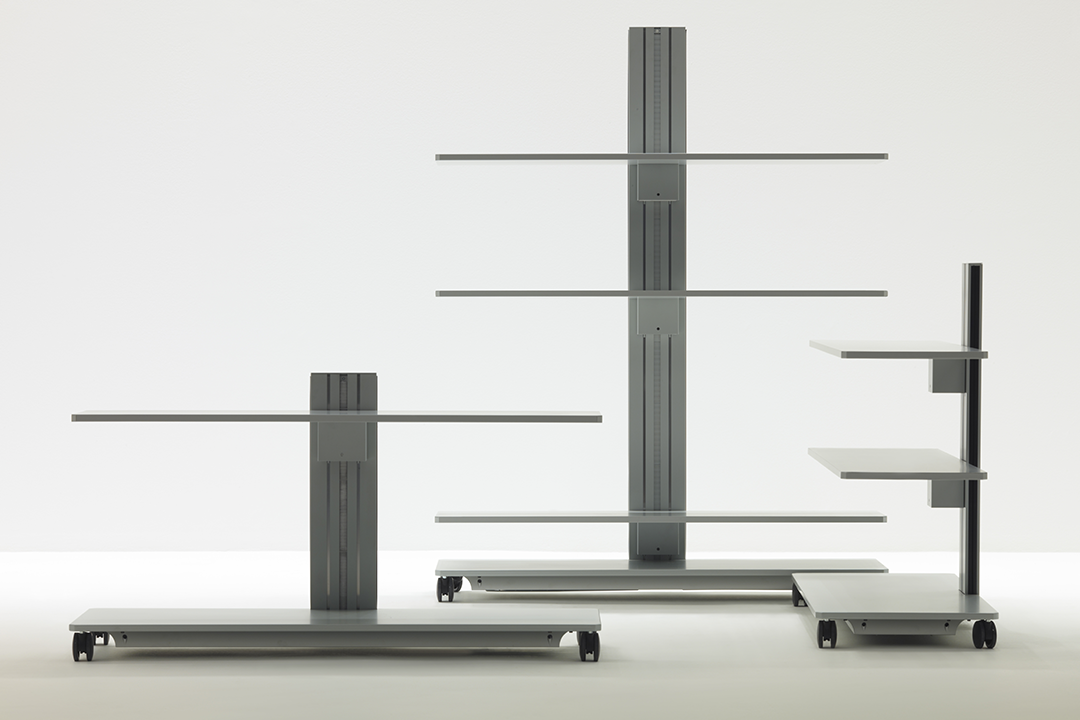Flexible, functional and enhanced by minimalist forms, these accessory elements are designed to meet the needs of a work environment in constant evolution, where task and relational activities coexist. Available in three heights, the trolleys consist of: a solid metal support structure that conceals simple adjustment mechanisms; a base with compartment containing the power and data outlets, easily accessible by sliding the bottom shelf to one side; shelving that can be raised and lowered even with equipment already in place; special coaxial wheels that ensure high stability, whether the trolley is stationary or in motion.