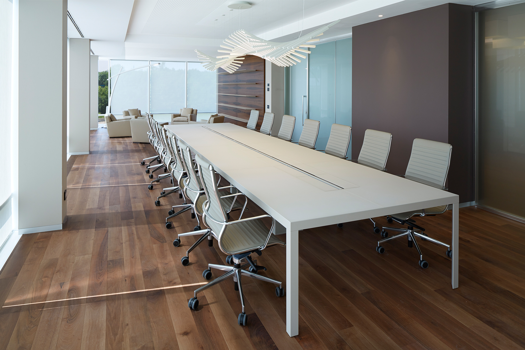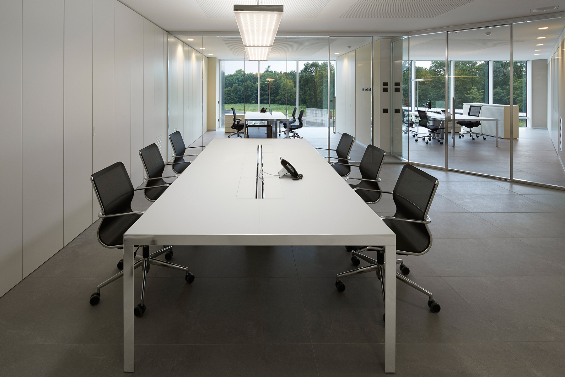 Open-space aggregate work stations, equipped to satisfy the specific functional requirements of task areas, executive facilities, meeting rooms and libraries. The system is articulated in three types of table: the conference table, with a continuous, uninterrupted surface, the task table, with a translucent illuminated divider panel, and the library table, with a lamp for direct lighting on the tabletop. Each table type is configured linearly based on three basic modules, in groups of two, four, six or eight workstations. The line is completed by an individual desk, available in three different sizes.