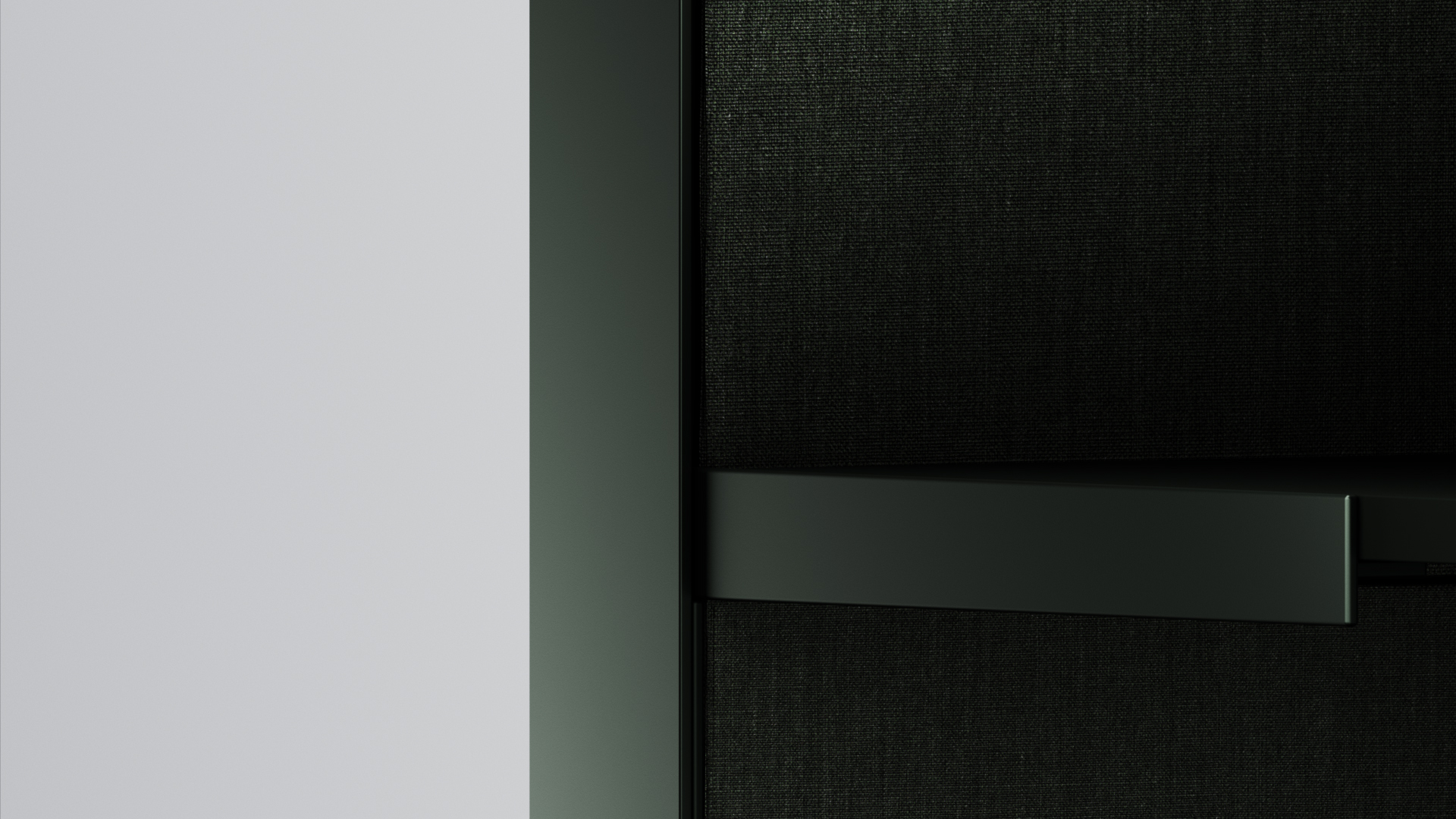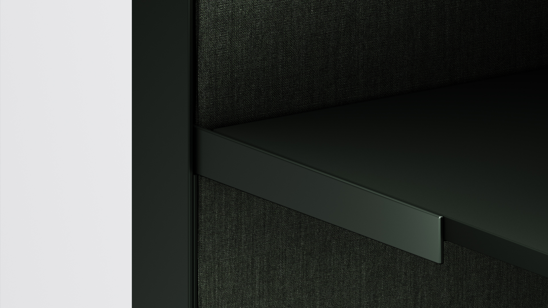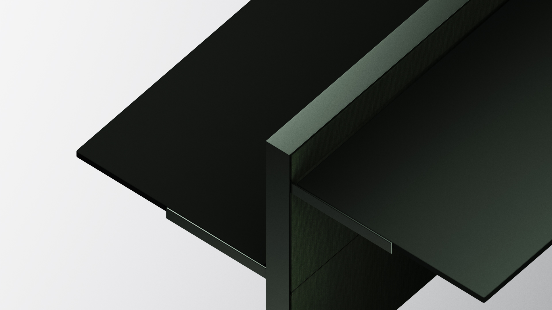 The desk is equipped with a custom-engineered spring and cam mechanism, housed within an aluminium frame, that can adjust and maintain the position of the work surface quickly and intuitively with simple manual pulling and pushing movements. The double-sided frame accepts a range of materials, from acoustic fabric to timber veneer.