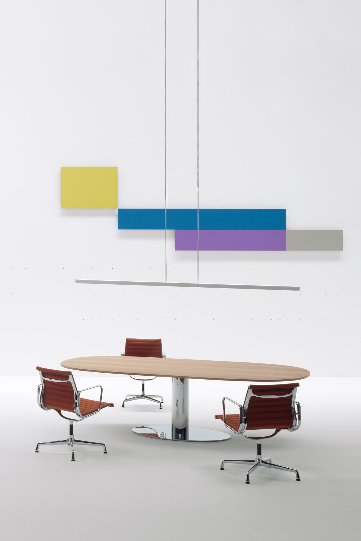 - Moodway meeting tables – design by Fernando Urquijo: round and oval formats, up to 360 × 180 cm, for executive and meeting rooms.