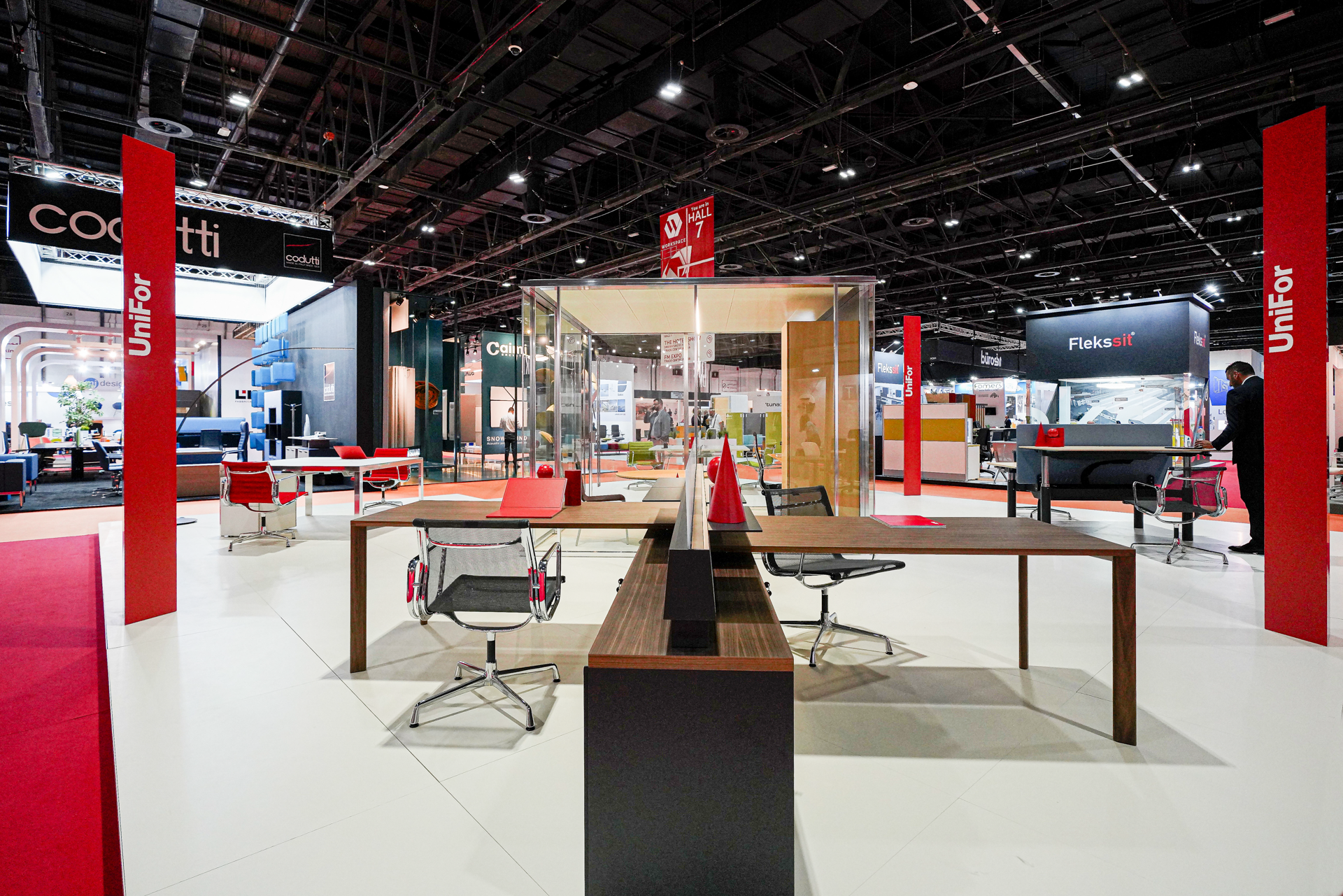 Parete AP Partition elements with double-glazed panels in safety glass with insulating cavity, and frame in anodized natural-finish aluminum, with guides concealed in the ceiling and flooring. Workstations with desktop finished in white, and legs in square-sectioned metal profiles.