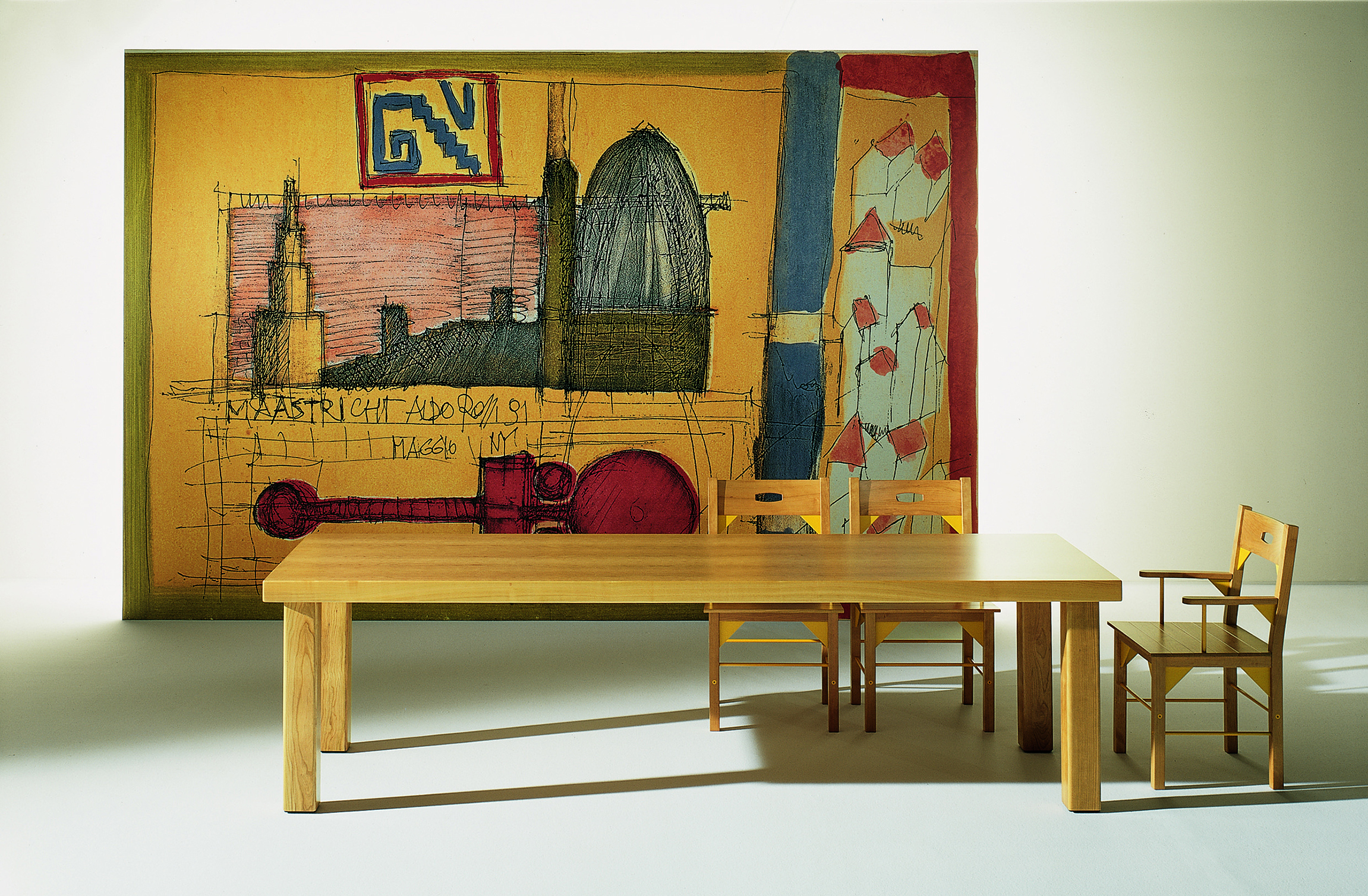 Aldo Rossi (1931-1997) was born in Milan, where he graduated in architecture at the Politecnico di Milano. In 1970 he began teaching at several American universities, including Harvard and Yale. He held a number of prestigious positions, including director of the architecture section of the Venice Biennale in 1983, while dividing his architecture practice between public and private construction. To mention just a few of his projects, the residential building in the Gallaratese district of Milan, the Cemetery of San Cataldo in Modena, the renovation of the Teatro Carlo Felice opera house in Genoa, the city block between Kochstrasse and Friedrichstrasse in Berlin, the reconstruction of Teatro La Fenice opera house in Venice, and the Bonnefantenmuseum in Maastricht. Architect and theorist, named Accademico di San Luca in 1979, winner of the Pritzker Architecture Prize 1990 and the Thomas Jefferson Medal in Architecture in 1991, Aldo Rossi is also famous for his work as a designer—collaborating with Alessi, Artemide, Longoni, Molteni and UniFor—and as a painter and graphic artist, two fields closely tied to his design work.