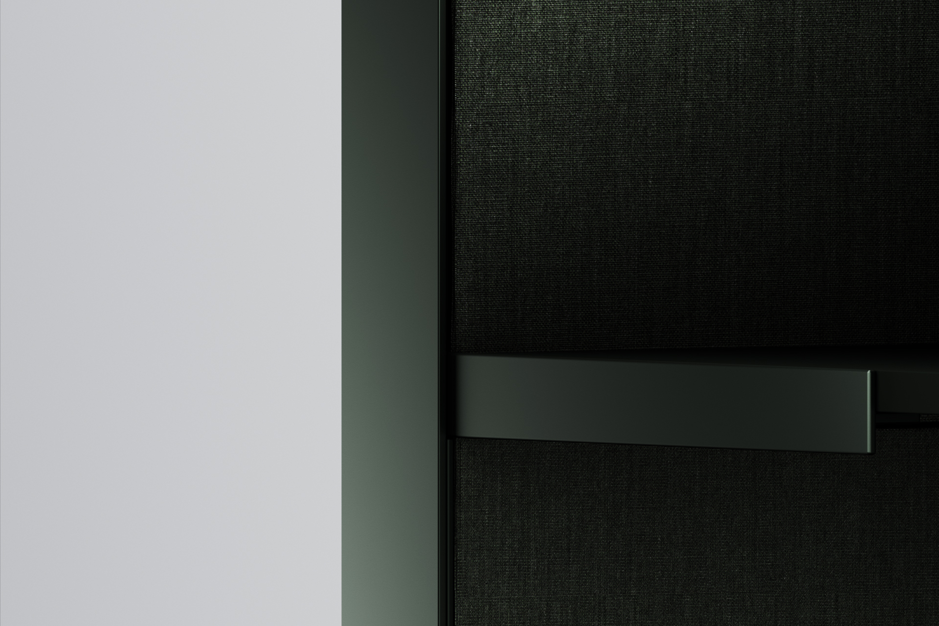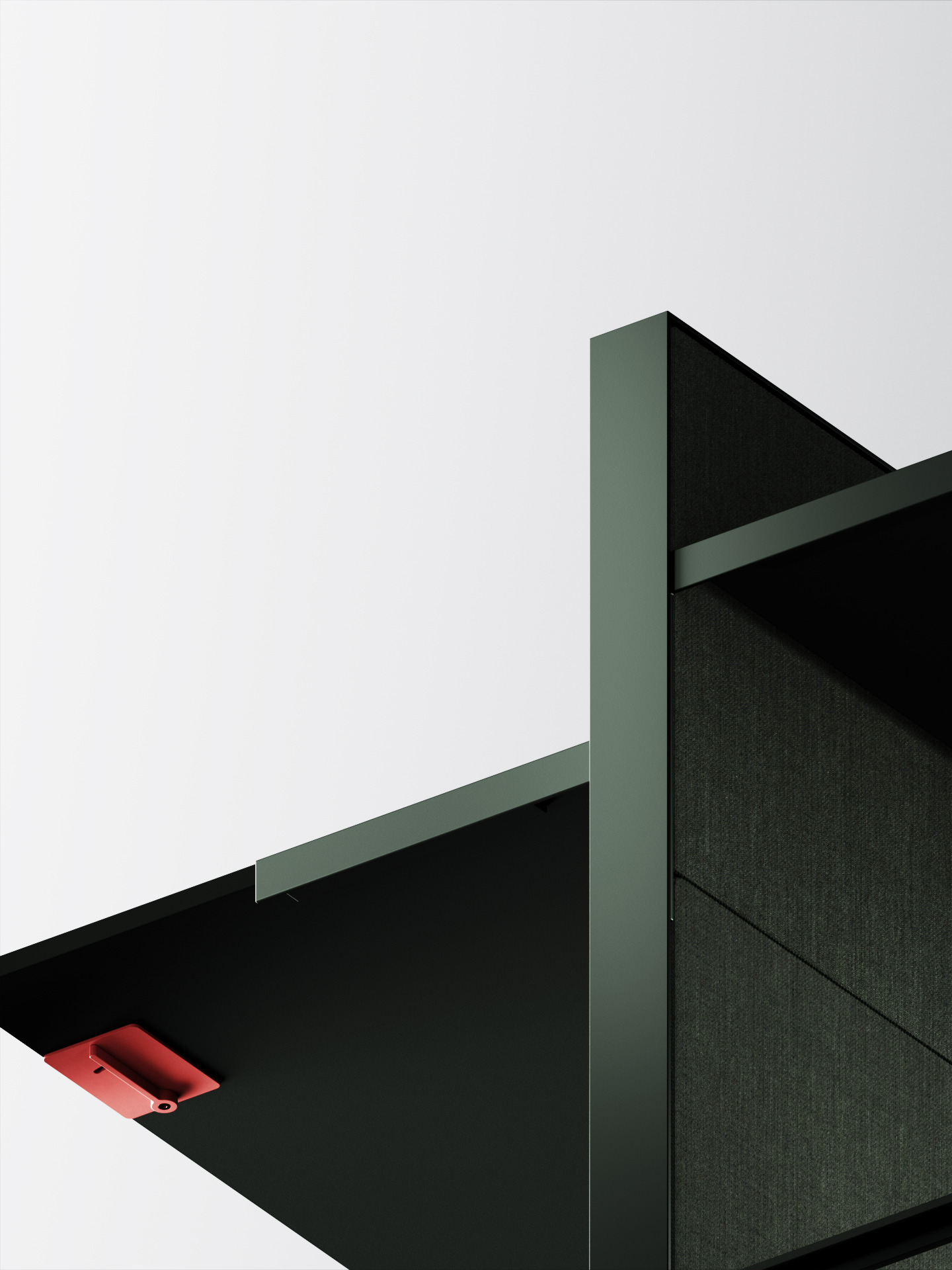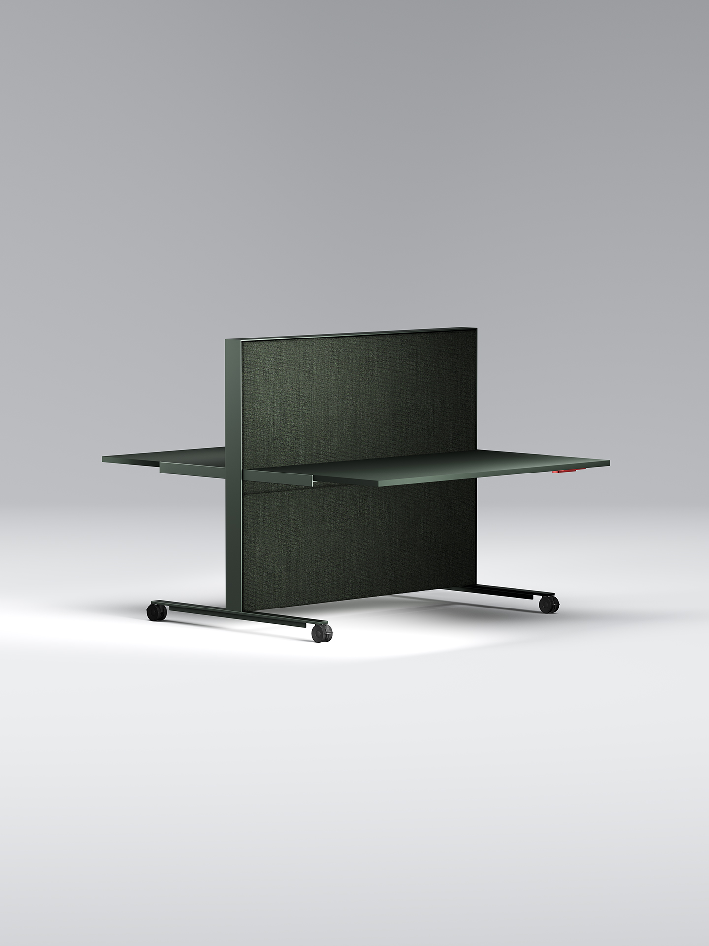 The desk is equipped with a custom-engineered spring and cam mechanism, housed within an aluminium frame, that can adjust and maintain the position of the work surface quickly and intuitively with simple manual pulling and pushing movements. The double-sided frame accepts a range of materials, from acoustic fabric to timber veneer.