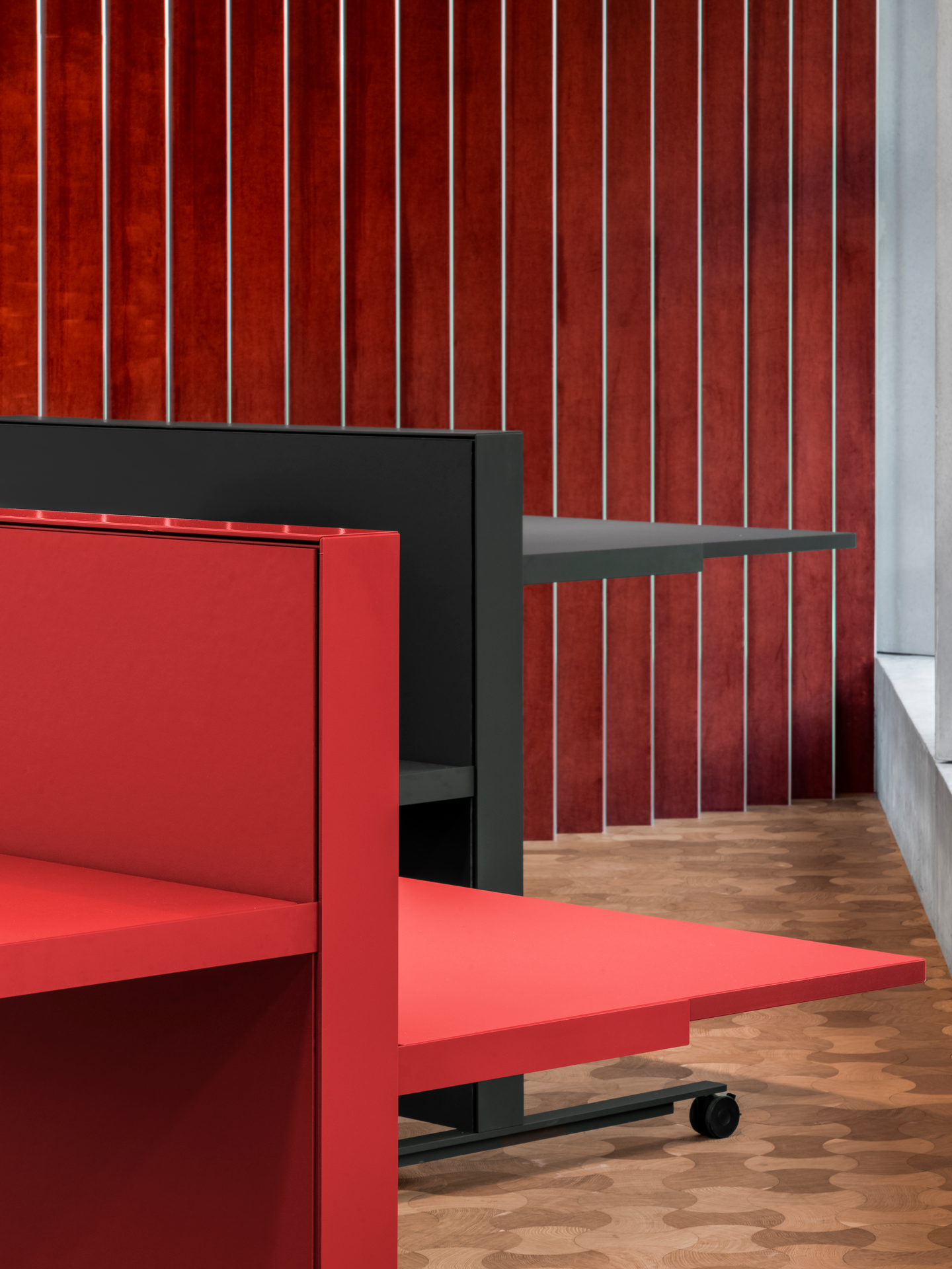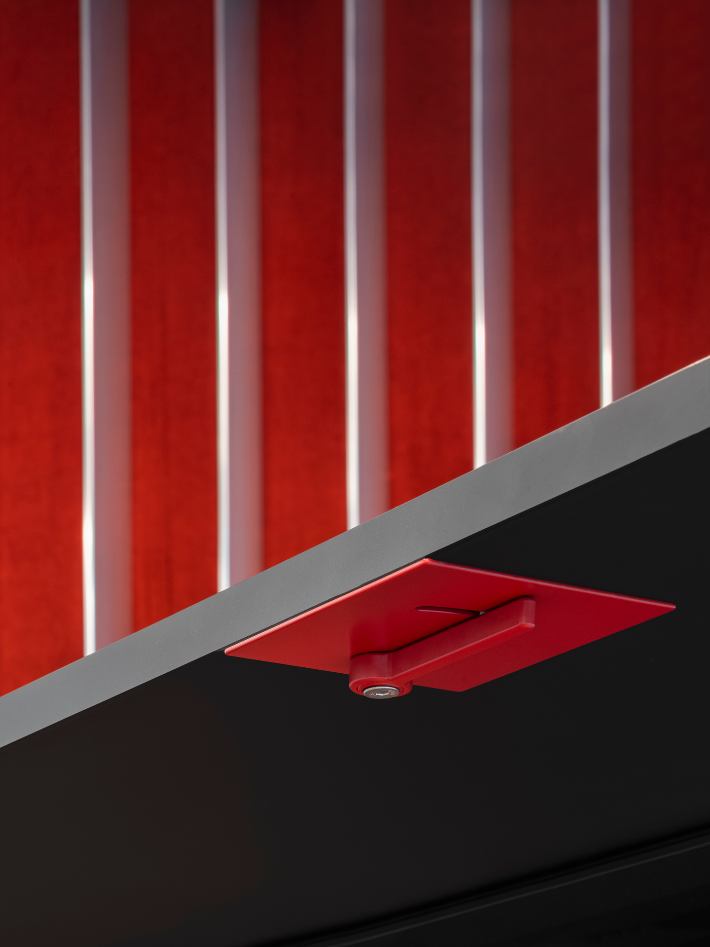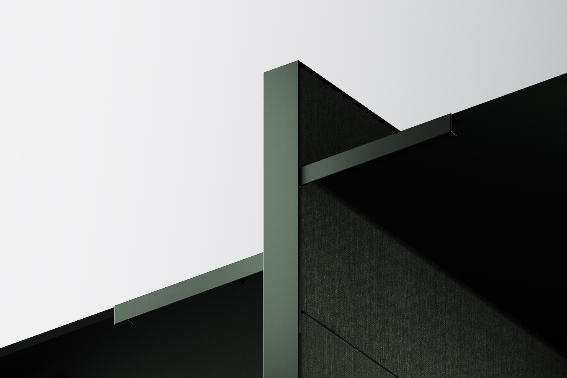 The desk is equipped with a custom-engineered spring and cam mechanism, housed within an aluminium frame, that can adjust and maintain the position of the work surface quickly and intuitively with simple manual pulling and pushing movements. The double-sided frame accepts a range of materials, from acoustic fabric to timber veneer.