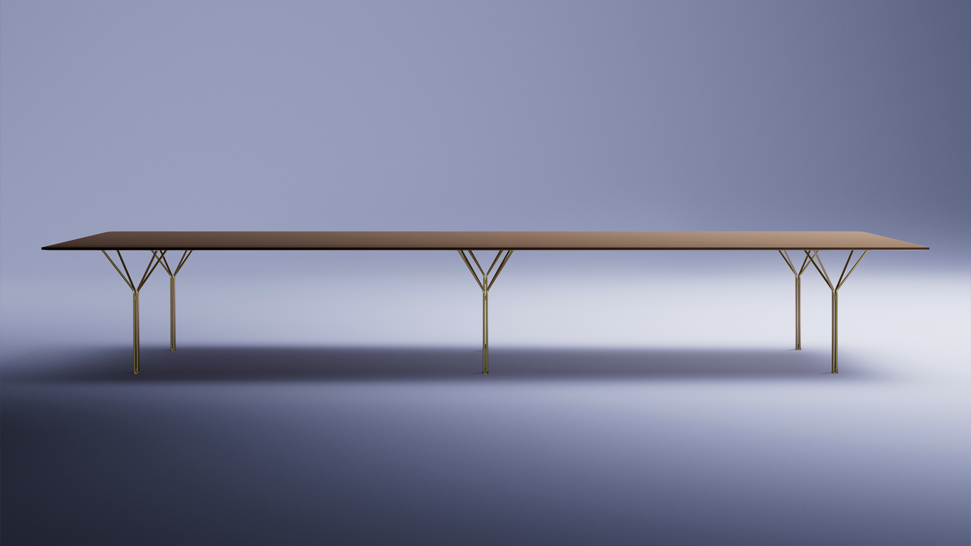 The Y-shaped steel legs of the table Y can be easily reconfigured to allow for different seating arrangements, and they can also be used to link different tabletops together, creating larger and deeper spans with only a few elements.