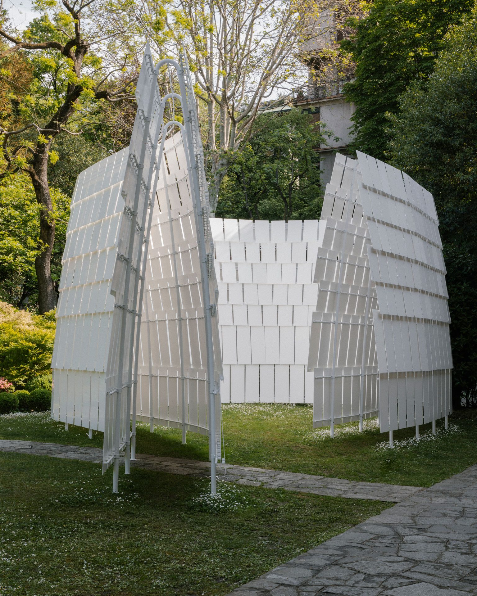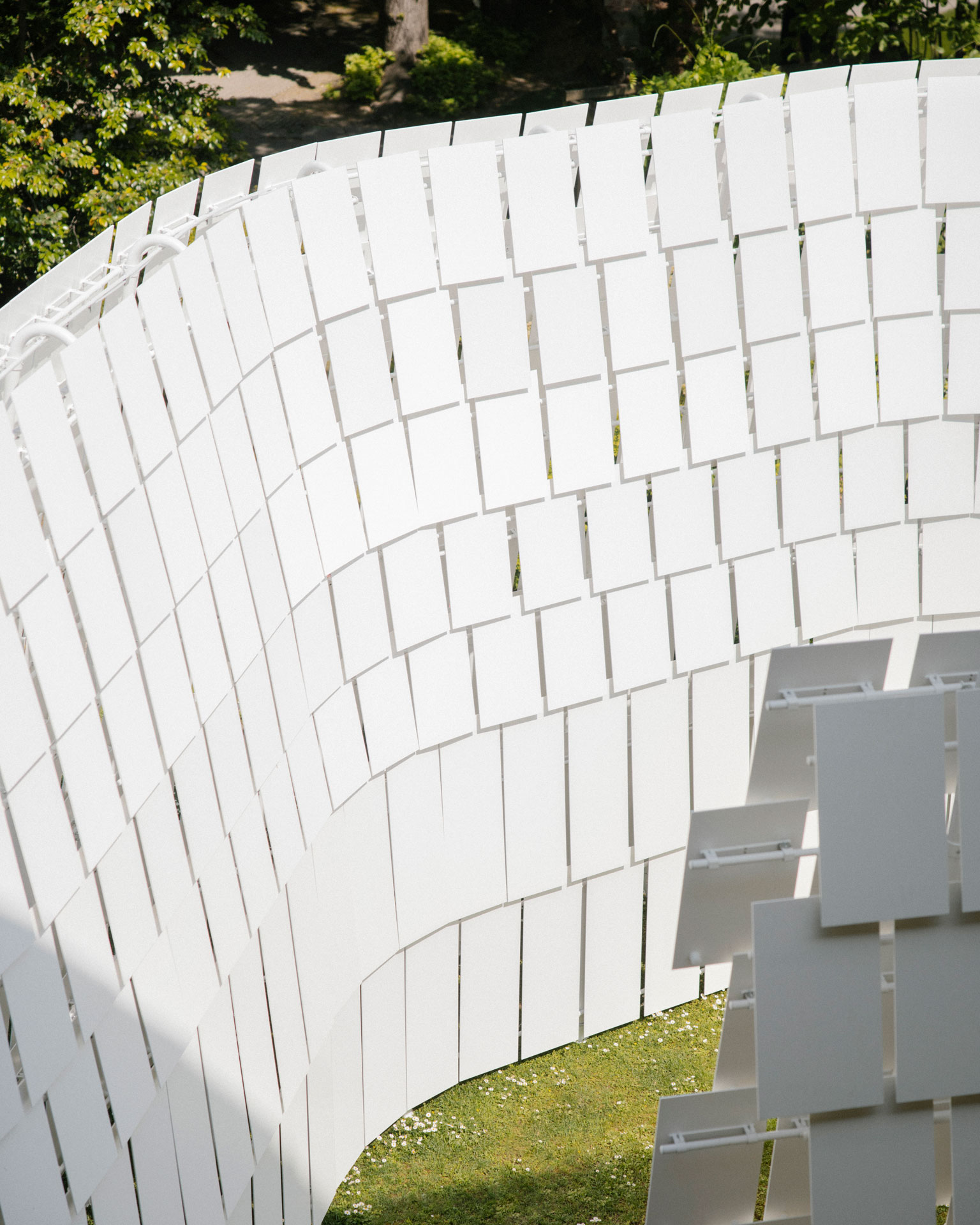 The installation, produced by UniFor, consists of a metal structure made of 20 portals, clad with solid surface shingles anchored to horizontal supports. The staggered arrangement creates fine openings that allow air and light to pass through.