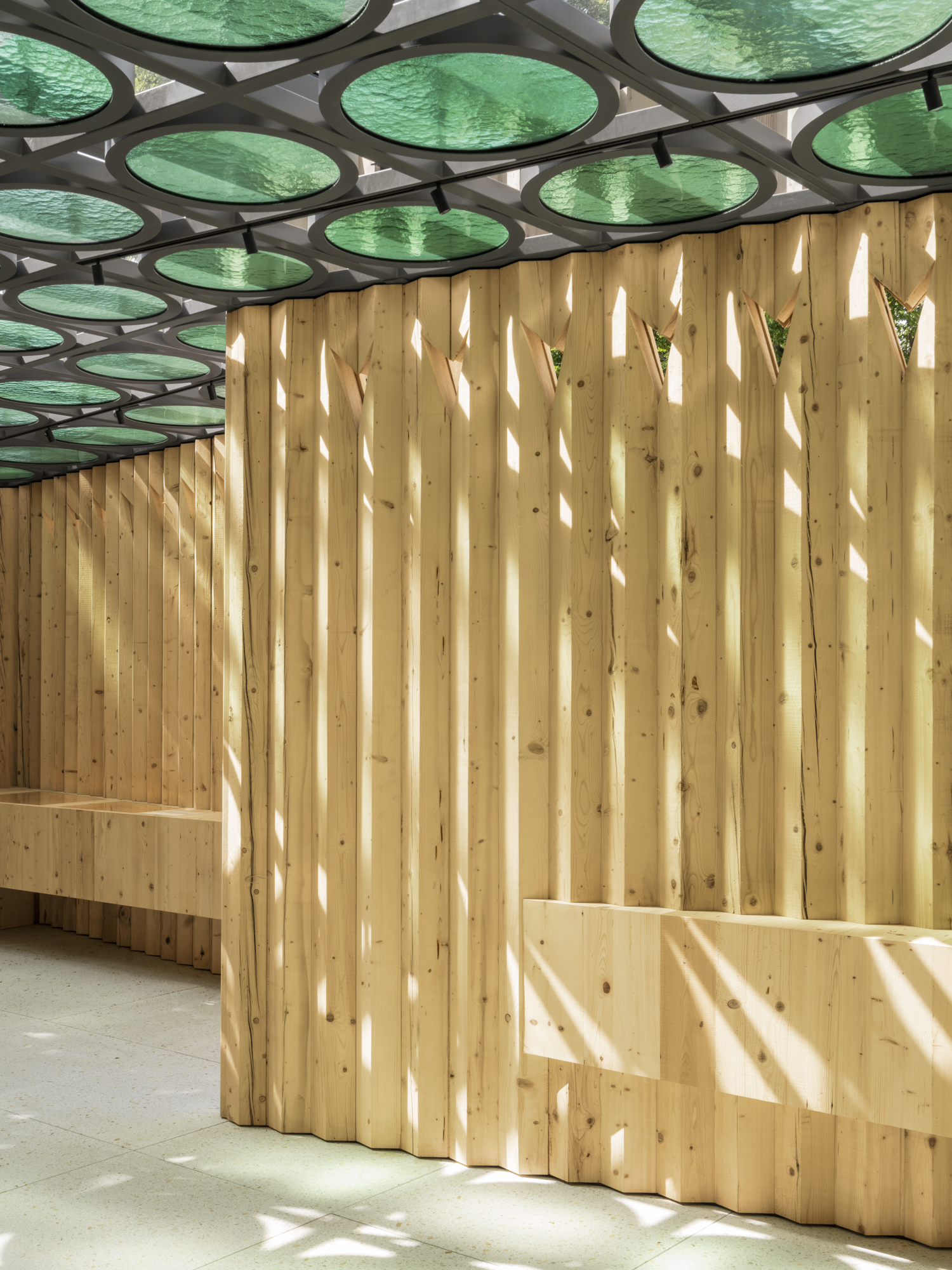 The fully transparent roof provides shelter while allowing natural light to permeate the interior. Beneath it, a composition of cast glass discs in soft, graduated shades of green and lagoon tones evokes the maritime landscape and was created in collaboration with a local artisan.
