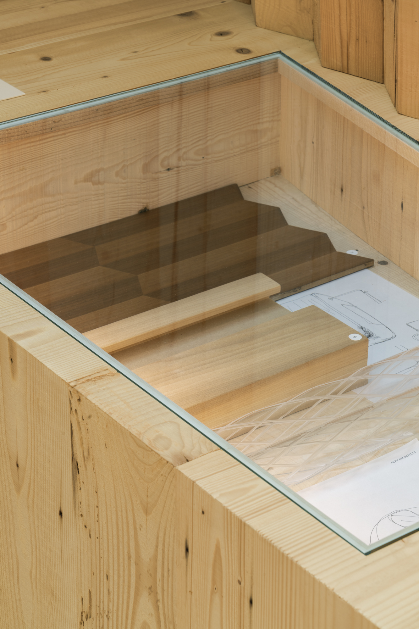 The space is further enhanced by a series of video screens: a central display features a film documenting the pavilion’s construction, while additional screens along the walls showcase selected architectural projects.