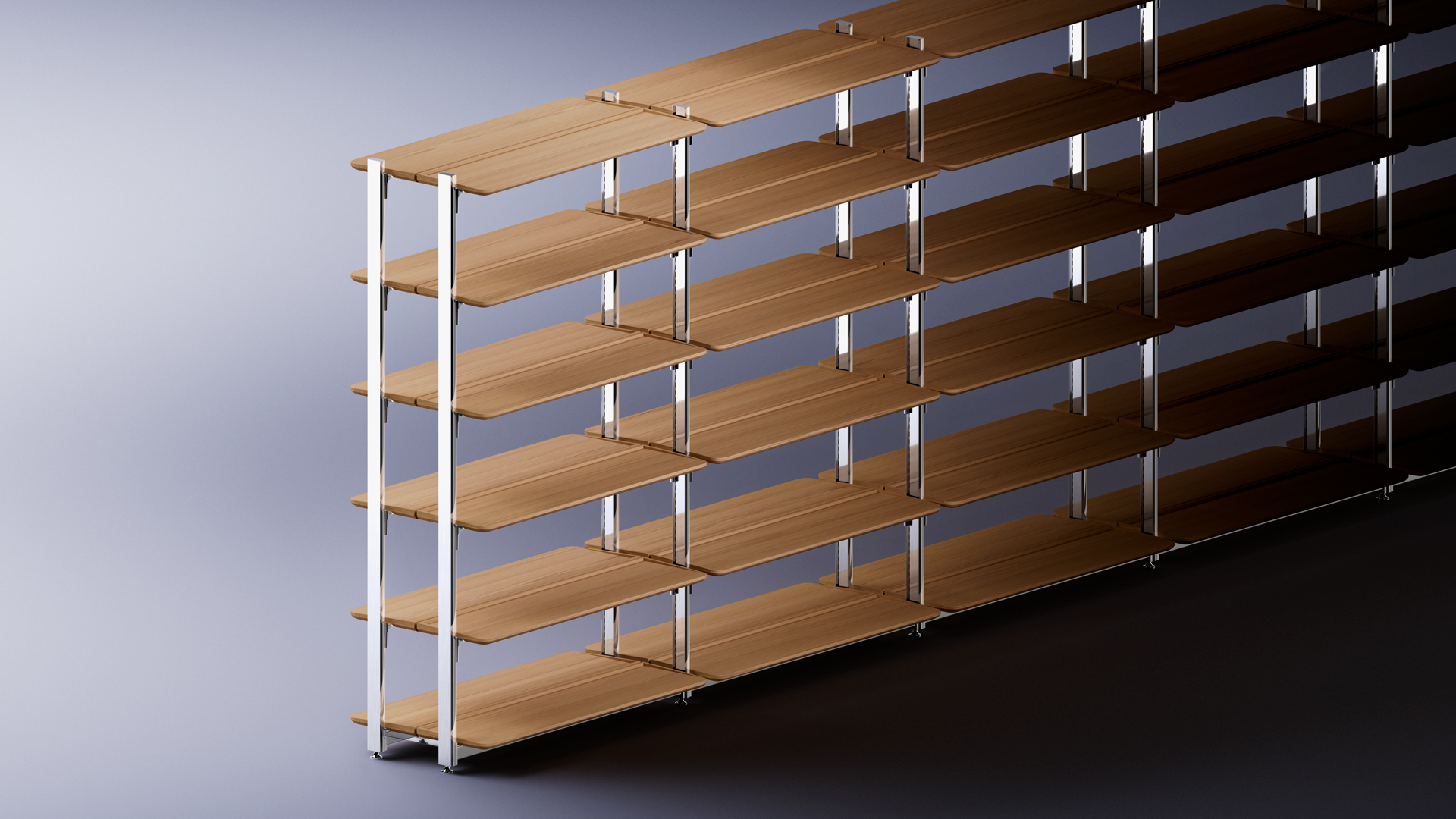Open, lightweight, flexible, the Bokhus shelving system is composed of terminal and central uprights with a concealed rack allowing for the free configuration of the shelves. The use of recycled aluminium, wood and cellulose make Bokhus a sustainable product. The production technique allows for each element of the product to be separated and appropriately recycled and disposed of.