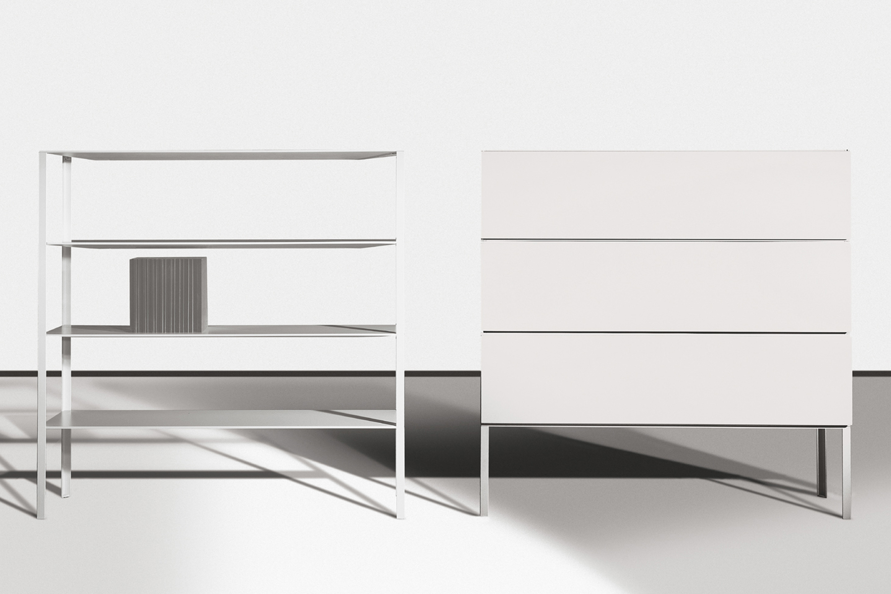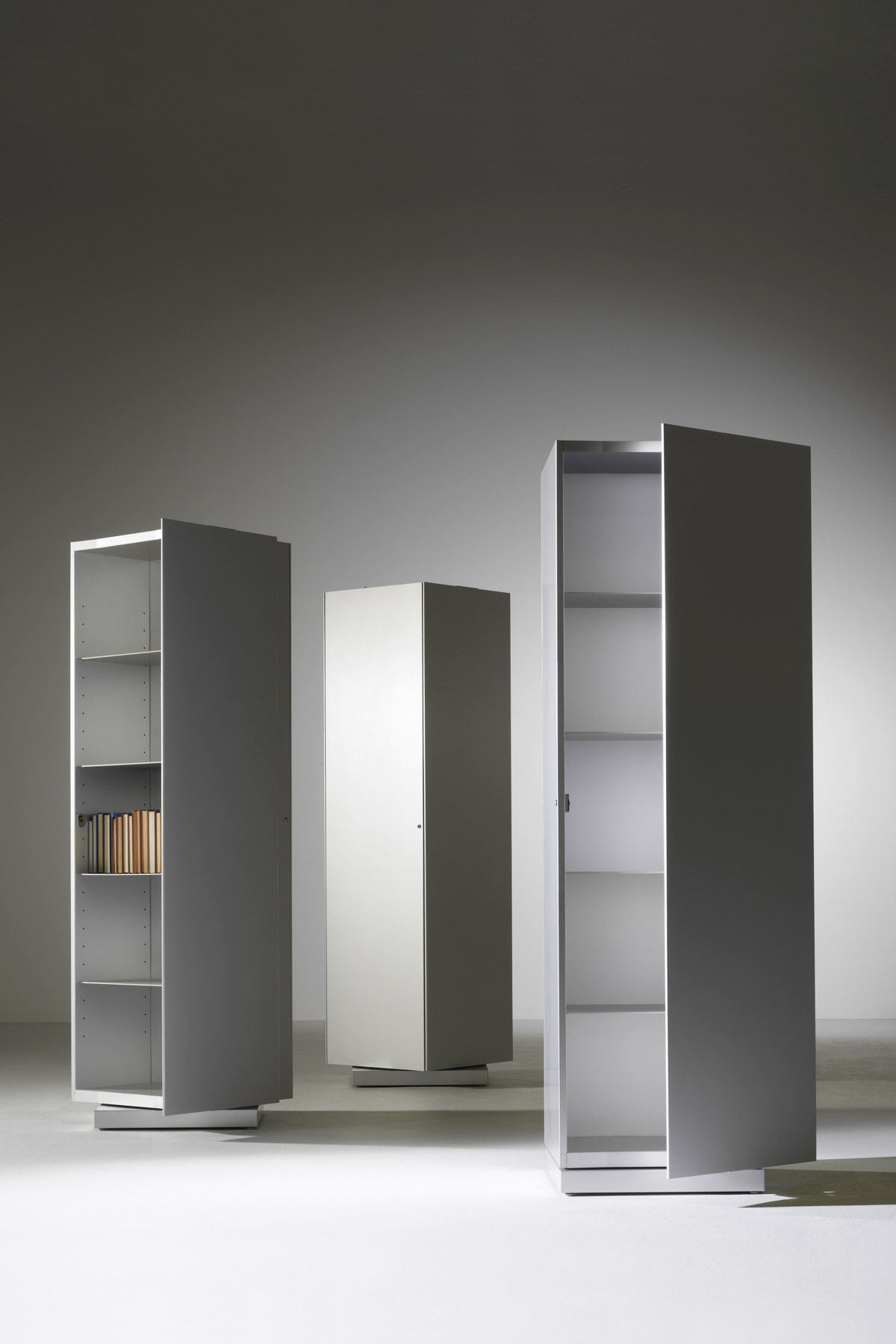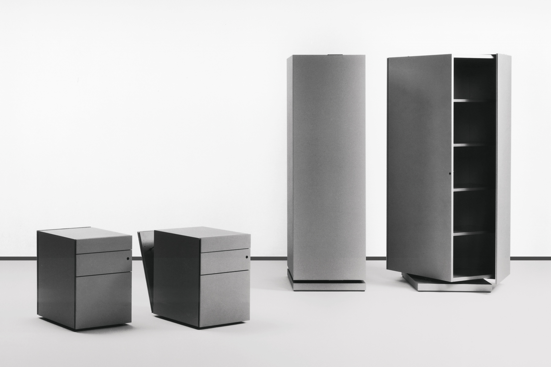 In addition to workstations and executive desks, the modular Less system also features a range of innovative accessory pieces. With the geometric essence of flat surfaces and regular parallelepipeds and the solidity of the metal structures, these pieces organise our day-to-day work spaces discreetly yet effectively. The unit with three drawers, one of which is designed specifically for storing folders, features a hinged rear panel for storing cabling and can be finished with sliders or wheels. The rotating towers on fixed bases have openings on both sides, with the doors shifting from one side to the other in order to ensure the space is taken full advantage of, thanks to a patented mechanism. As of the second half of the 1990s, the system was expanded with the addition of a modular bookcase, either open-faced or closed off, featuring open-out doors and available in various heights and lengths.