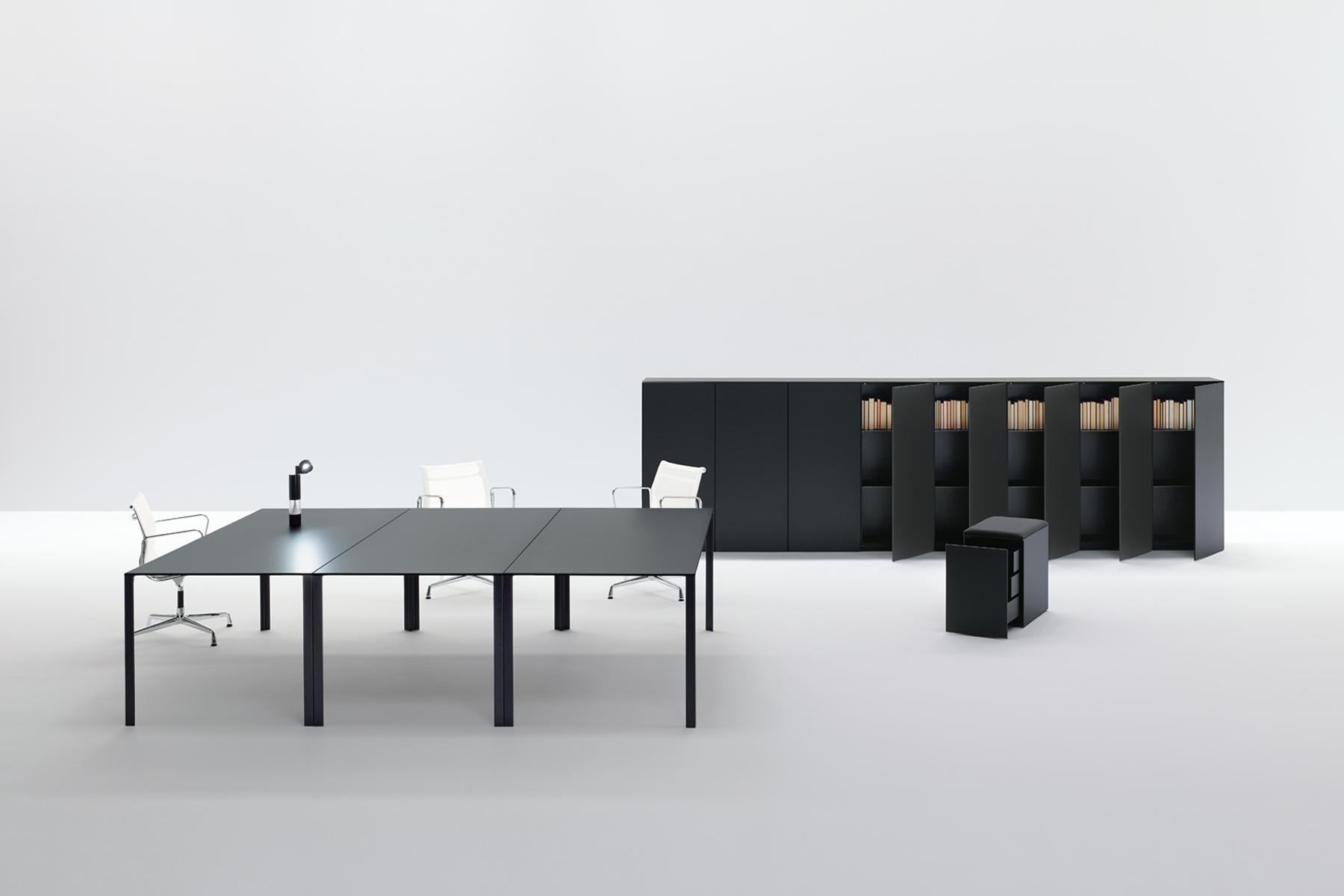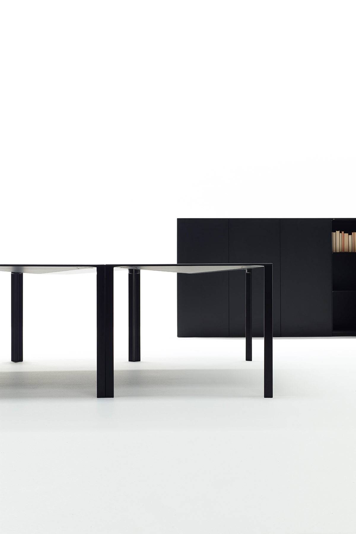 Jean Nouvel offers up a fresh take on the Less series, using new materials and em-ploying sophisticated construction techniques to create the LessLess tables. Made entirely from aluminium, the pieces represent a modern vision of the contemporary office space. Abstract, monolithic, lightweight and sleek, the LessLess modular tables are available in different sizes (rectangular, square or L-shaped) and can easily be grouped together to create elegant, large meeting tables ideal for bringing a rational feel to key corporate spaces.