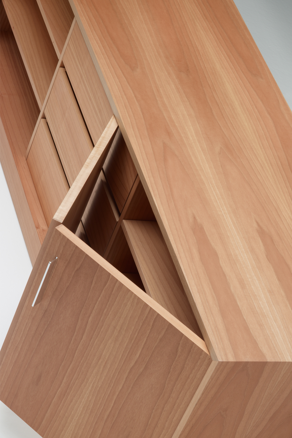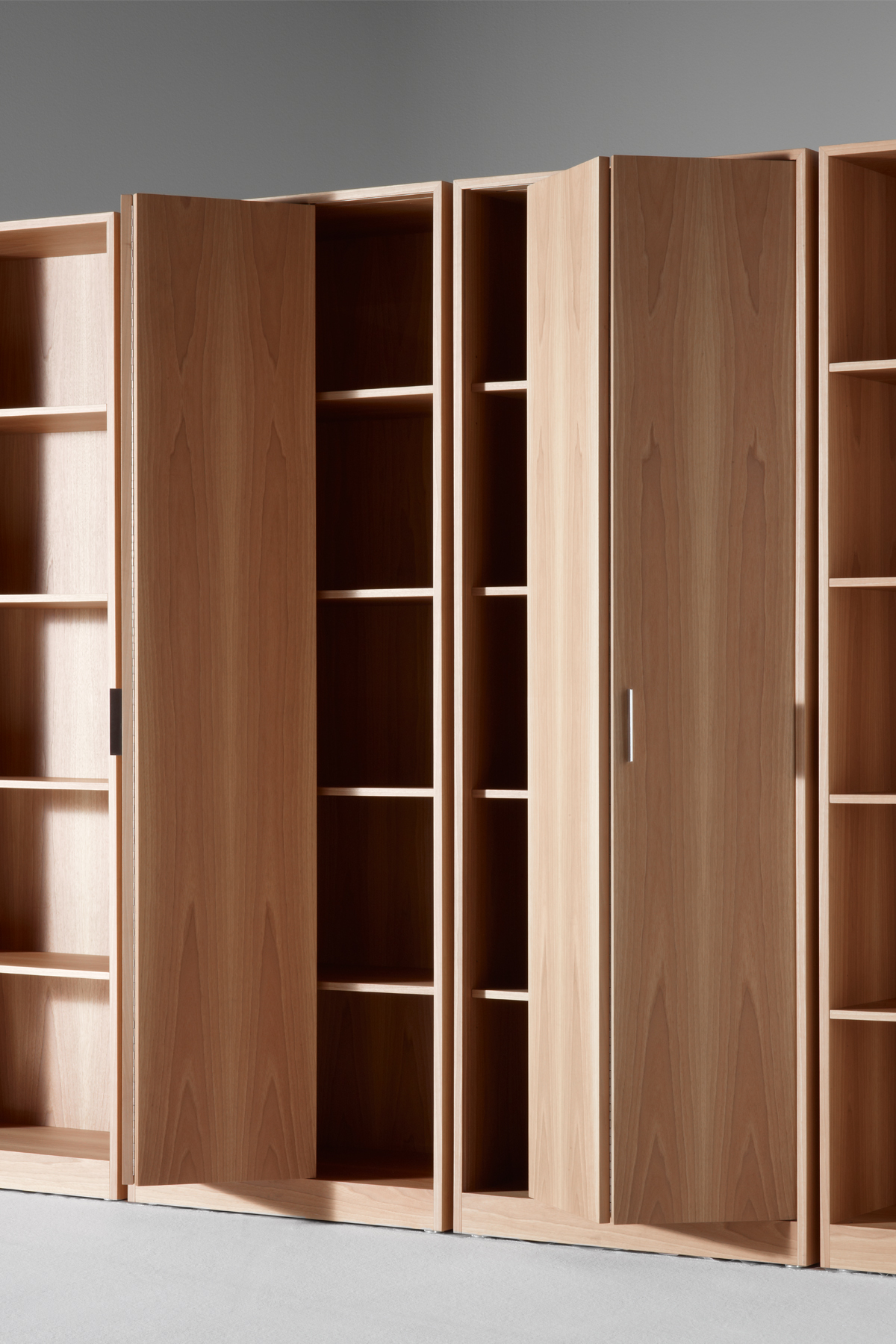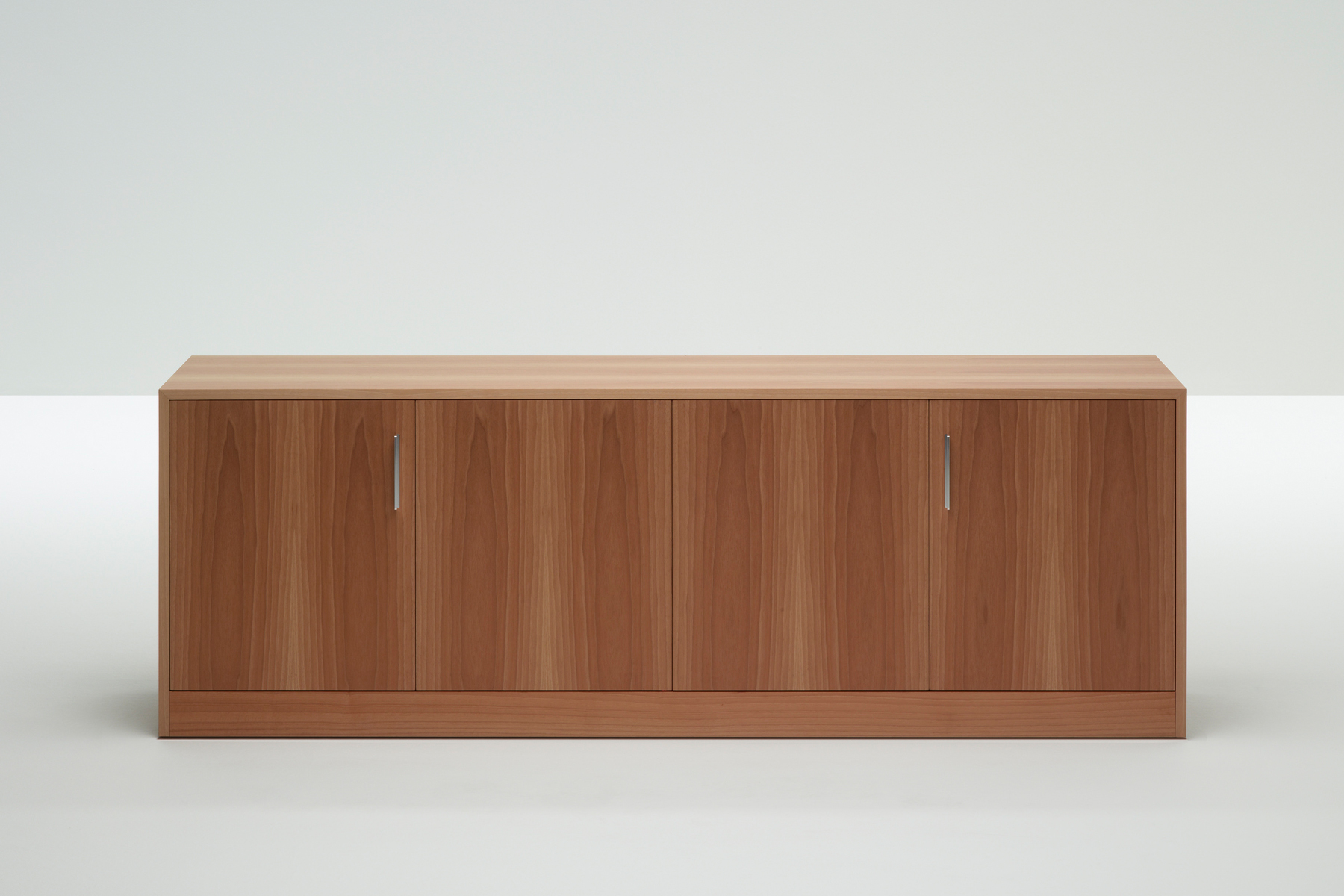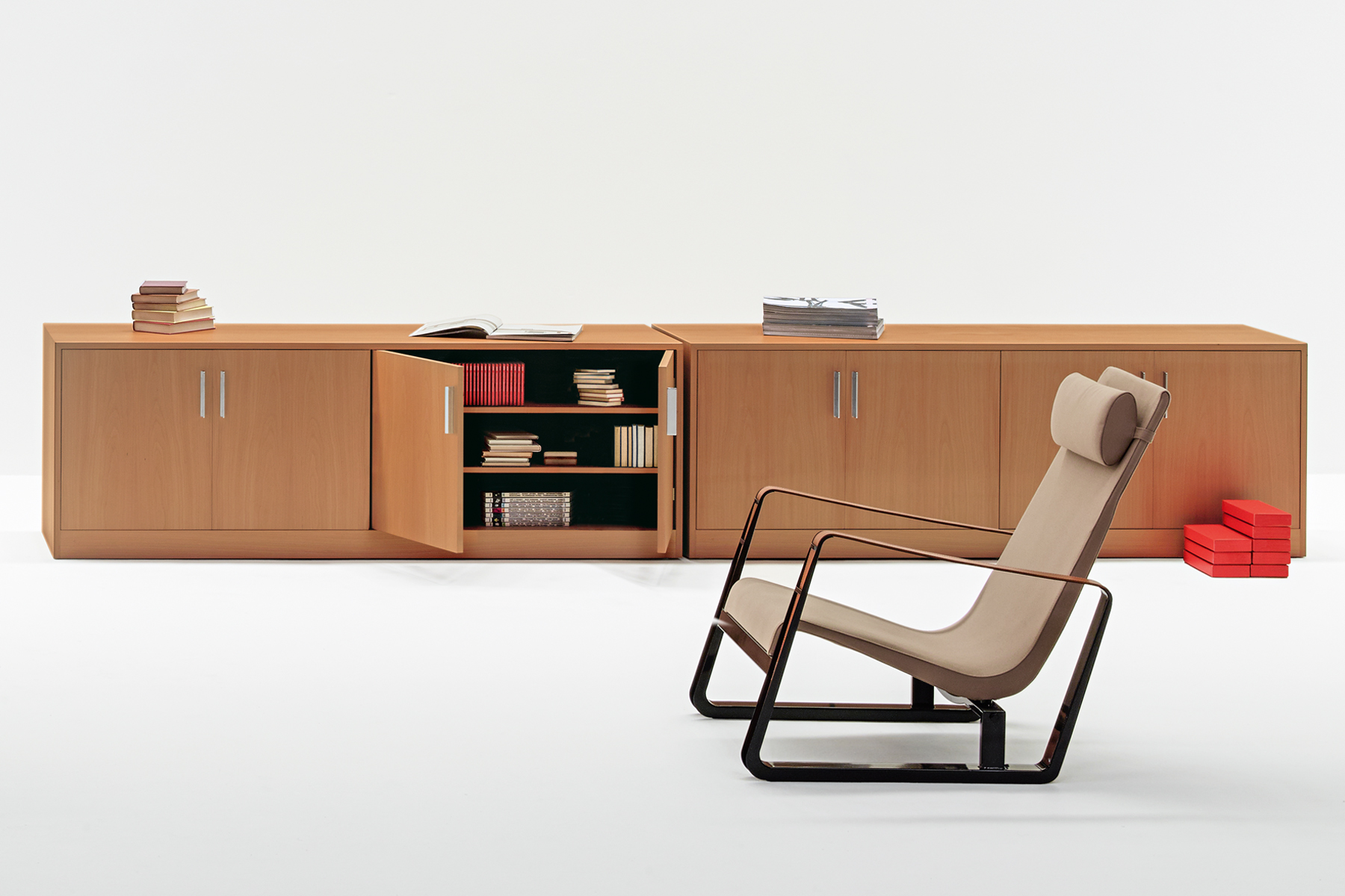 Featuring smooth surfaces and simple lines, the compact Moodway low storage piece can be opened up using its elegant hinged doors, revealing wooden shelves inside. The open-faced bookcases and filing cabinets – which also feature hinged doors – can be combined and grouped together to suit specific requirements. Each element is designed to reduce and simplify the bulk of the system, allowing the elegant, simple shapes to shine.