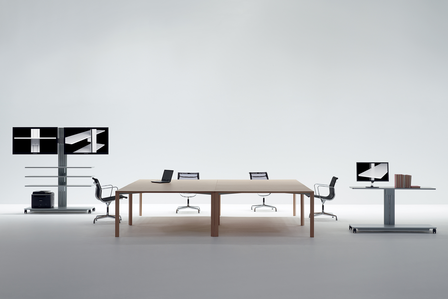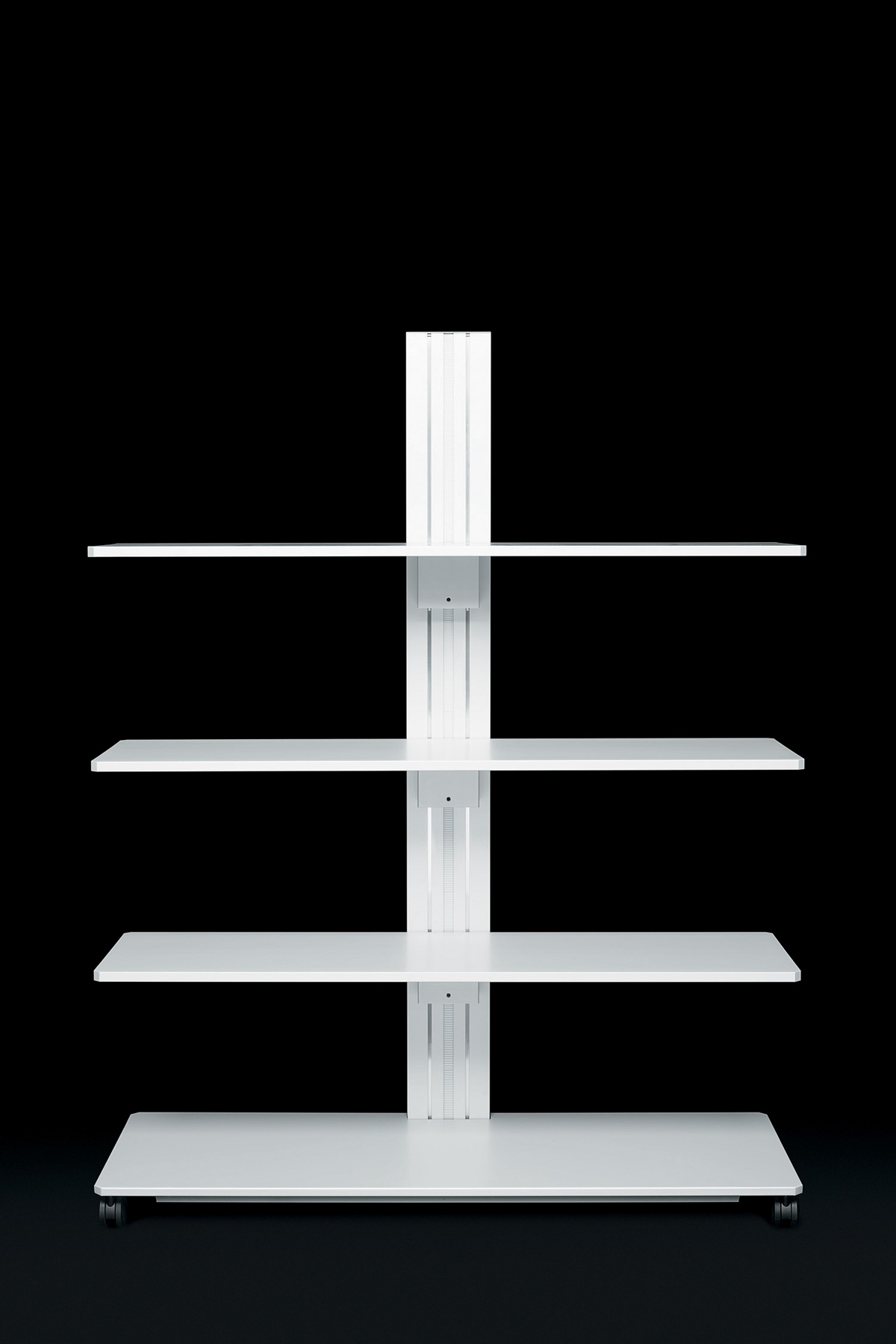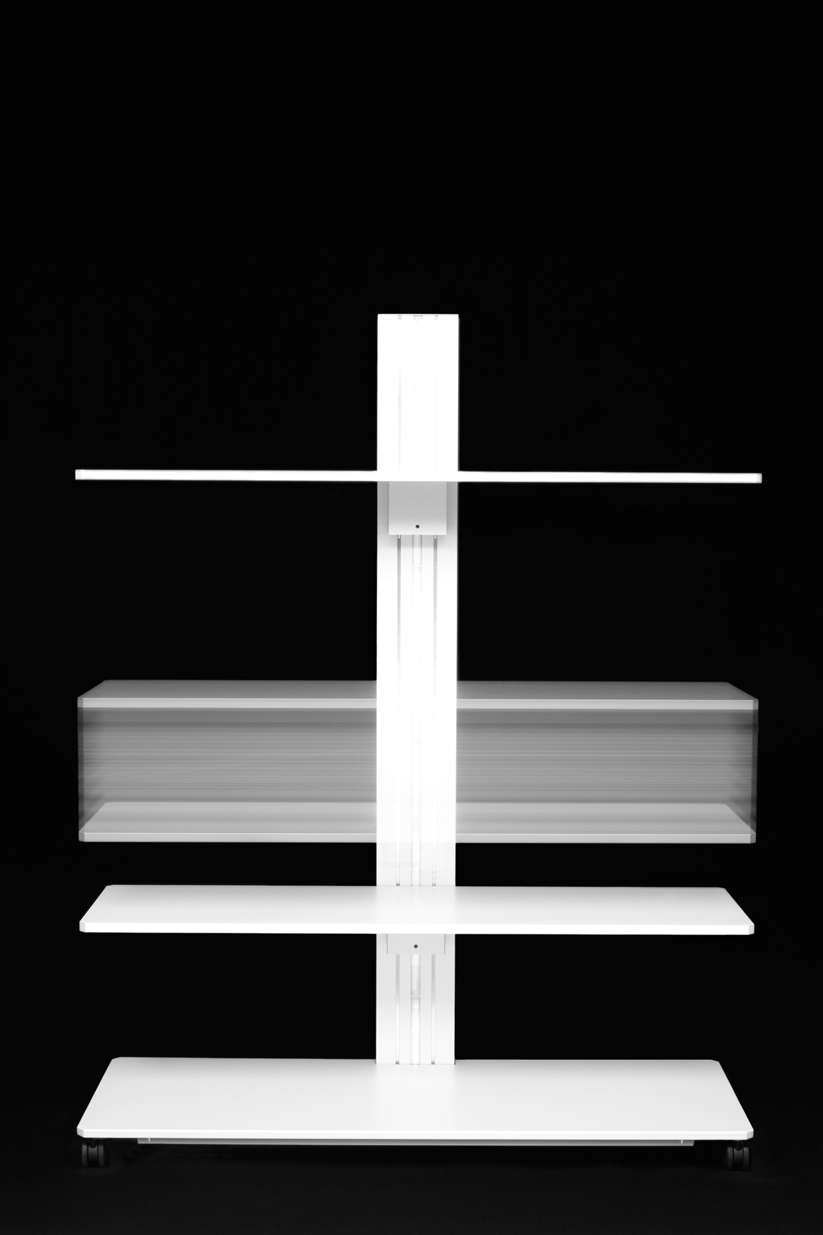 Flexible, practical and underpinned by simple design, the multifunctional Move 010 trolleys have been equipped with tech and media solutions in order to facilitate working habits. Available in three heights, Move 010 features a solid metal structure with up to three shelves, whose height can be adjusted even if equipment is already installed. The base is equipped with power sockets and special coaxial spherical wheels, which guarantee elevated stability when stationery and during movement.