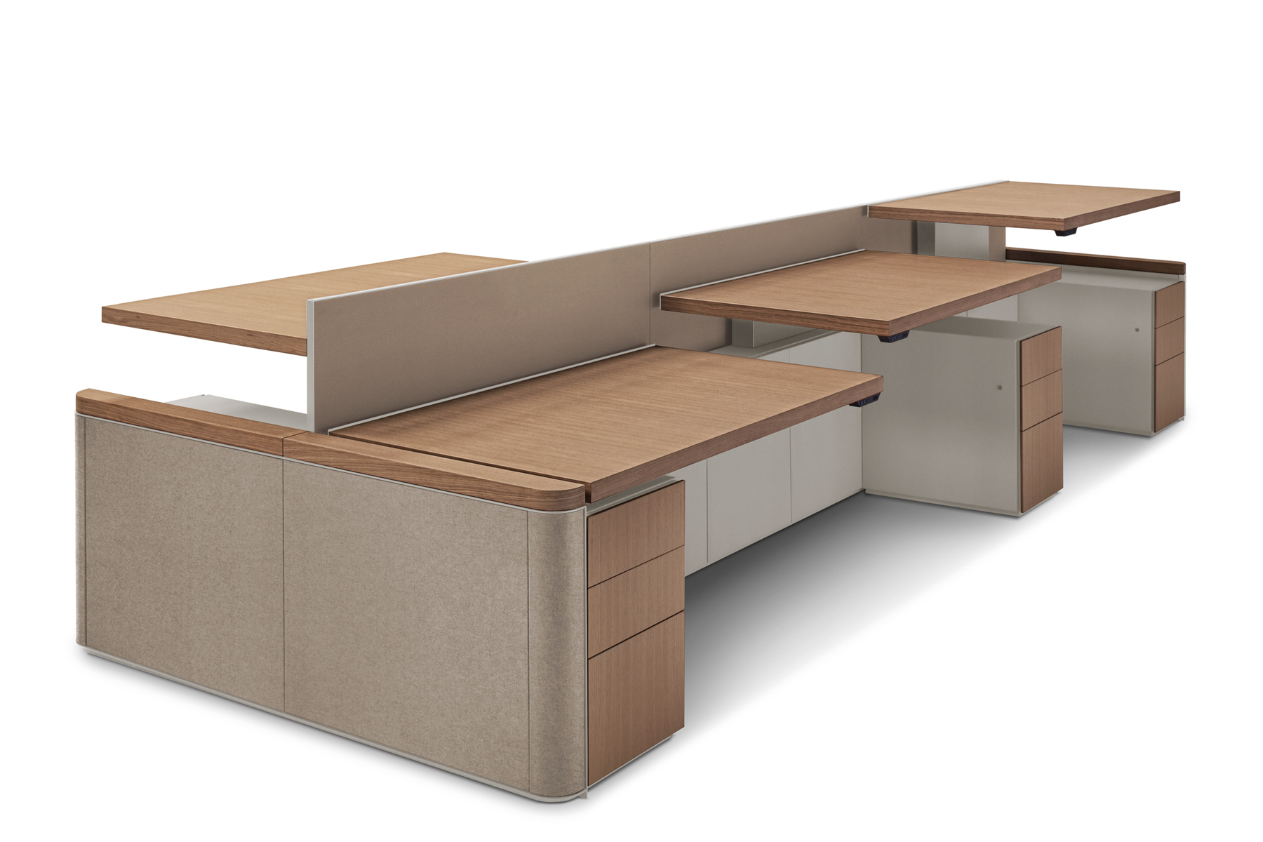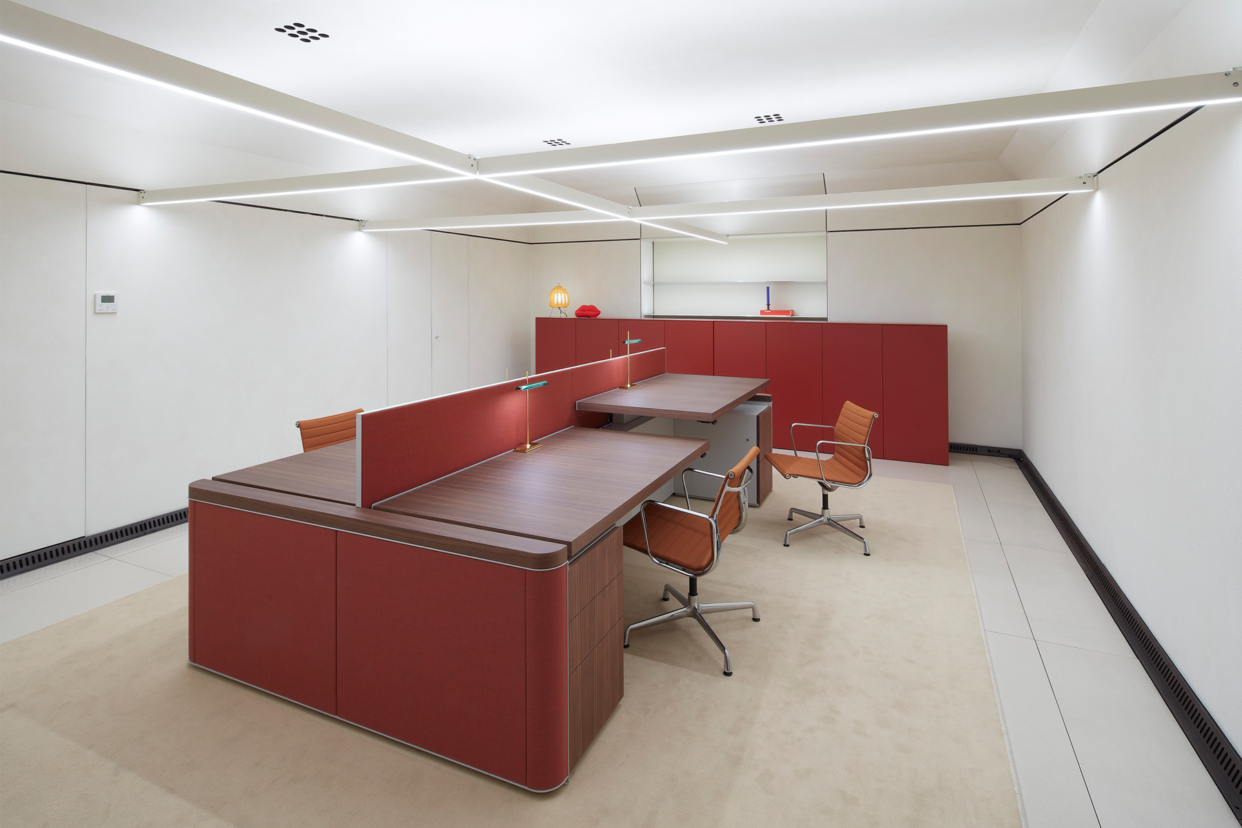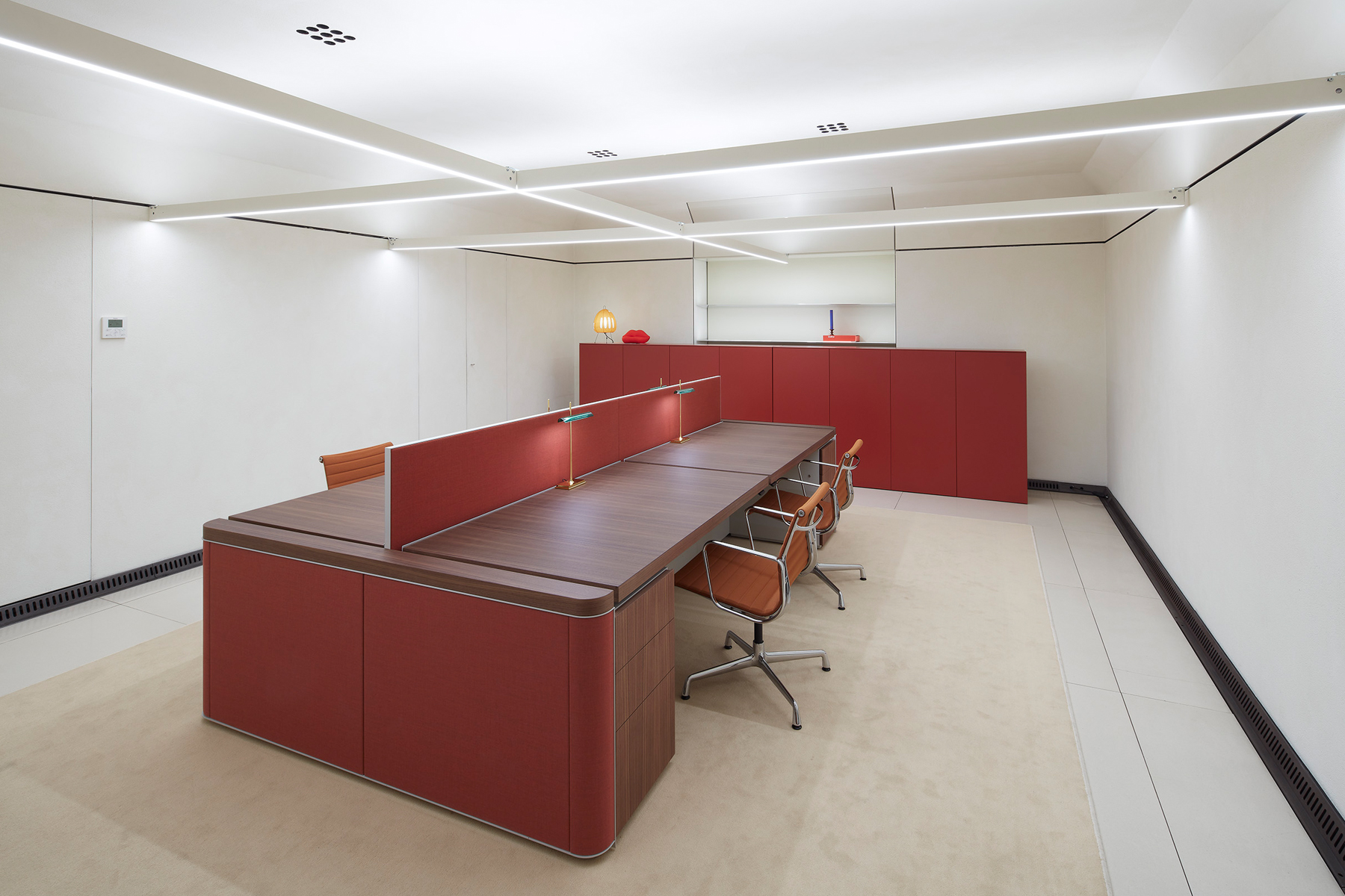 Characterised by their sophisticated use of materials, elegant structural details and carefully calibrated combinations of finishes and colours, the Signum workstations offer unbeatable solutions which are elevated by understated, refined design. Technology is a constant companion throughout the collection too, yet this never feels overpowering or forced. The items in the collection allow for a range of linear configurations and are available in a number of different sizes. The height of the worktop, which features an elegant border in solid wood, can be adjusted so that users can work both standing up and sitting down.