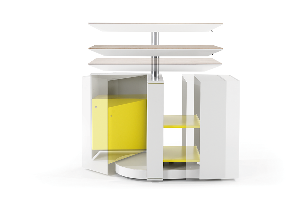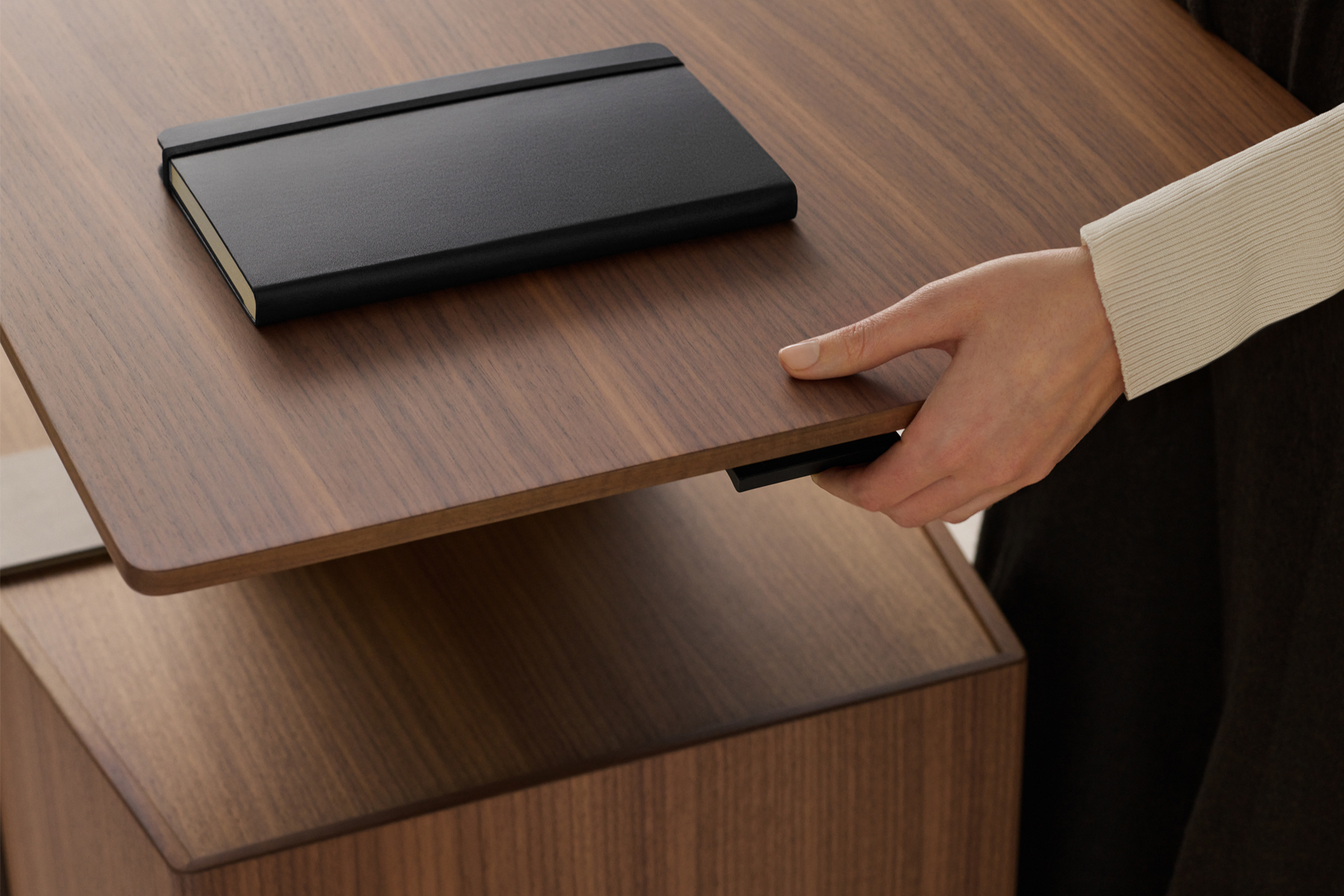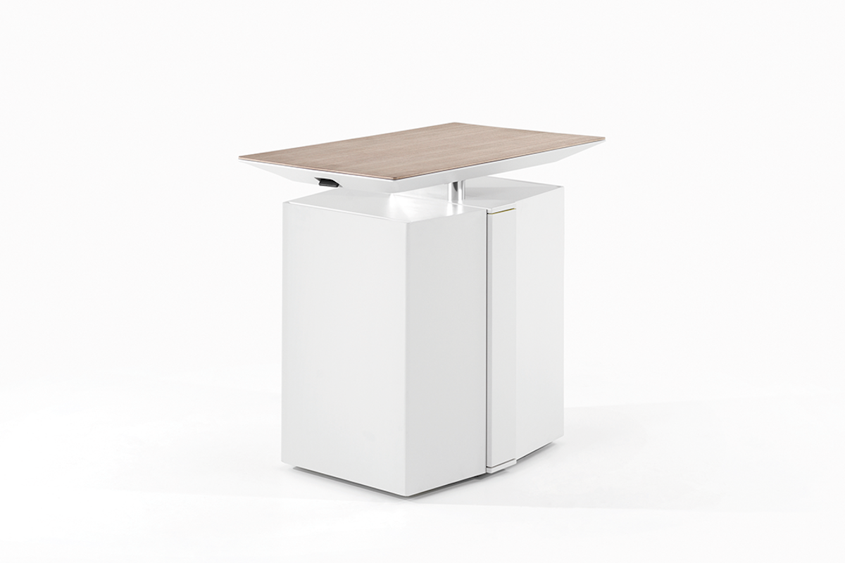 Featuring a simple, contemporary design, TDU encompasses a rectangular worktop sitting over a closed compartment which – when being used – opens out into two compartments featuring various useful accessories and tools. The worktop – available in finishes such as glass, Fenix laminate and Canaletto walnut – can be adjusted in terms of its height, while it also pulls out to ensure an ergonomic, comfortable user experience in any position, both seated and standing. Concealed wheels make moving the workstation easy, regardless of the floor surface.