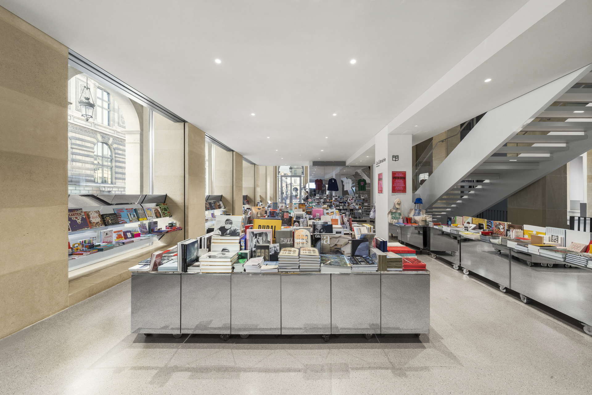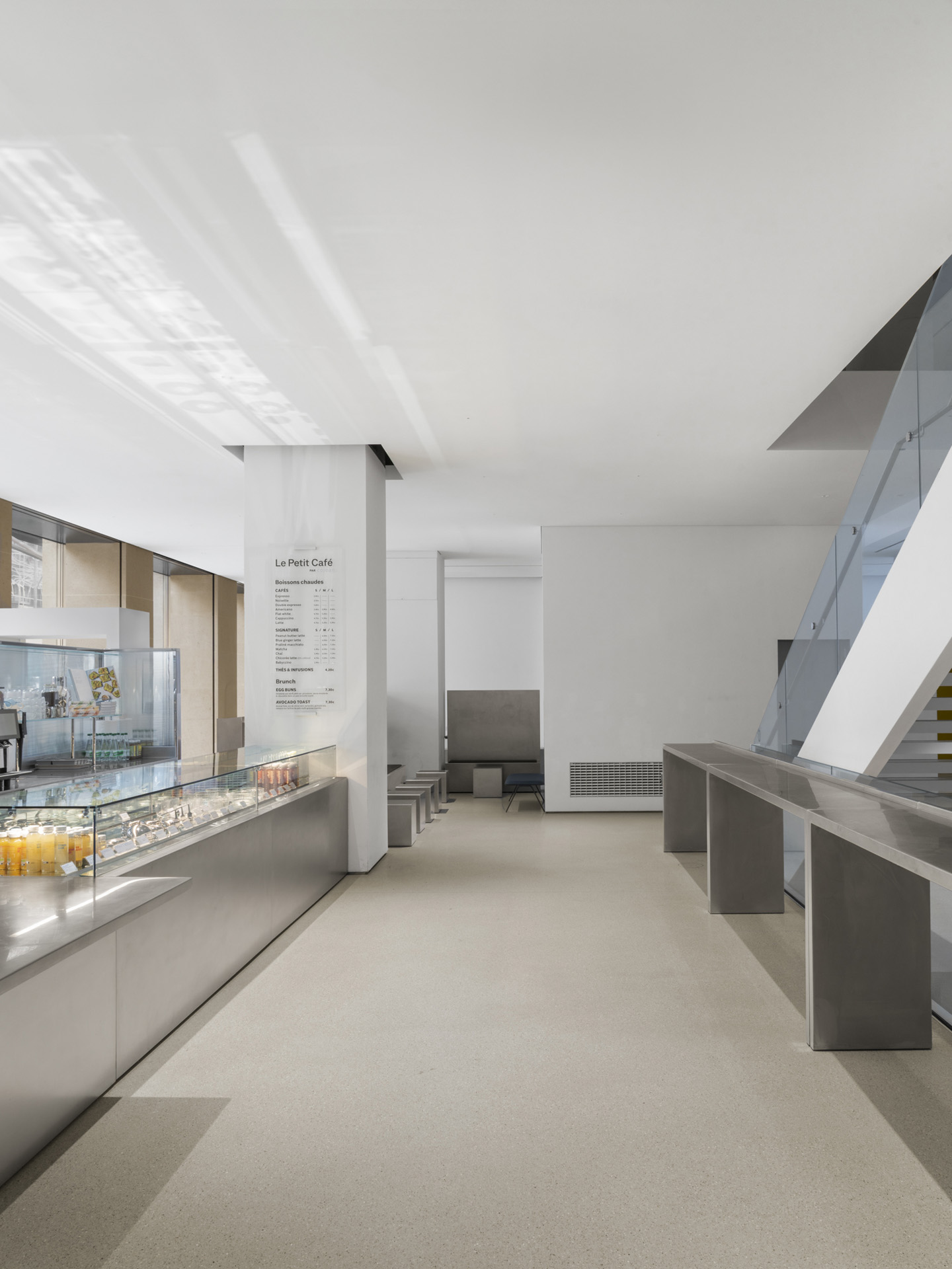 The furnishing intervention extends across the entire book exhibition area, from low steel units with plexiglass display structures for valuable volumes to shelving integrated within the shop windows. A large bookcase, engineered with refined technical expertise, transforms into a portal concealing technical rooms, while the checkout counter is composed of mirrored sheet-metal elements and removable wall-mounted shelves. The café area includes a steel counter combined with glass panels and, in continuity with the previous Fondation Cartier project, the interiors are completed by LessLess benches and tables in brushed steel.