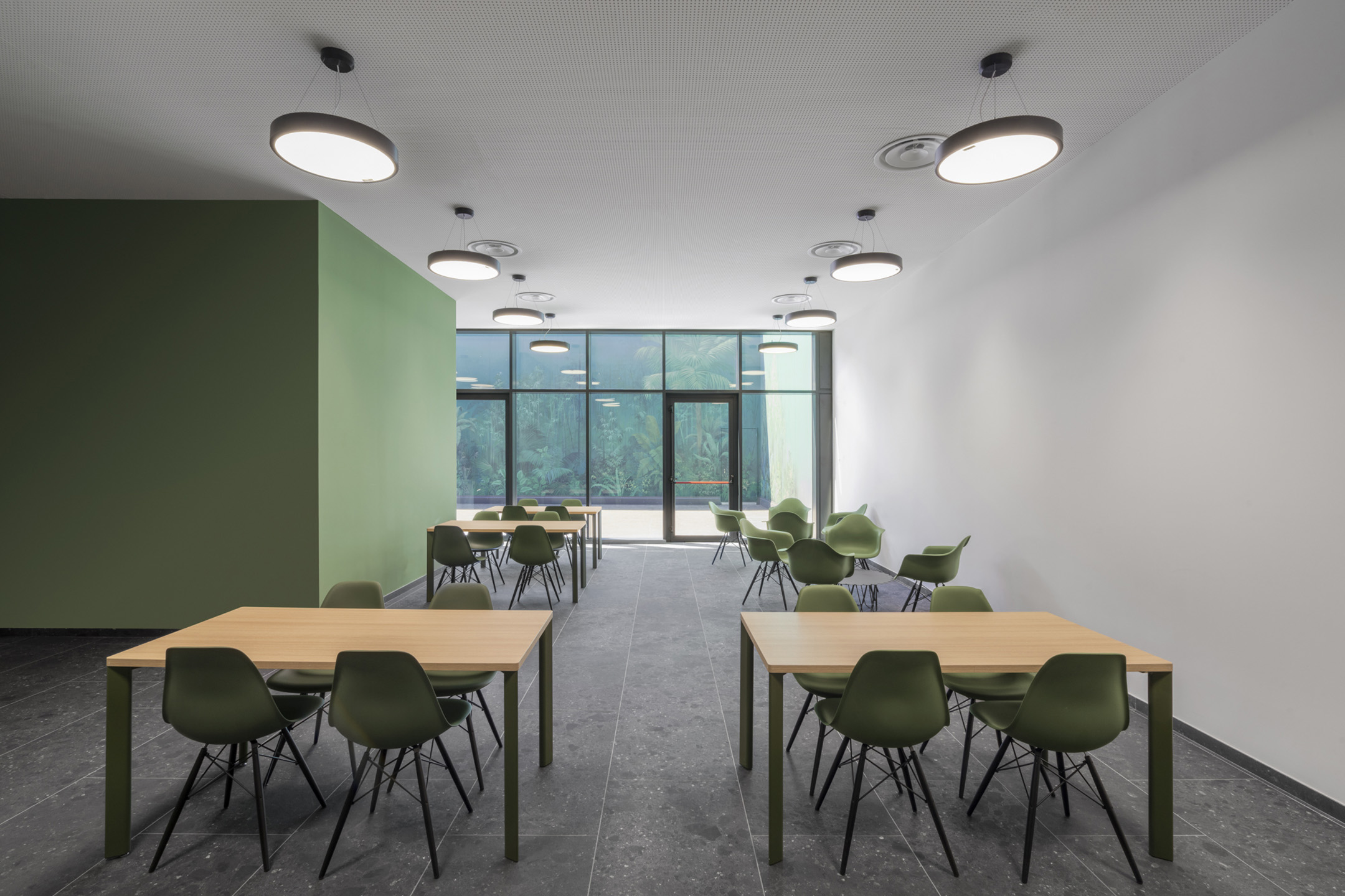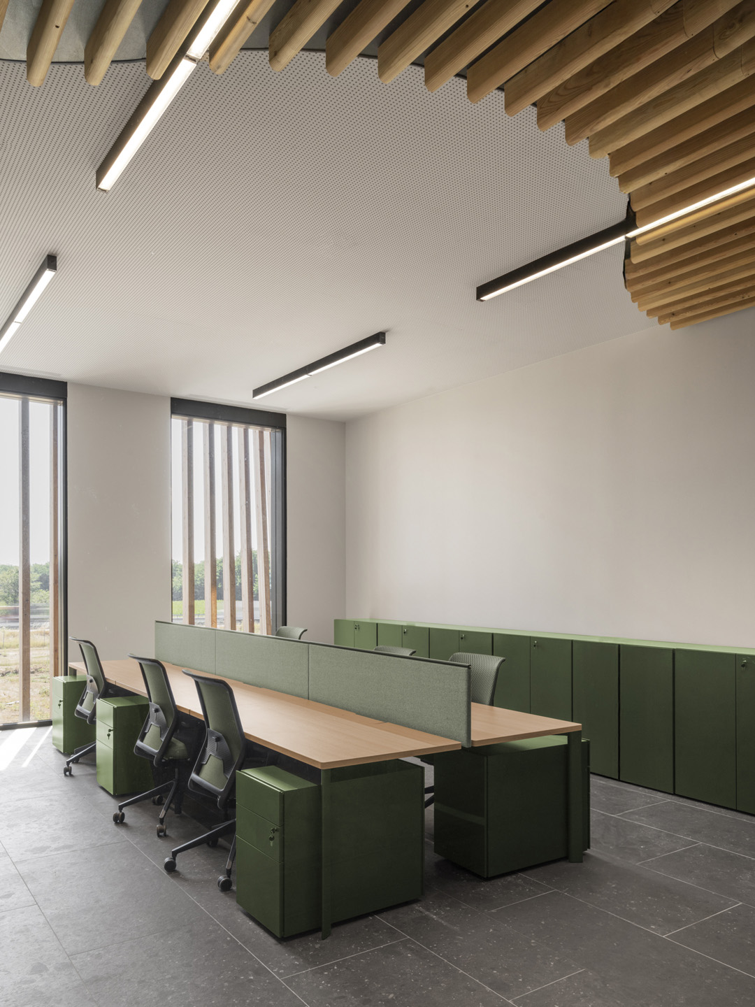For the interiors, UniFor realised an extensive range of tailored furniture solutions: 47 Flipper Bench workstations configured as single, double, four-person, and six-person units, including dedicated stations for the break area, together with 6 Flipper executive desks.