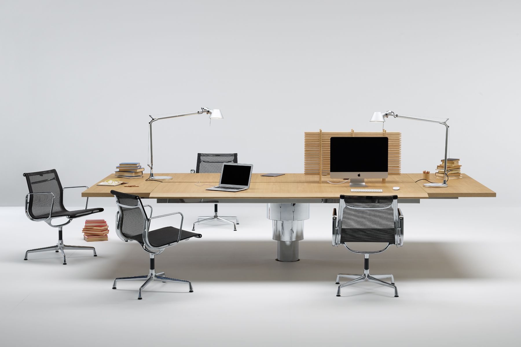 Così Michele De Lucchi sintetizza Teamer, programma di tavoli operativi per ambienti di lavoro contemporanei orientati alla flessibilità di utilizzo, alla condivisione e alla leggerezza formale. Qualificato da un design essenziale e da raffinate soluzioni costruttive, il tavolo sembra spuntare dal suolo e volare leggero, come un piano sospeso nel vuoto, sorretto da un’unica struttura metallica centrale composta da elementi cilindrici degradanti dal sottopiano alla piastra di fissaggio posta sotto il pavimento sopraelevato. Caratterizzato da dotazioni tecniche esclusive, il tavolo utilizza in modo diffuso una tecnologia nascosta, che assicura elevate prestazioni funzionali, in grado di favorire il benessere della persona che lavora.