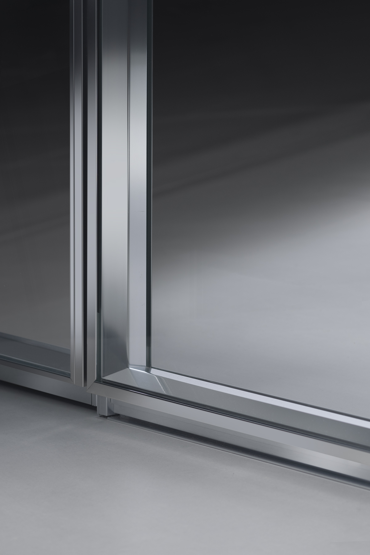 The SC&A sliding door system consists of overlapping sliding panels with a folding closing system. The synchronised operating mechanisms guarantee silent and gradual movements when doors are opened and closed. Characterised by great visual permeability, the system efficiently divides and organises differentiated functional areas, maintaining climate and sound control.