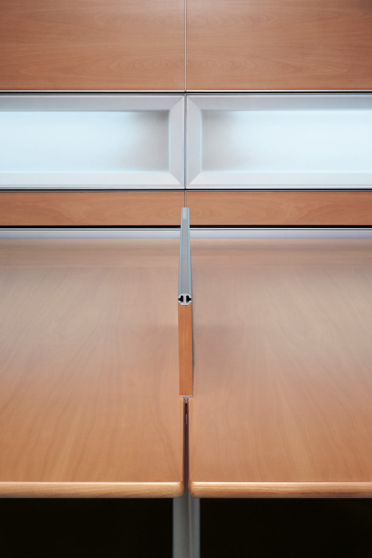 Produced in various formats and sizes, the Easy series of desks, tables, and auxiliary tables offers simple and innovative compositional solutions that accommodate the various working styles of the contemporary office in dynamic and comfortable open-space, secluded, and enclosed office environments. The choice of two different table edge treatments (rounded and sloped), which simplify connections between elements, and two types of support (a thick column – conical at its base and anchored to the ground by means of a steel plate with lenticular section – and a closed side panel) facilitates the composition of group configurations, thus increasing the flexibility of the spaces. The system is completed by cable baskets beneath the tops, which also accommodate the power and data outlets.