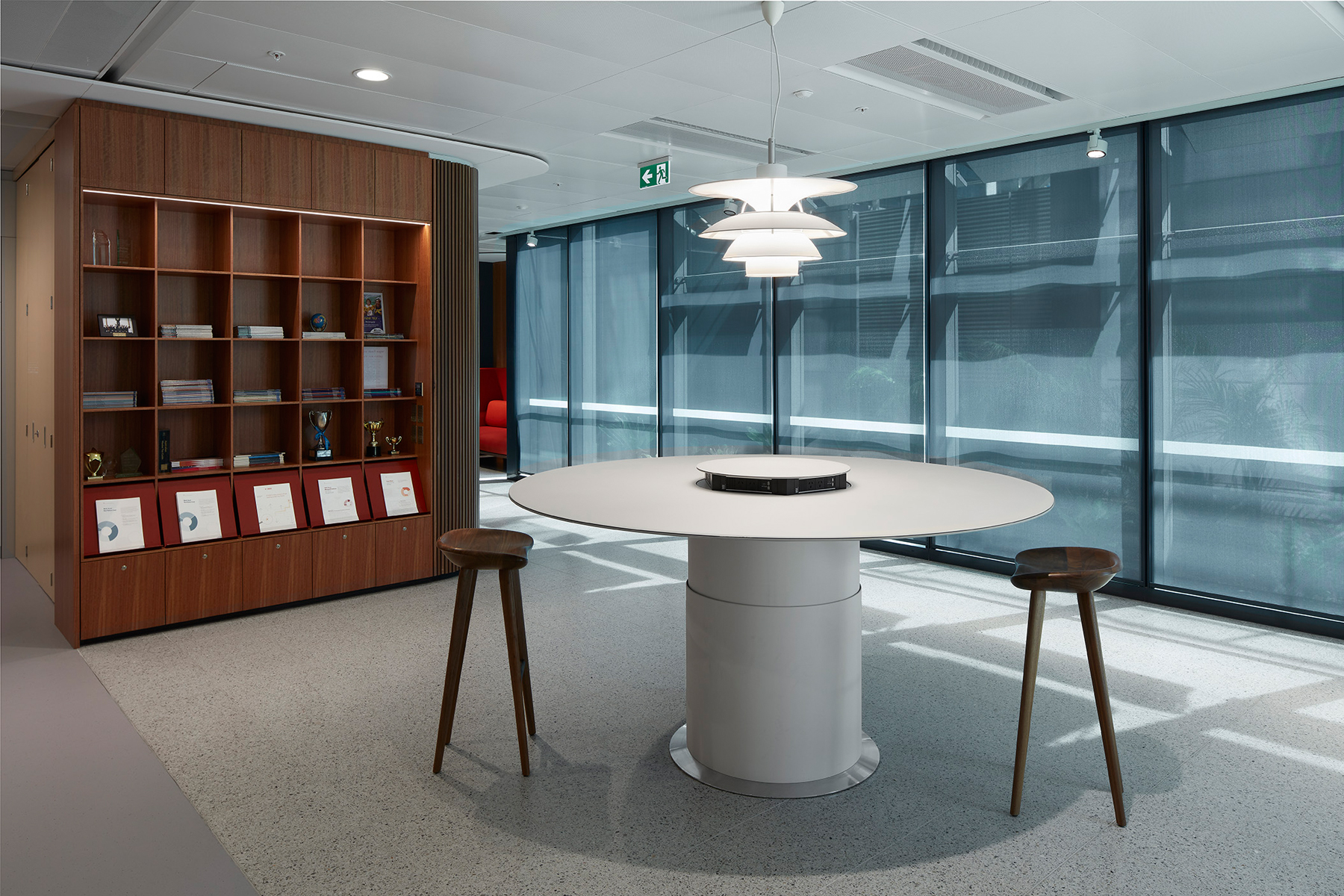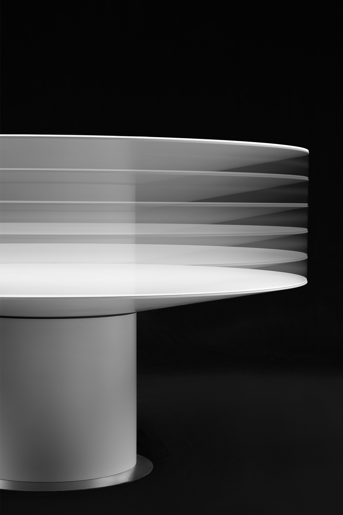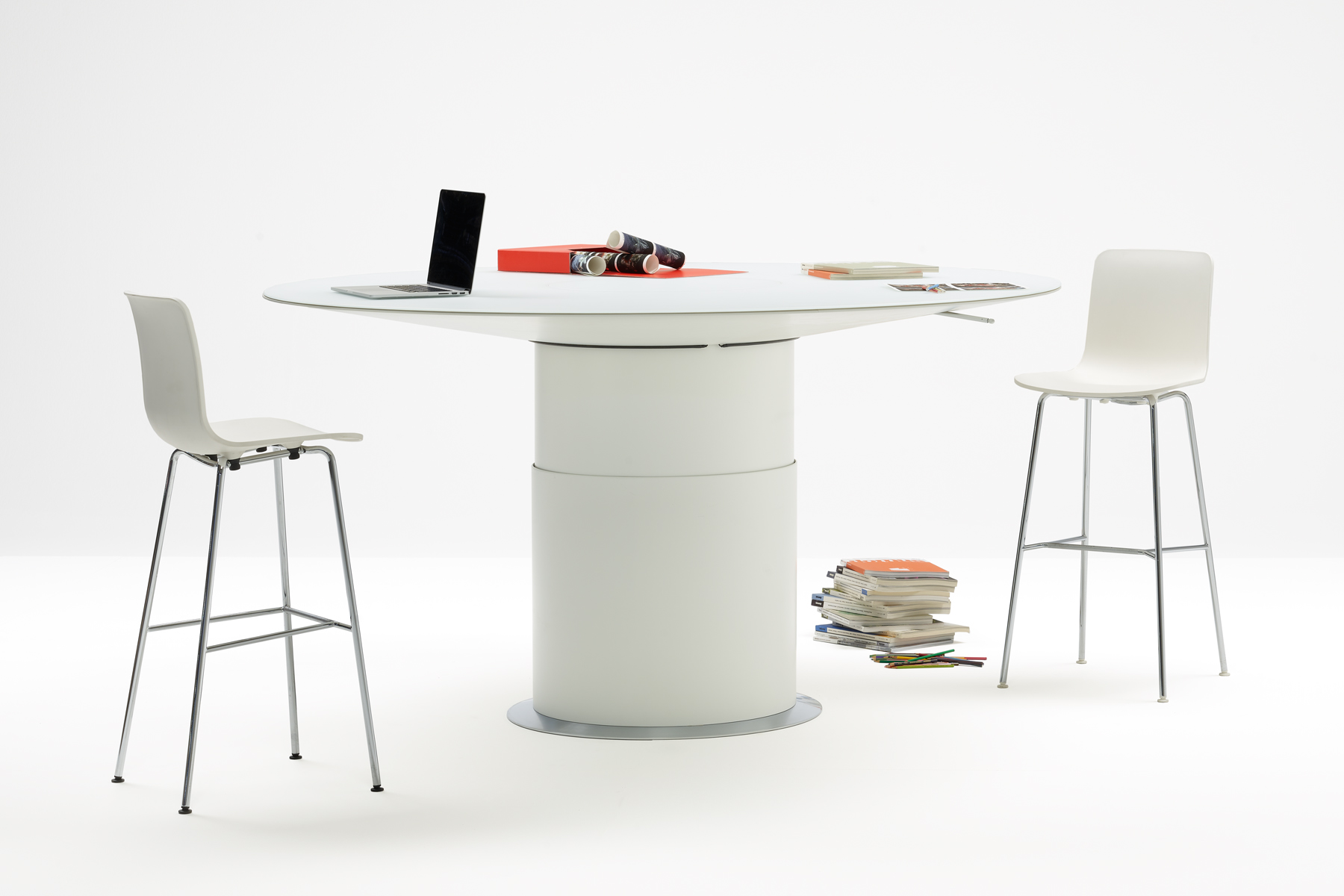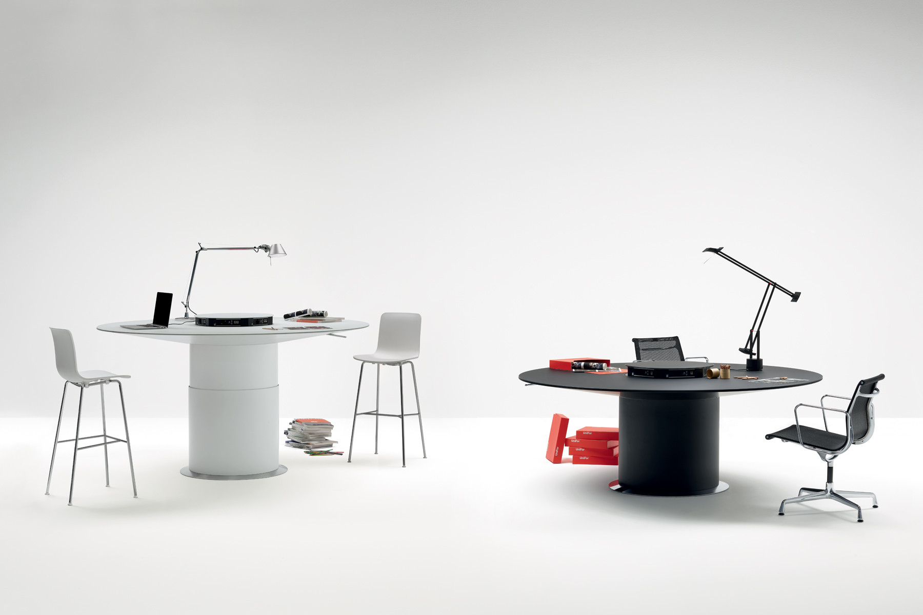 The central structure makes it possible to alter the height of the worktop, thus enabling different ways of working, with both seated and standing configurations available.