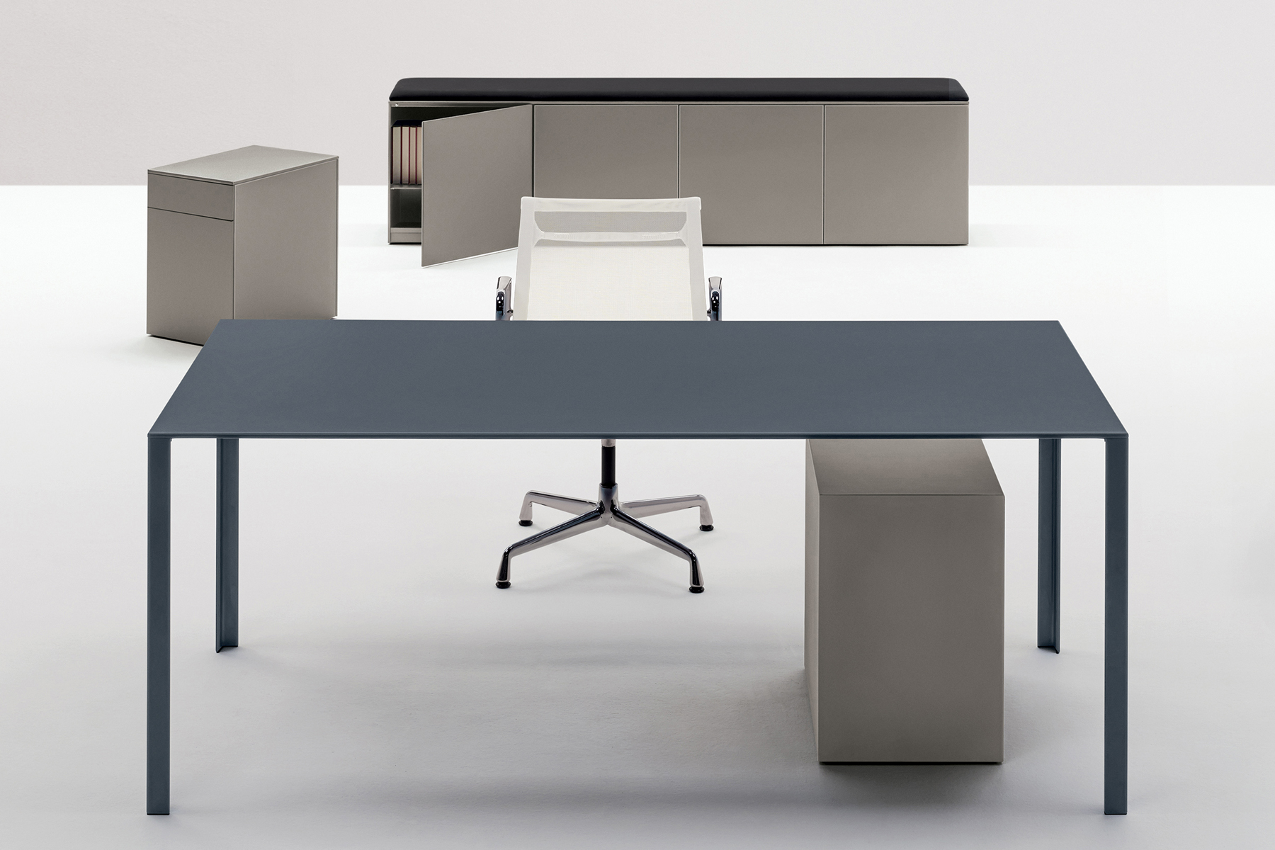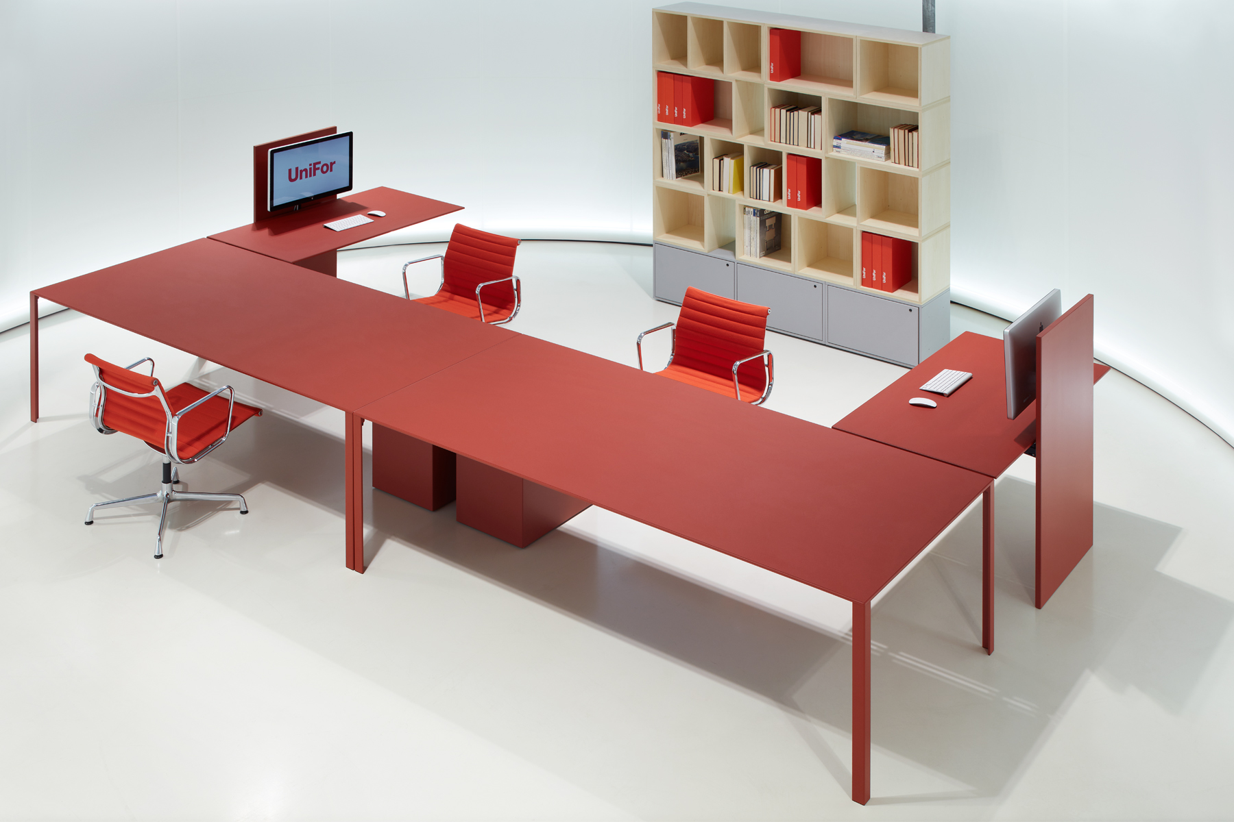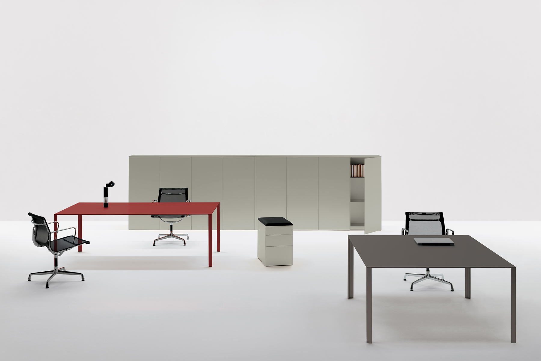 LessLess Color supplements the LessLess series with new pieces designed to complement the workstations, while extensive development work has resulted in a range of eight stunning colours. The new workstations, which are available in a range of different sizes (square, rectangular and L-shaped), feature an exclusive worktop with integrated Forbo linoleum insert in the same colour as the aluminium structure. Completing the series is a range of tables equipped with cable access, a leg designed to allow wiring to pass through it and a basket for organising the cabling. These solutions serve to conceal the technology, which is always there yet never on show.