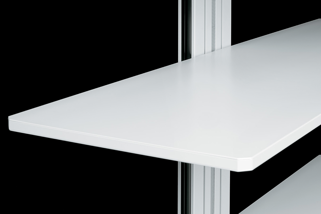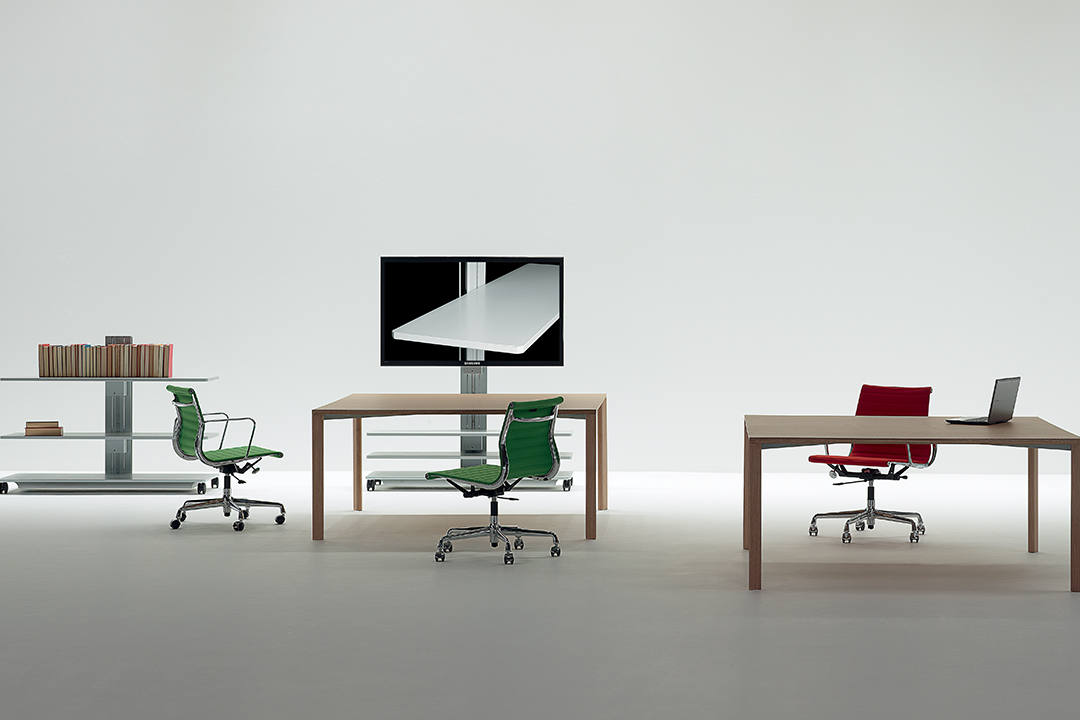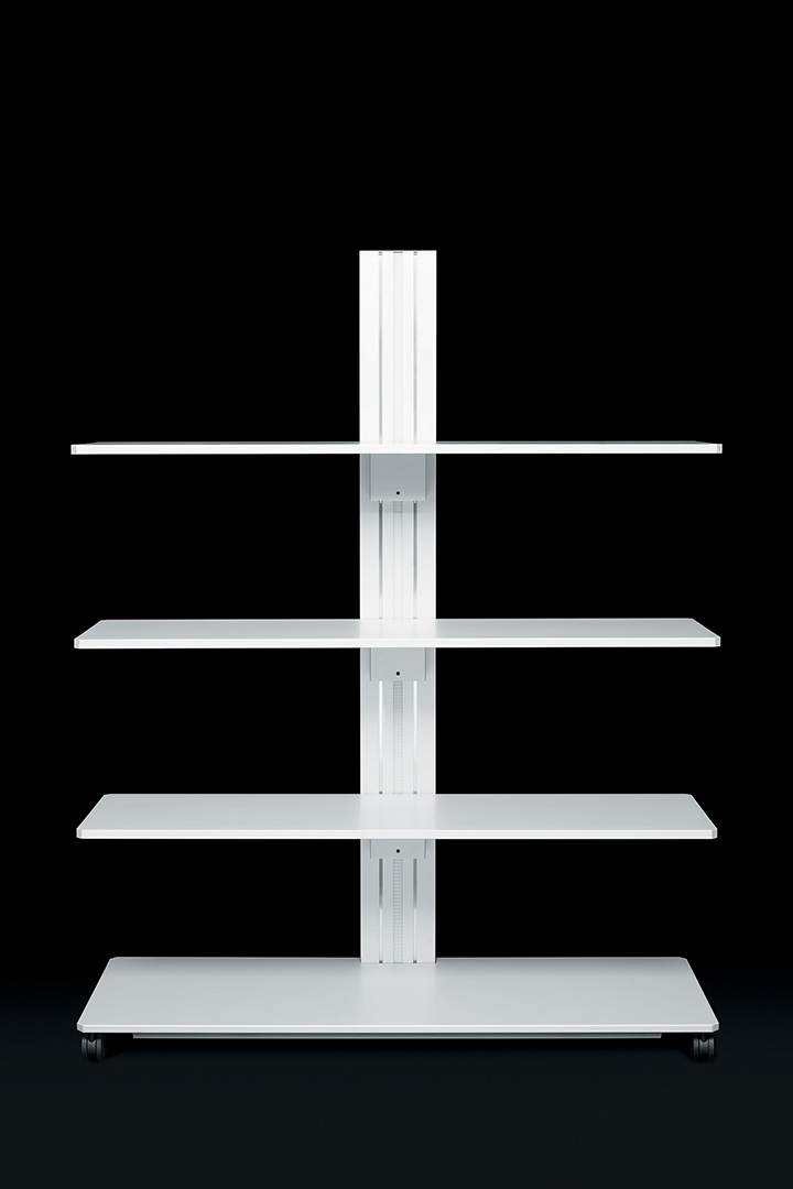 Flexible, functional and enhanced by minimalist forms, these accessory elements are designed to meet the needs of a work environment in constant evolution, where task and relational activities coexist. Available in three heights, the trolleys consist of: a solid metal support structure that conceals simple adjustment mechanisms; a base with compartment containing the power and data outlets, easily accessible by sliding the bottom shelf to one side; shelving that can be raised and lowered even with equipment already in place; special coaxial wheels that ensure high stability, whether the trolley is stationary or in motion.