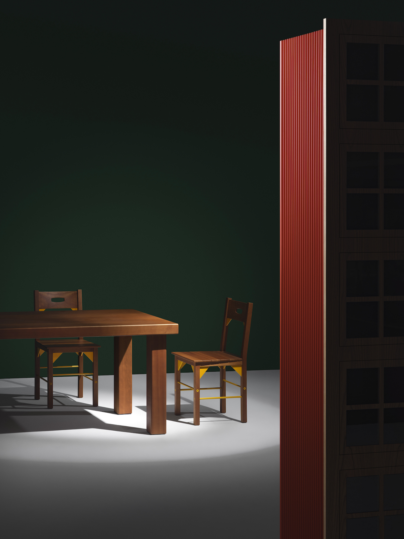 Museo, with or without arms, is an essential wooden chair, designed to accommodate visitors in need of a refreshing break during their tour of the museum. Special characteristics include the use of American cherry and the striking accents created by the deep yellow hue of the triangular reinforcing elements and dowel-shaped rungs. Holes in the lateral reinforcing elements permit the chairs to be linked together.