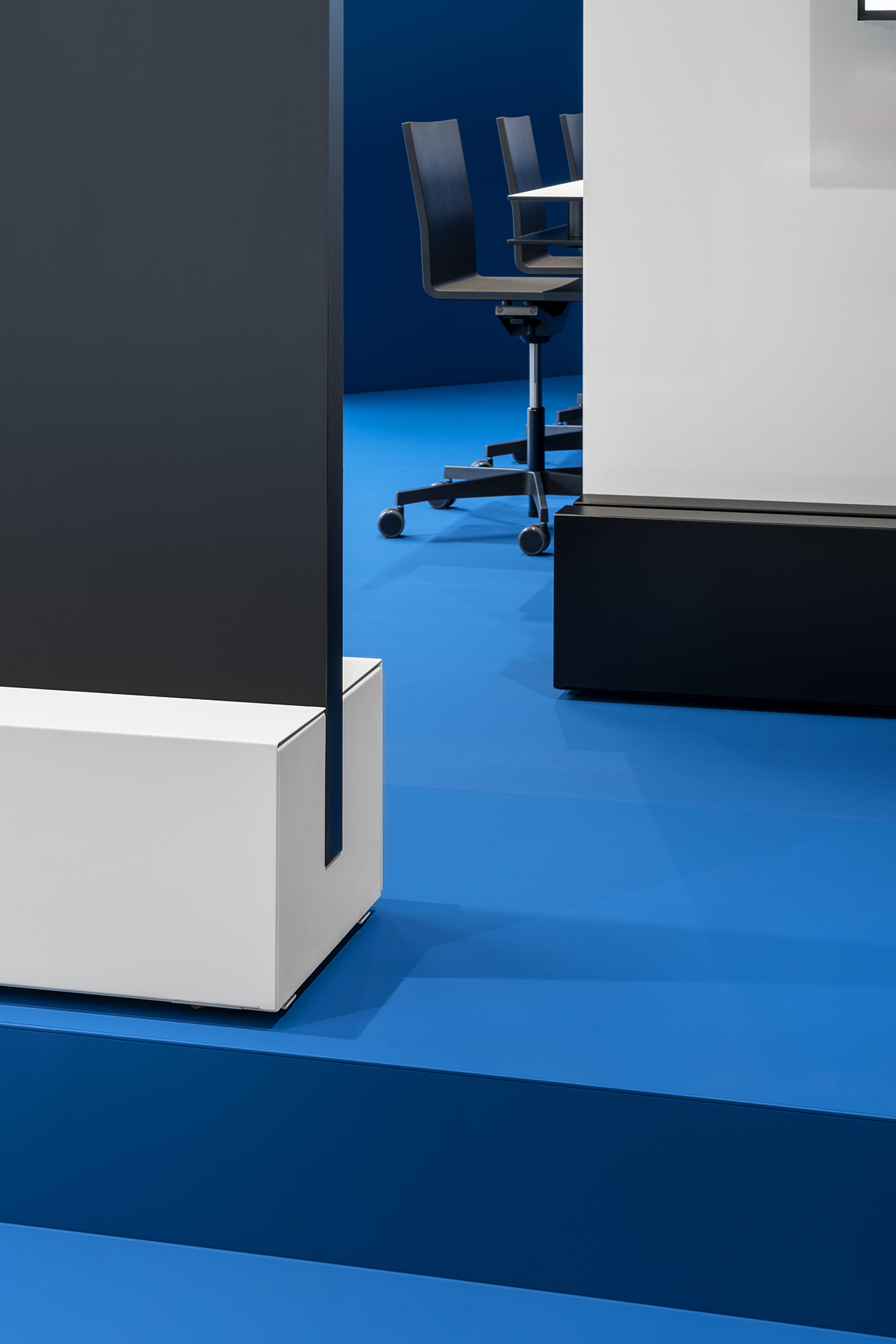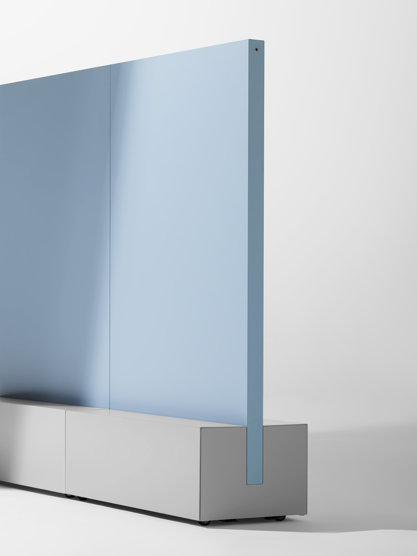 The screens, with their multifunctional base, become magnetic writable whiteboards, acoustic panels, audio and video supporting modules, planters, coat hangers and floor lamps.