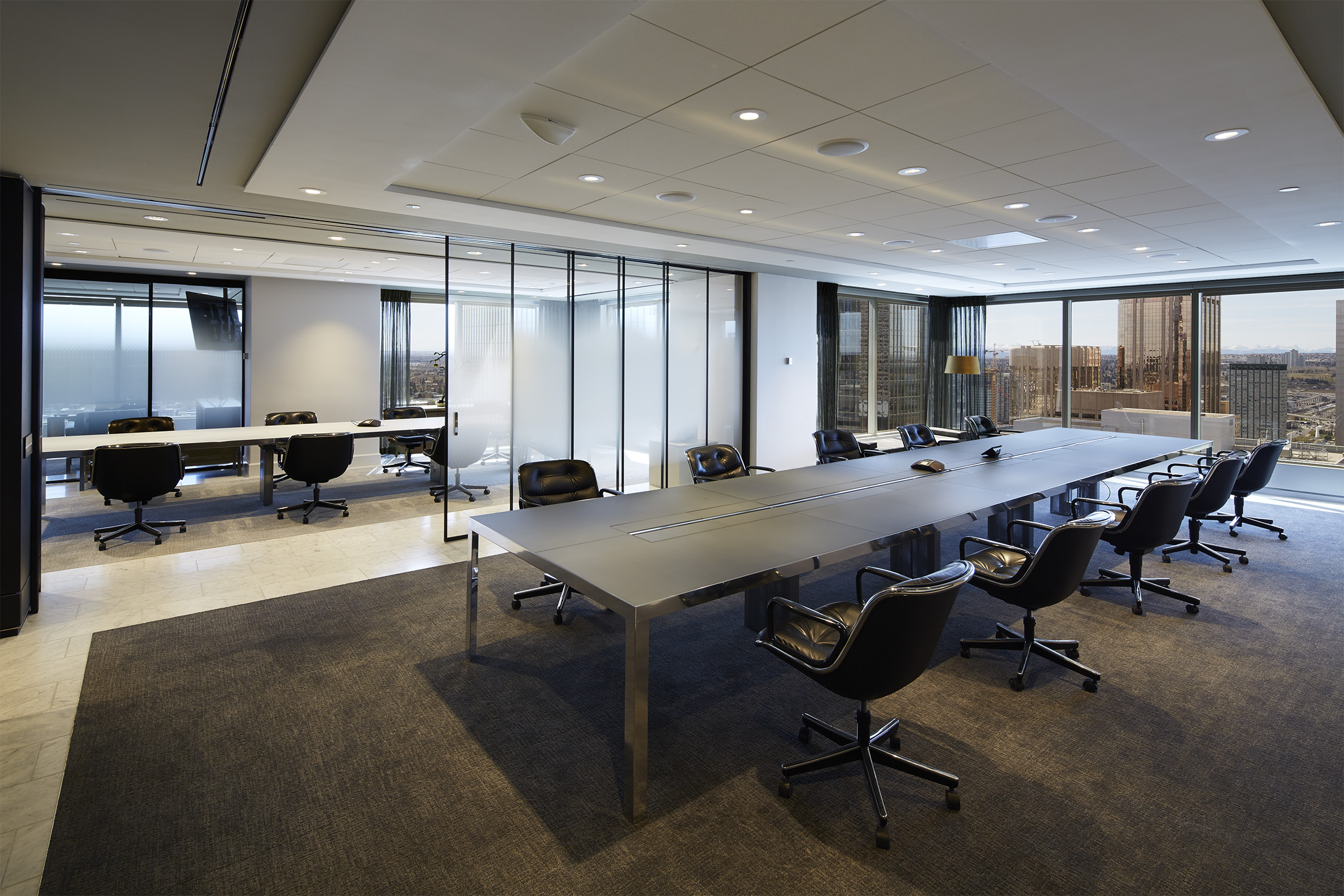 Reserved meeting rooms become open space work areas when the large doors are opened. Supersincro sliding door system consists of a maximum of five framed glazed panels hung from the upper profile and connected to each other at the base by a metal connection element that allows a perfect alignment and a synchronized overlapping opening and closing action.