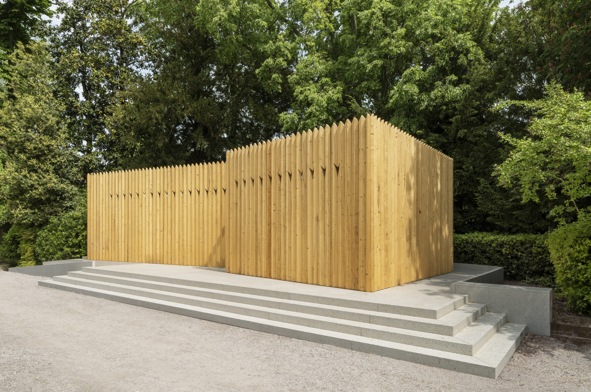 The pavilion, measuring approximately 200 square meters and located within the Giardini of the Venice Biennale, is designed as a space that leverages natural air circulation.