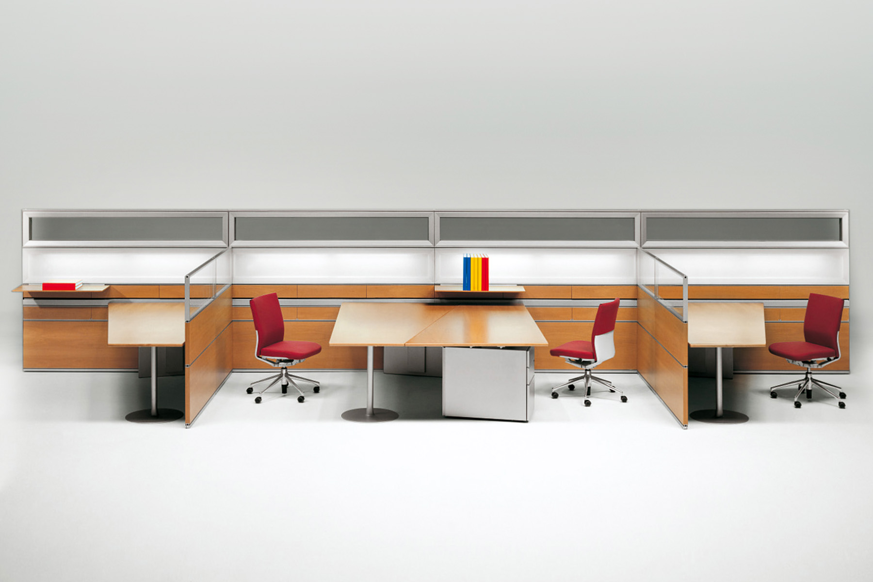 Produced in various formats and sizes, the Easy series of desks, tables, and auxiliary tables offers simple and innovative compositional solutions that accommodate the various working styles of the contemporary office in dynamic and comfortable open-space, secluded, and enclosed office environments. The choice of two different table edge treatments (rounded and sloped), which simplify connections between elements, and two types of support (a thick column – conical at its base and anchored to the ground by means of a steel plate with lenticular section – and a closed side panel) facilitates the composition of group configurations, thus increasing the flexibility of the spaces. The system is completed by cable baskets beneath the tops, which also accommodate the power and data outlets.