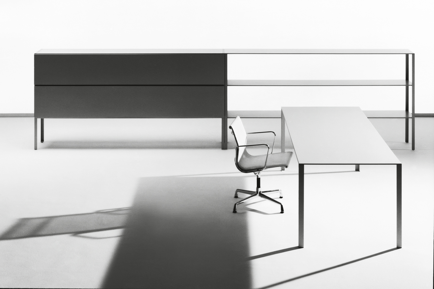 Designed to represent the archetypal table, the Less table is so sleek that it leaves you questioning its solidity – and its very nature. An abstract, monolithic structure made entirely from metal, Less’ design is distilled to its simplest form through the adoption of smooth surfaces and compact profiles. Available in different sizes and in square and rectangular versions, the table can also be used as a workstation. An extension worktop can also be added to create an L-shaped configuration.
