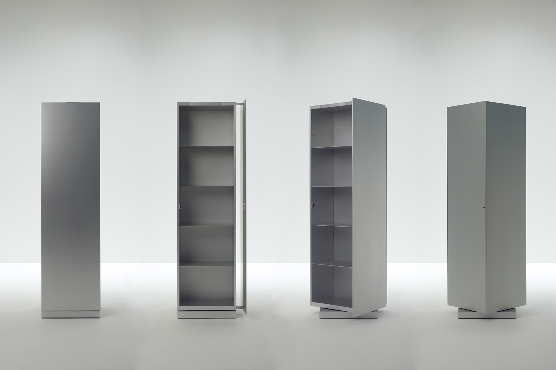 In addition to workstations and executive desks, the modular Less system also features a range of innovative accessory pieces. With the geometric essence of flat surfaces and regular parallelepipeds and the solidity of the metal structures, these pieces organise our day-to-day work spaces discreetly yet effectively. The unit with three drawers, one of which is designed specifically for storing folders, features a hinged rear panel for storing cabling and can be finished with sliders or wheels. The rotating towers on fixed bases have openings on both sides, with the doors shifting from one side to the other in order to ensure the space is taken full advantage of, thanks to a patented mechanism. As of the second half of the 1990s, the system was expanded with the addition of a modular bookcase, either open-faced or closed off, featuring open-out doors and available in various heights and lengths.