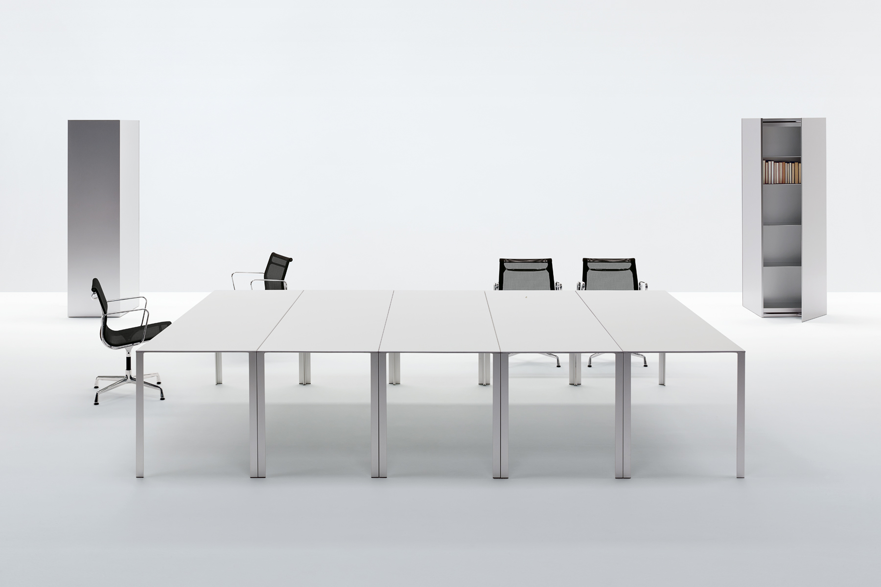Jean Nouvel offers up a fresh take on the Less series, using new materials and em-ploying sophisticated construction techniques to create the LessLess tables. Made entirely from aluminium, the pieces represent a modern vision of the contemporary office space. Abstract, monolithic, lightweight and sleek, the LessLess modular tables are available in different sizes (rectangular, square or L-shaped) and can easily be grouped together to create elegant, large meeting tables ideal for bringing a rational feel to key corporate spaces.