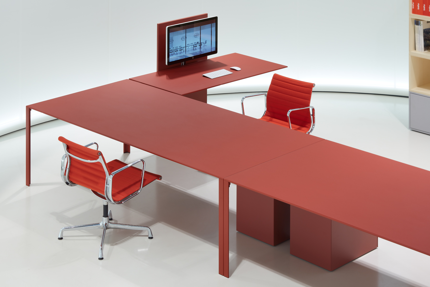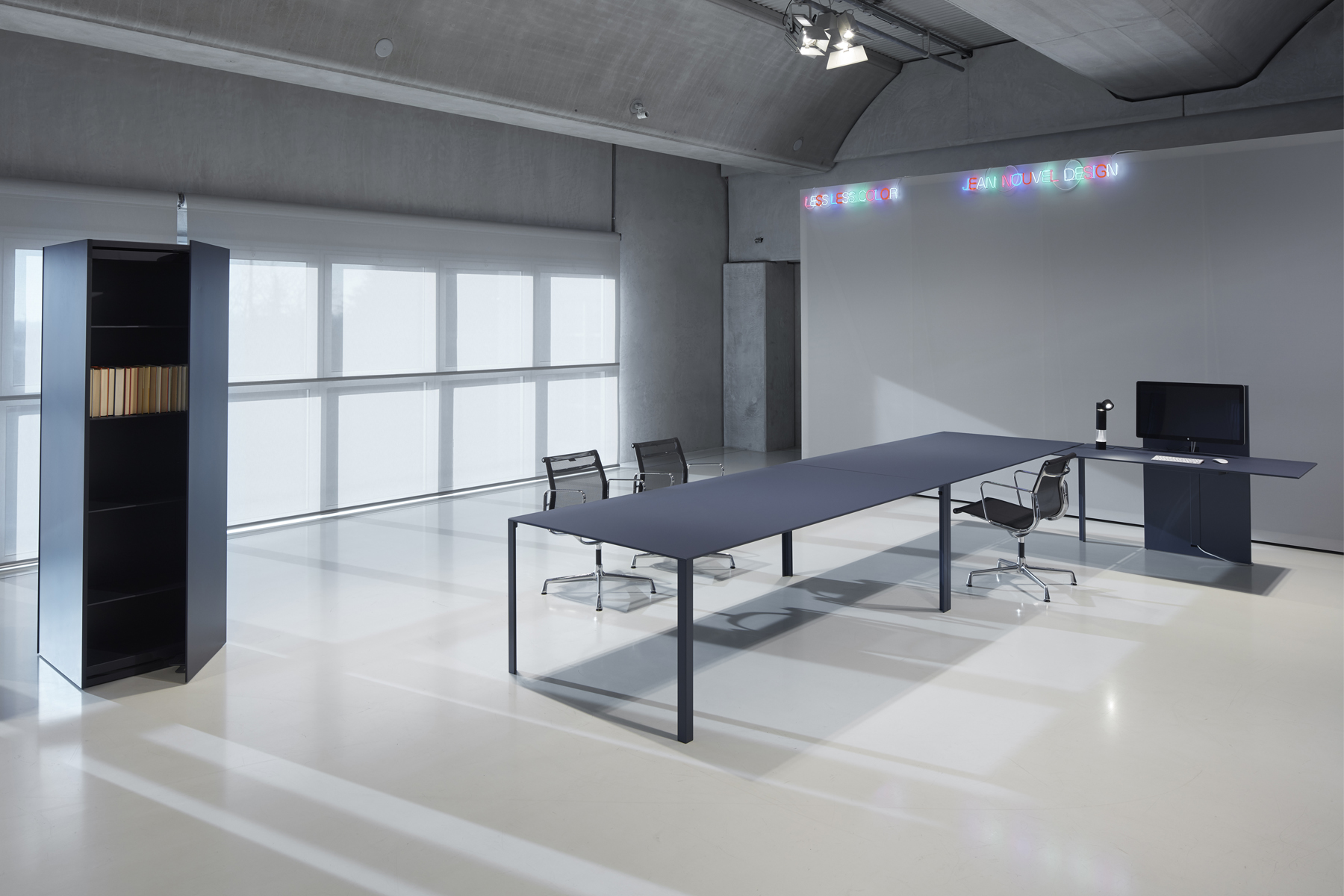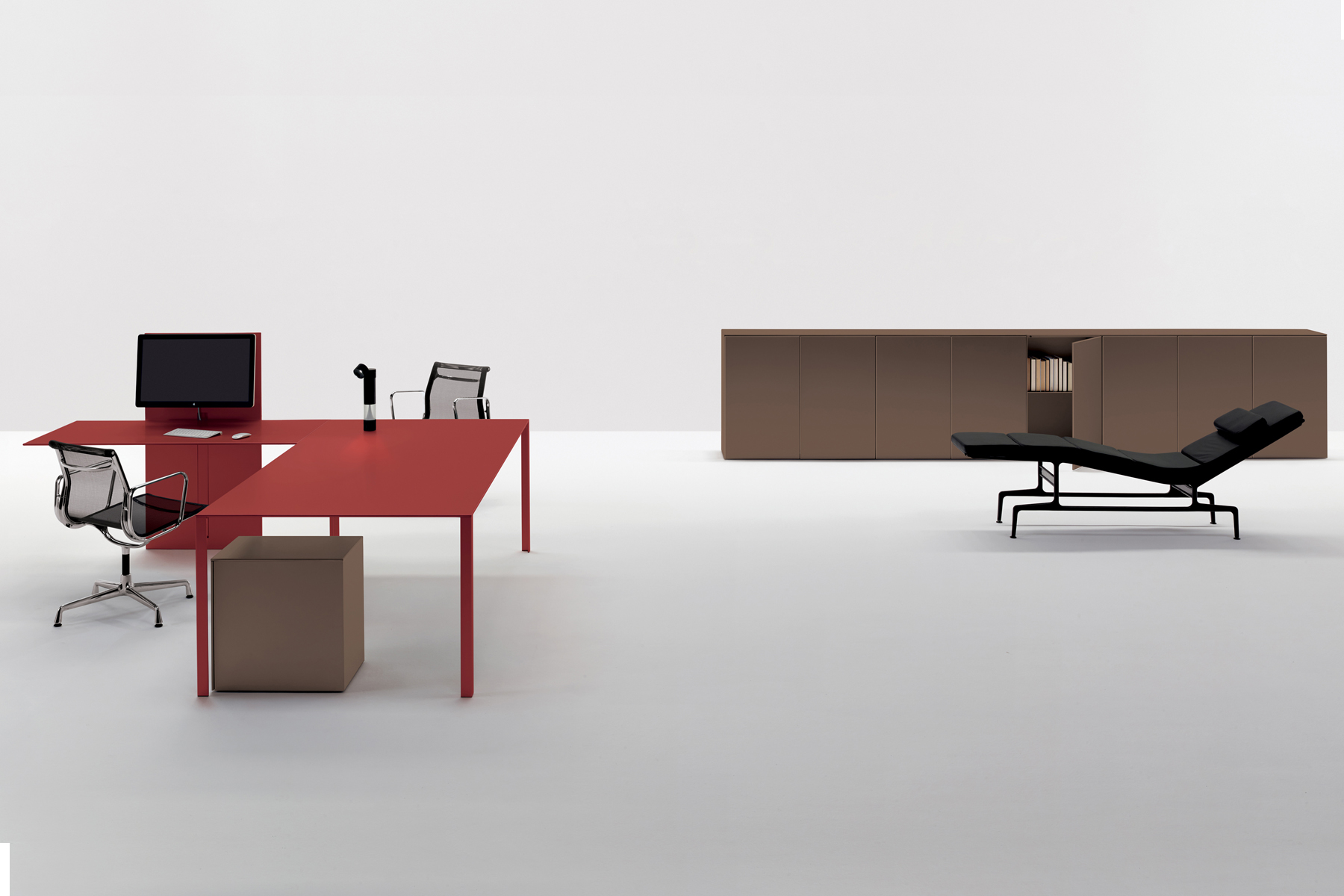 LessLess Color supplements the LessLess series with a range of eight colours – the result of extensive development work in the area. The tables, which are available in a range of different sizes (square, rectangular and L-shaped), feature an exclusive worktop with integrated Forbo linoleum insert in the same colour as the aluminium struc-ture. Completing the series is a range of tables equipped with cable access, a leg designed to allow wiring to pass through it and a basket for organising the cabling. These solutions serve to conceal the technology, which is always there yet never on show. Thanks to its clean, fresh design, LessLess Color is the ideal solution for executive spaces, where professionalism, elegance and creative freedom are of fundamental importance.