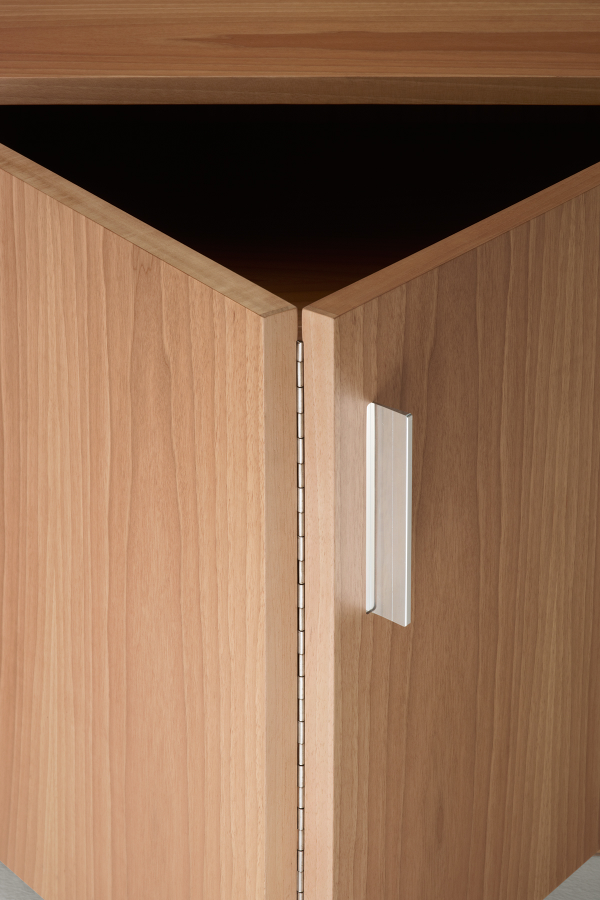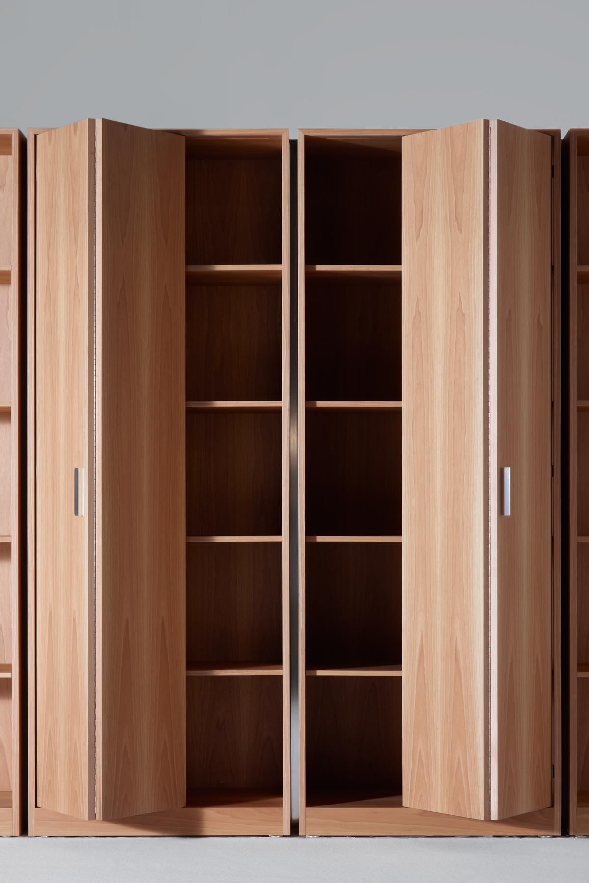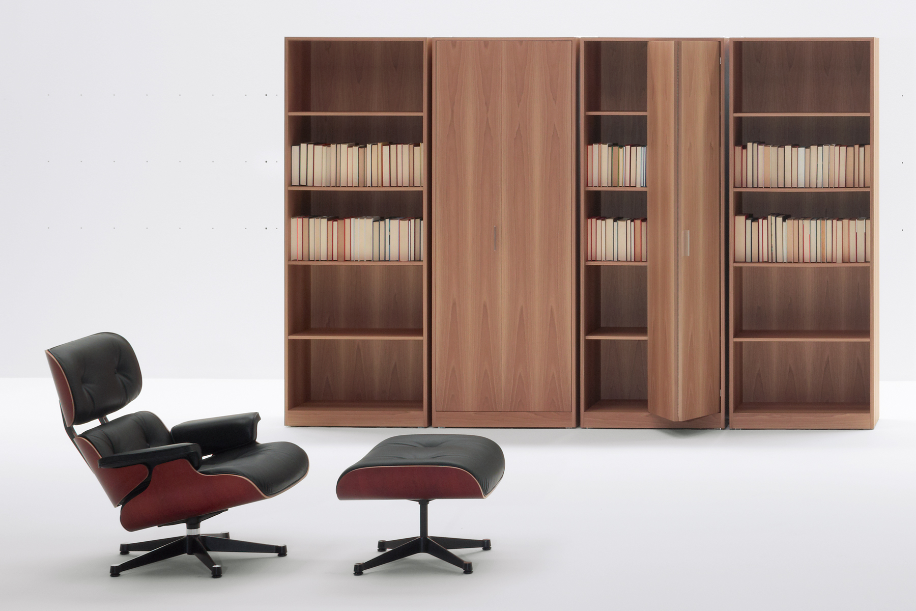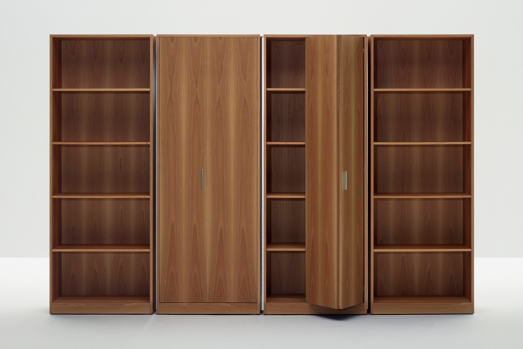 Featuring smooth surfaces and simple lines, the compact Moodway low storage piece can be opened up using its elegant hinged doors, revealing wooden shelves inside. The open-faced bookcases and filing cabinets – which also feature hinged doors – can be combined and grouped together to suit specific requirements. Each element is designed to reduce and simplify the bulk of the system, allowing the elegant, simple shapes to shine.