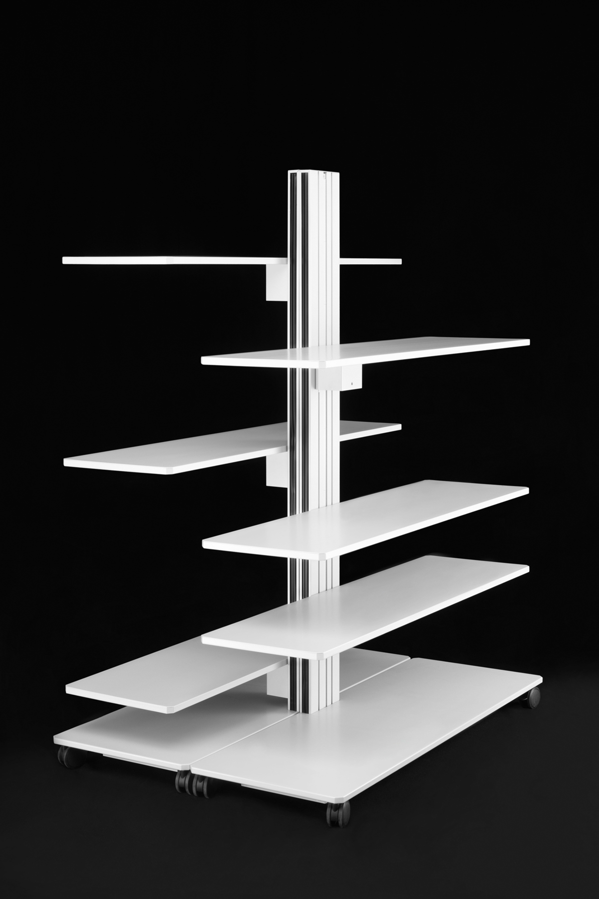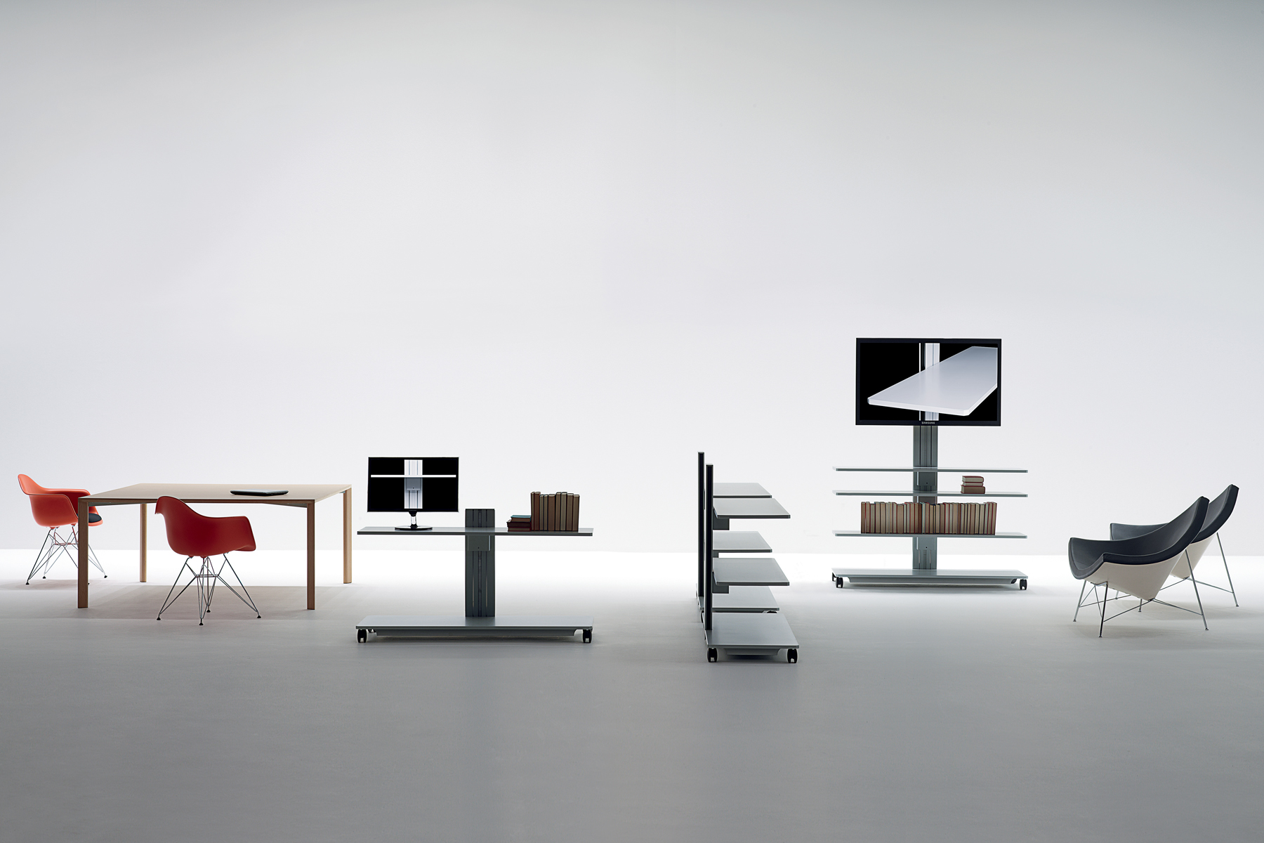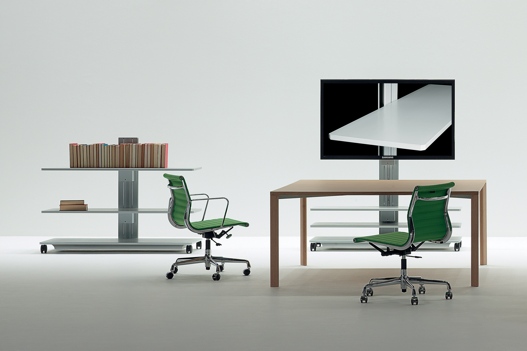 Flexible, practical and underpinned by simple design, the multifunctional Move 010 trolleys have been equipped with tech and media solutions in order to facilitate working habits. Available in three heights, Move 010 features a solid metal structure with up to three shelves, whose height can be adjusted even if equipment is already installed. The base is equipped with power sockets and special coaxial spherical wheels, which guarantee elevated stability when stationery and during movement.