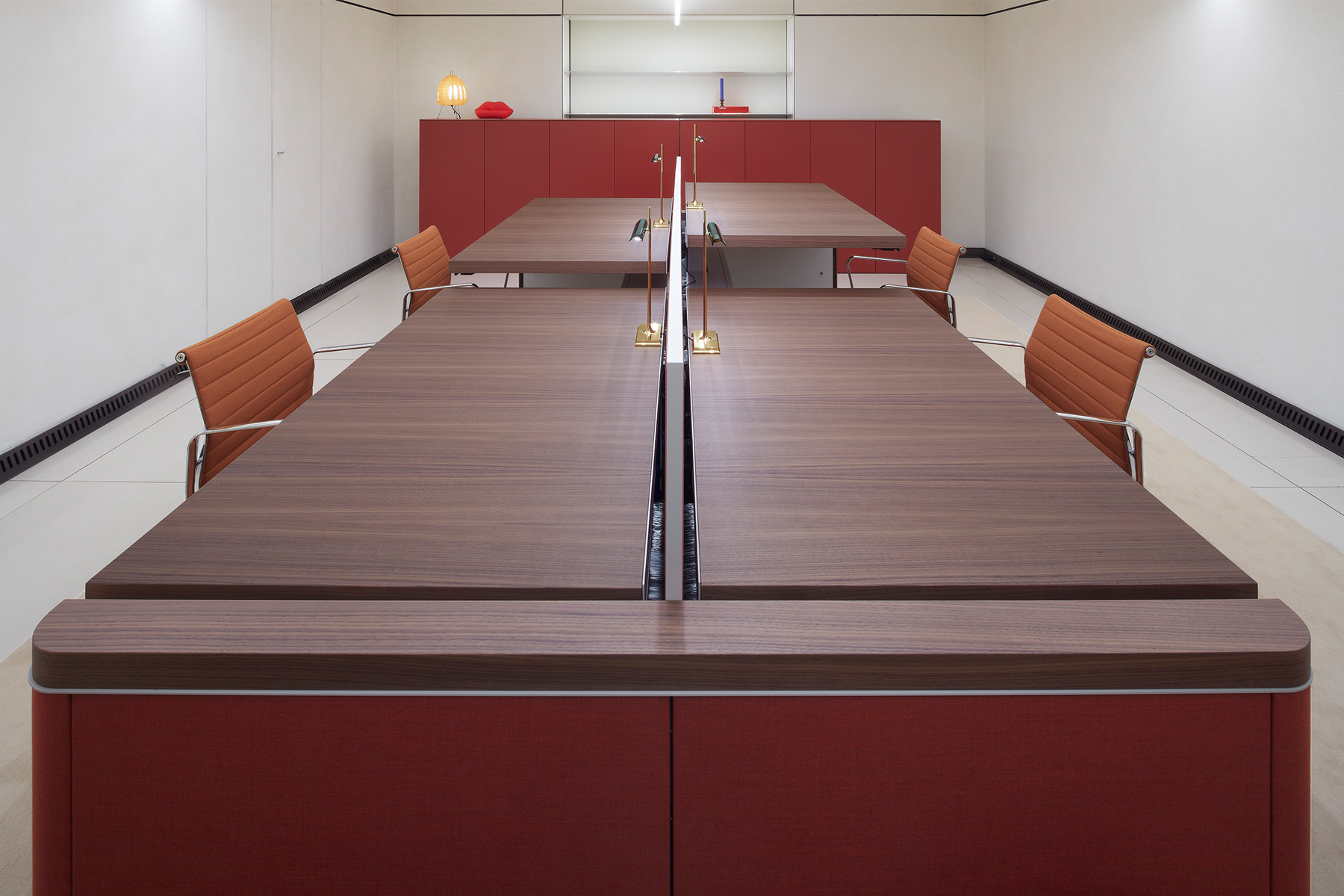 Characterised by their sophisticated use of materials, elegant structural details and carefully calibrated combinations of finishes and colours, the Signum workstations offer unbeatable solutions which are elevated by understated, refined design. Technology is a constant companion throughout the collection too, yet this never feels overpowering or forced. The items in the collection allow for a range of linear configurations and are available in a number of different sizes. The height of the worktop, which features an elegant border in solid wood, can be adjusted so that users can work both standing up and sitting down.