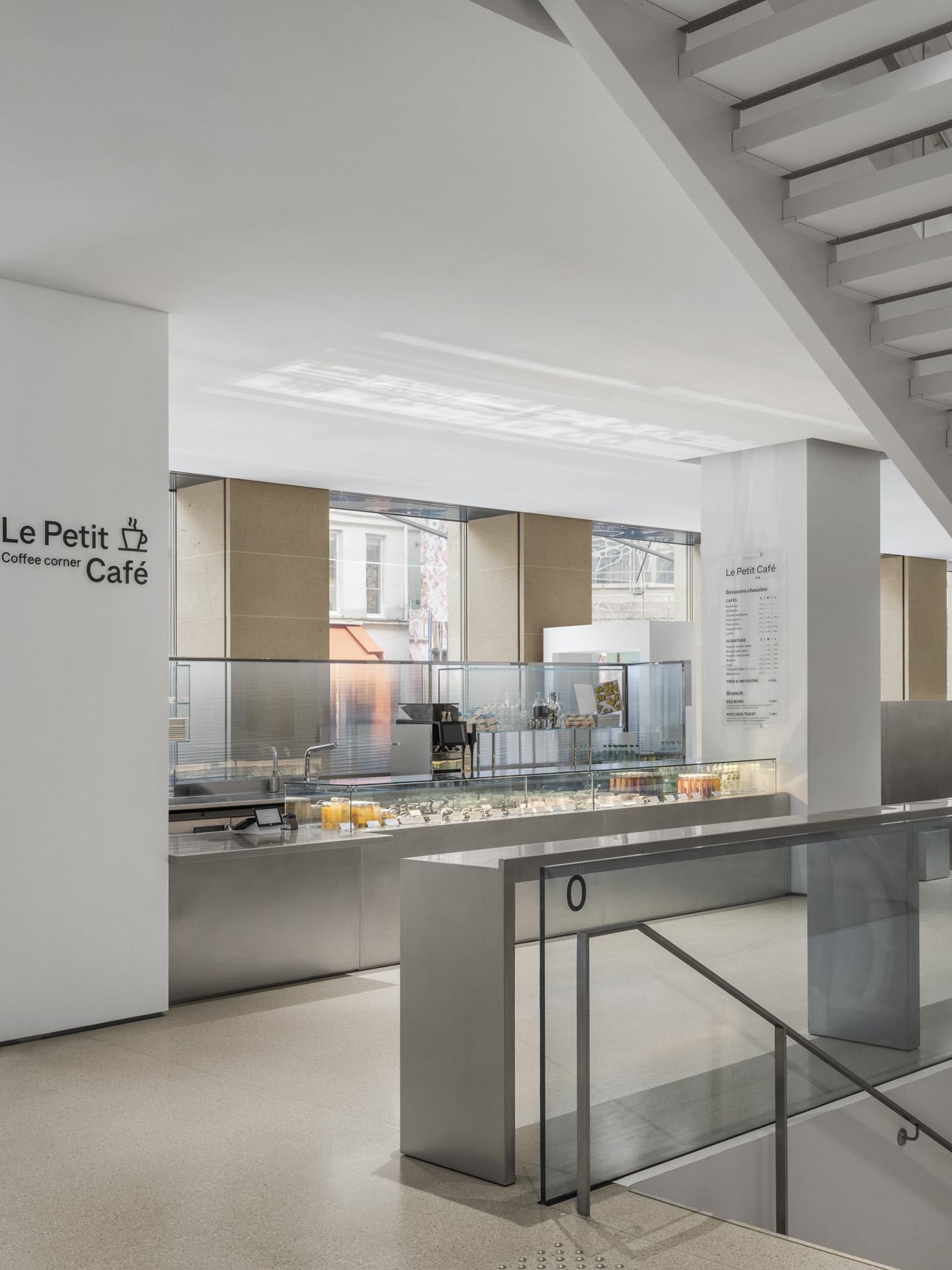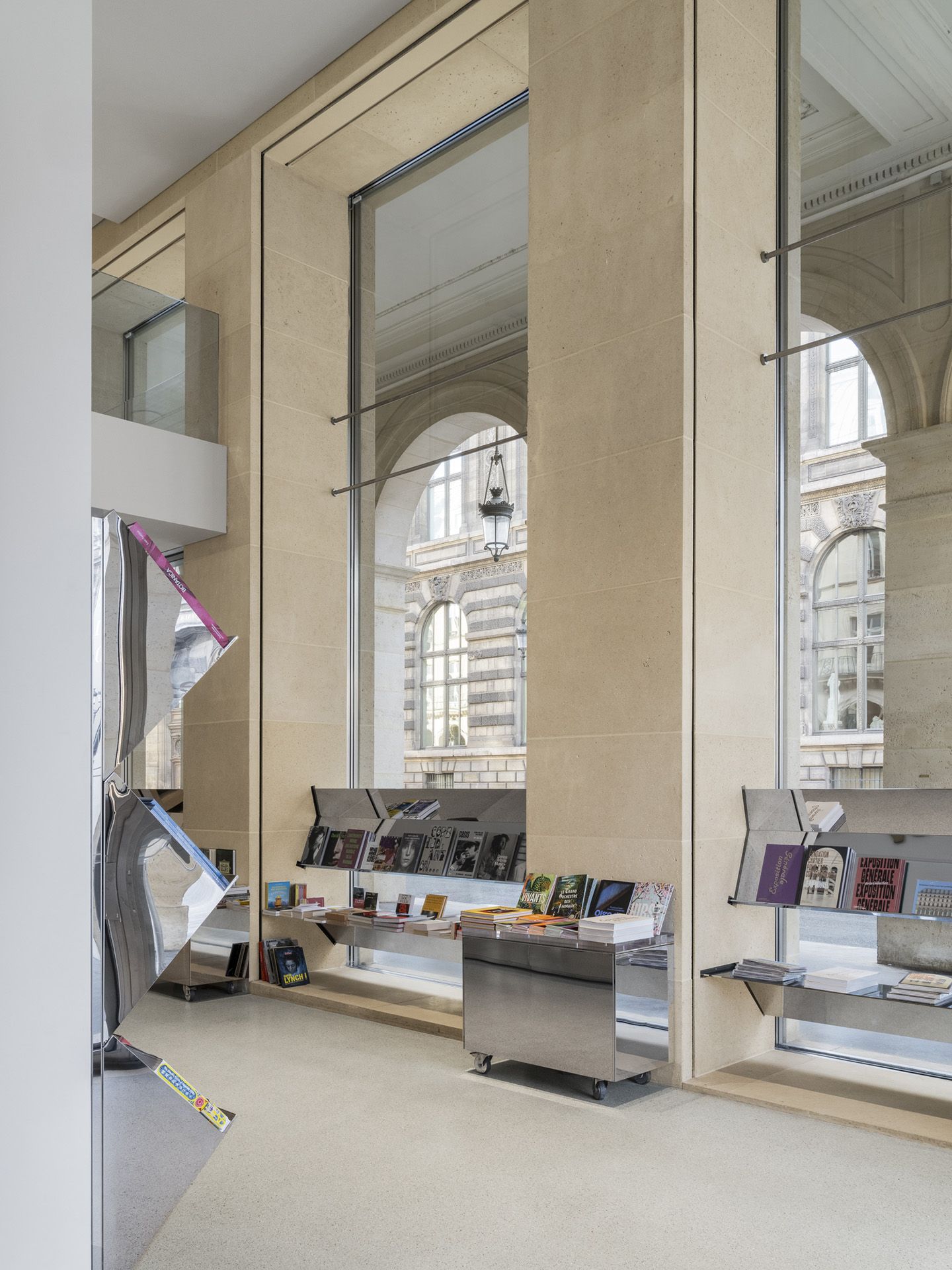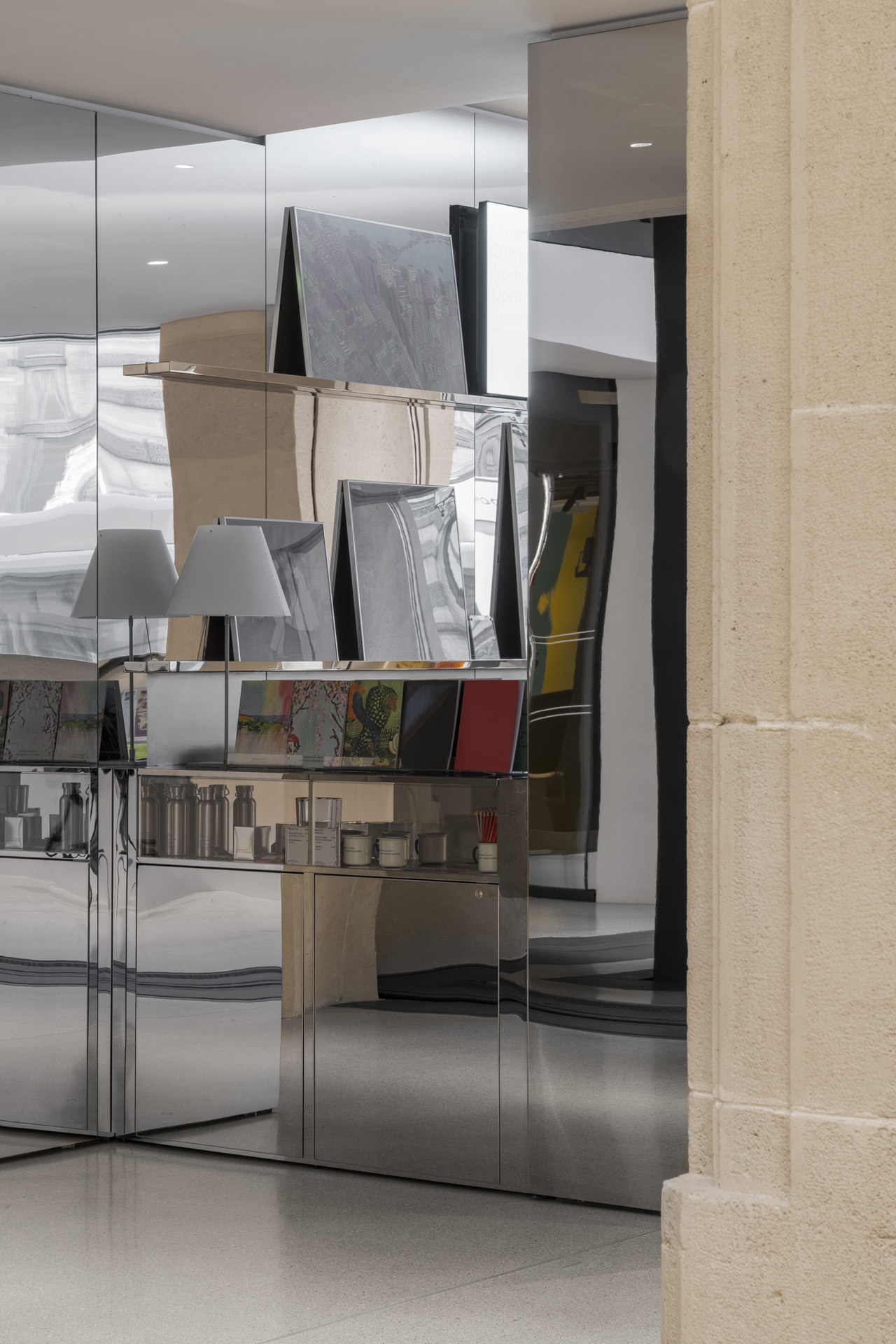 The furnishing intervention extends across the entire book exhibition area, from low steel units with plexiglass display structures for valuable volumes to shelving integrated within the shop windows. A large bookcase, engineered with refined technical expertise, transforms into a portal concealing technical rooms, while the checkout counter is composed of mirrored sheet-metal elements and removable wall-mounted shelves. The café area includes a steel counter combined with glass panels and, in continuity with the previous Fondation Cartier project, the interiors are completed by LessLess benches and tables in brushed steel.