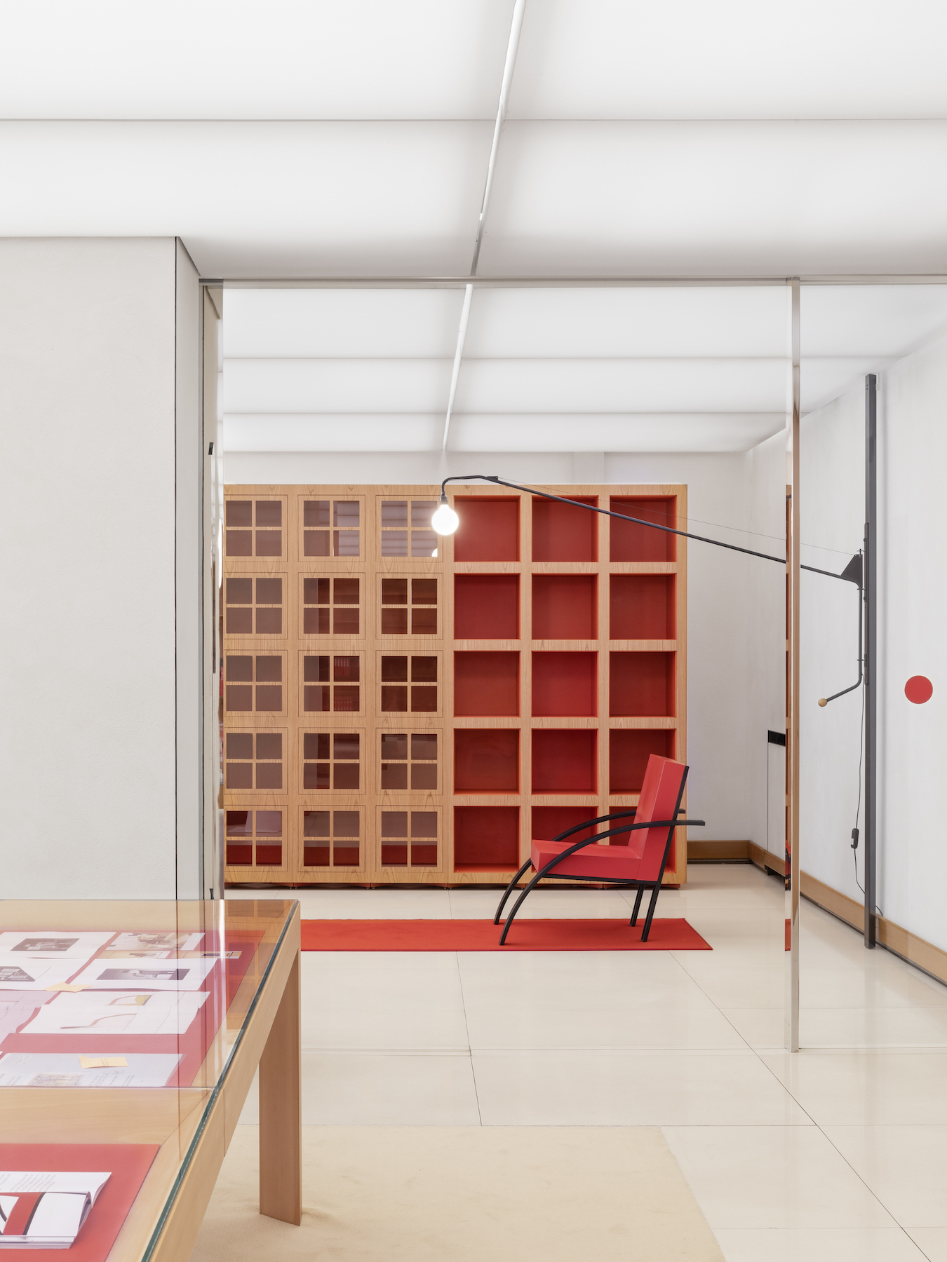 Disegnata per gli spazi del Bonnefantenmuseum di Maastricht, la libreria Cartesio è composta da scatole cubiche in lamiera verniciata, che possono essere aggregate a piacere. Una controventatura rende stabile la struttura, chiusa frontalmente da una facciata finestrata: una sorta di curtain wall ottenuto tramite la lavorazione di un solo pannello di compensato. Realizzabile su misura in differenti finiture, che si accostano ai vivaci colori, molto amati dell’architetto milanese, rosso Cina e azzurro Madonna, Cartesio permette di creare vere e proprie architetture interne.