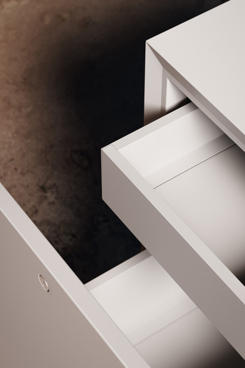 Ogni dettaglio è studiato per garantire ergonomia e usabilità, con sistemi di apertura discreti, chiusure con serratura integrata e accessori interni progettati per un’organizzazione dello spazio efficiente e intuitiva. Elemento distintivo è l’iconico frame a 45°, che accoglie la maniglia delle cassettiere, traducendosi in un segno grafico riconoscibile, comune a tutta la collezione. Il lavoro su spessori, angoli e giochi d’ombra è minuzioso, studiato per alleggerire la presenza percettiva senza compromettere la robustezza.