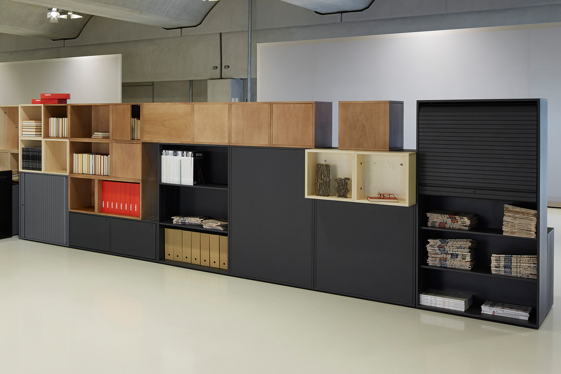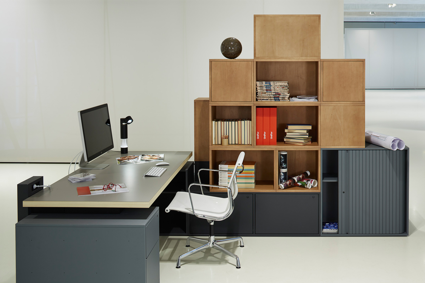 Realizzati con spalle in nobilitato, basamento, coperchio e schienale in metallo e bordatura in ABS verniciati. La chiusura a serranda avvolgibile, orizzontale o verticale, è elemento caratterizzane di questi arredi disponibili in differenti dimensioni. I piani sono in lamiera e sono regolabili in altezza. Studiata in ogni dettaglio, funzionale e dal sapore razionale la serie MT può essere coordinata con tutte le postazioni operative UniFor.