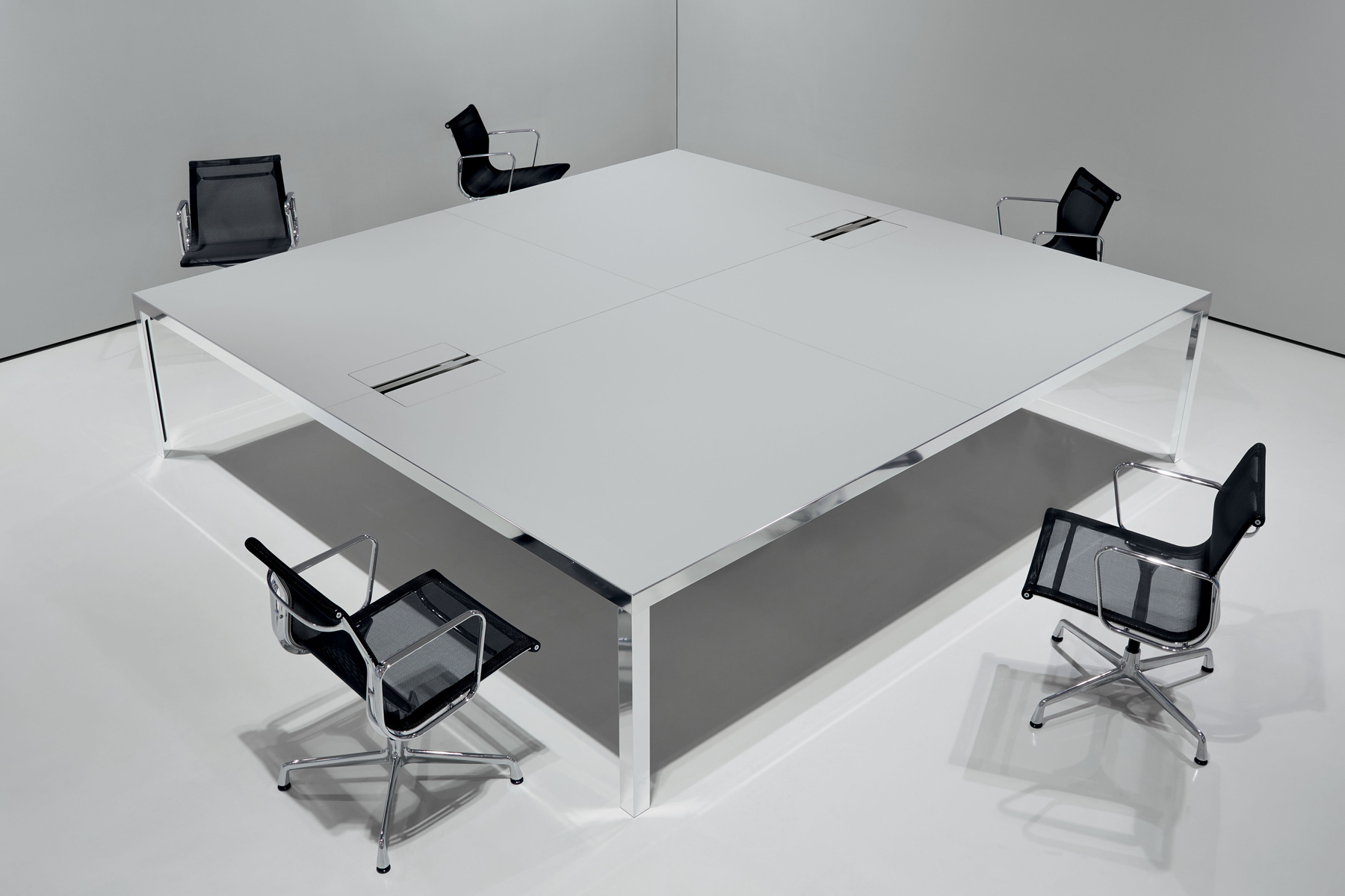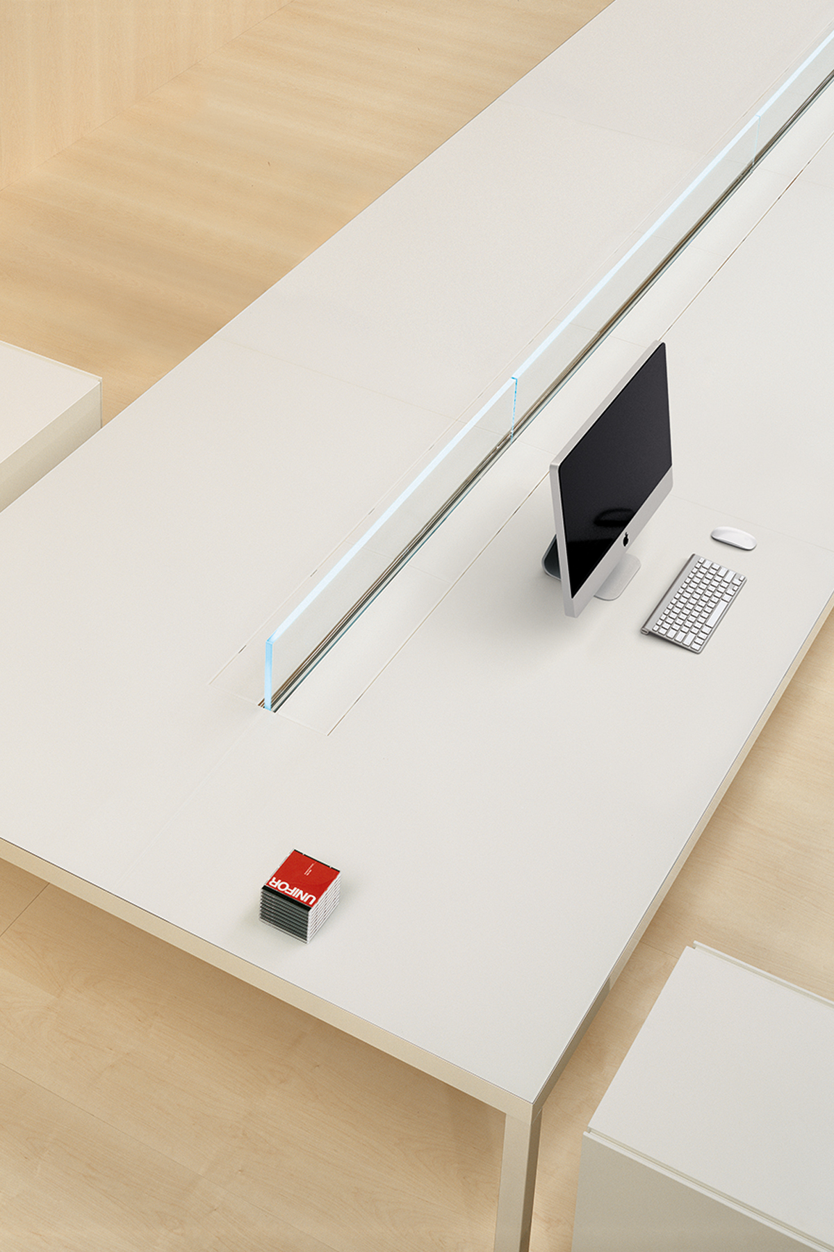 Caratterizzati da strutture monolitiche in alluminio anodizzato a sezione triangolare e rettangolare con finitura lucida, naturale o verniciata, i tavoli modulari Naòs System sono disponibili in differenti dimensioni nelle forme rettangolari o quadrate. Sportelli ribaltabili a 180° centrali consentono di accedere comodamente al vassoio sottostante predisposto per la canalizzazione degli impianti, mentre la risalita cavi può avvenire tramite i moduli appositi o attraverso l’introduzione di una gambe elettrificata. Curati in ogni dettaglio i moduli Naòs System prevedono ampie configurazioni a sviluppo lineare, ottimali per le attività di relazione, brainstorming e lavoro di gruppo tipiche degli uffici contemporanei.