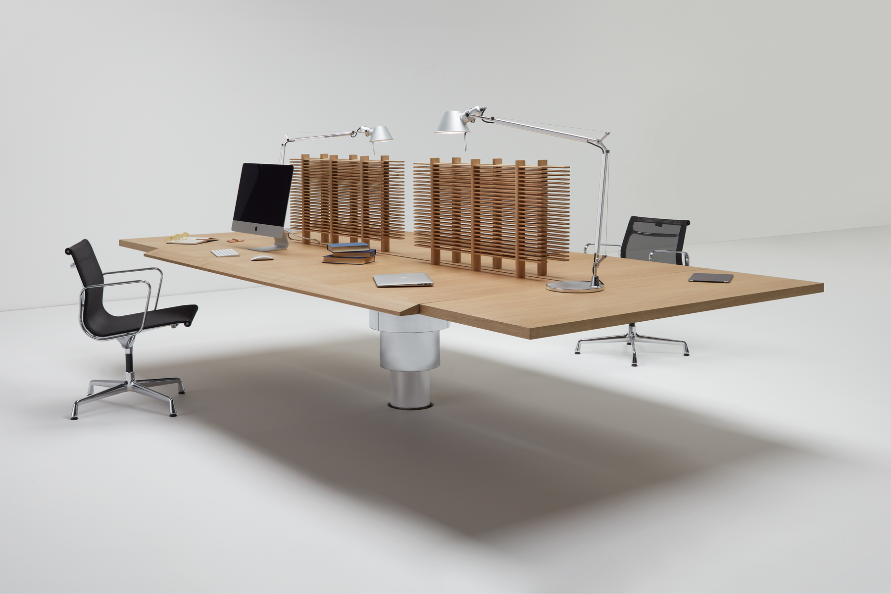Così Michele De Lucchi sintetizza Teamer, programma di tavoli operativi per ambienti di lavoro contemporanei orientati alla flessibilità di utilizzo, alla condivisione e alla leggerezza formale. Qualificato da un design essenziale e da raffinate soluzioni costruttive, il tavolo sembra spuntare dal suolo e volare leggero, come un piano sospeso nel vuoto, sorretto da un’unica struttura metallica centrale composta da elementi cilindrici degradanti dal sottopiano alla piastra di fissaggio posta sotto il pavimento sopraelevato. Caratterizzato da dotazioni tecniche esclusive, il tavolo utilizza in modo diffuso una tecnologia nascosta, che assicura elevate prestazioni funzionali, in grado di favorire il benessere della persona che lavora.