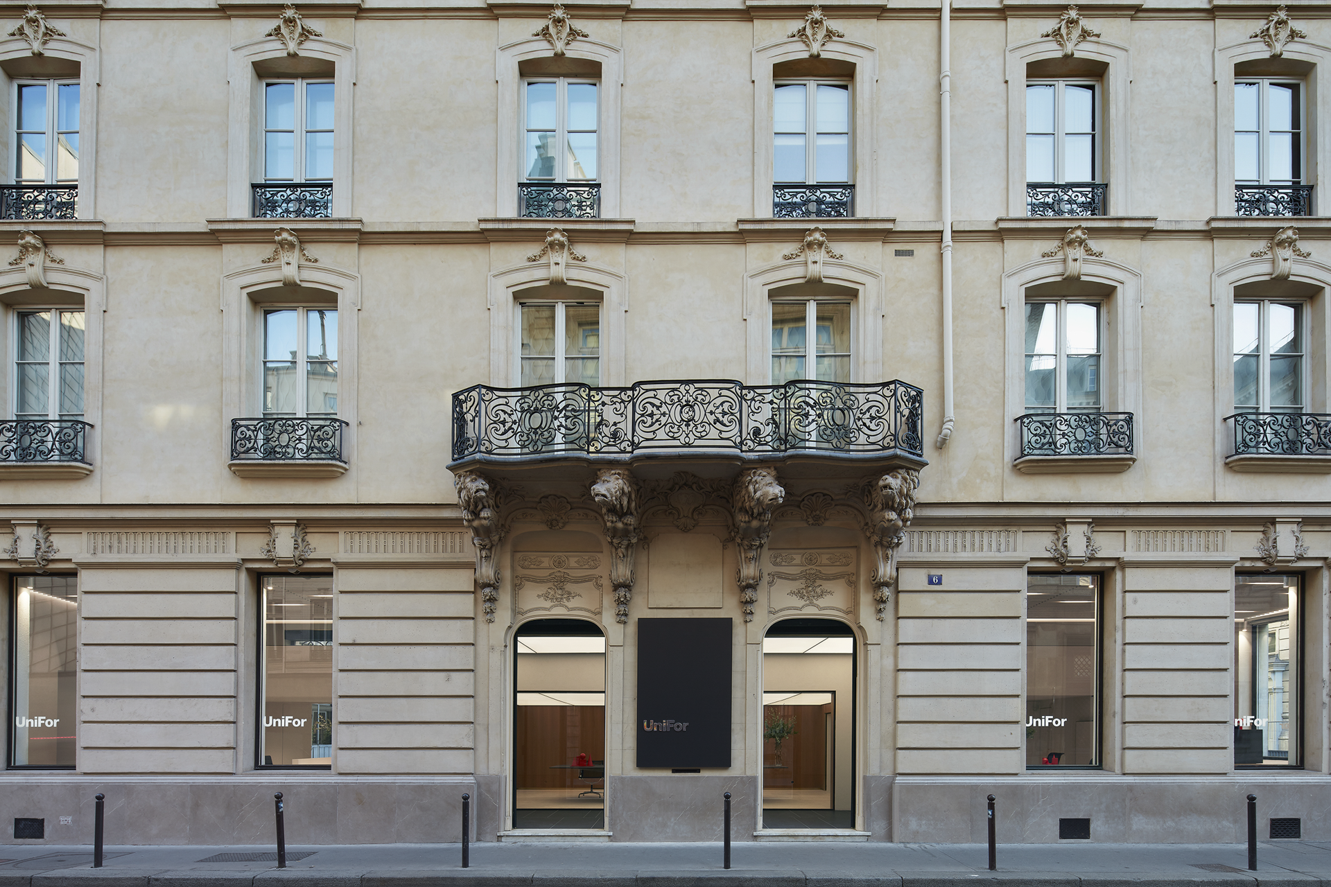 La sede della Fondation Cartier a Parigi si presenta come una struttura architettonica smaterializzata, completamente immersa nel verde degli storici giardini dove spicca la presenza del famoso albero della vita, un cedro secolare piantato da Chateaubriand. L’edificio, concepito come una semplice scatola di vetro sostenuta da un esile reticolo in acciaio, si allinea a Boulevard Raspail con una suggestiva sequenza di facciate trasparenti, poste come setti paralleli a delimitare il giardino e la struttura di nove piani con l’ampio volume vetrato dell’area espositiva e gli uffici dei livelli superiori. La leggerezza immateriale dell’architettura è riproposta negli interni, dove i mobili Less, appositamente disegnati da Jean Nouvel per questo intervento e successivamente prodotti in serie da UniFor, propongono un inedito paesaggio per l’ambiente di lavoro contemporaneo. Qualificati da un design essenziale e funzionale, tavoli, postazioni operative e contenitori si concretizzano in solide strutture metalliche, definite da volumi primari, linee pulite, superfici lisce e profili contenuti.